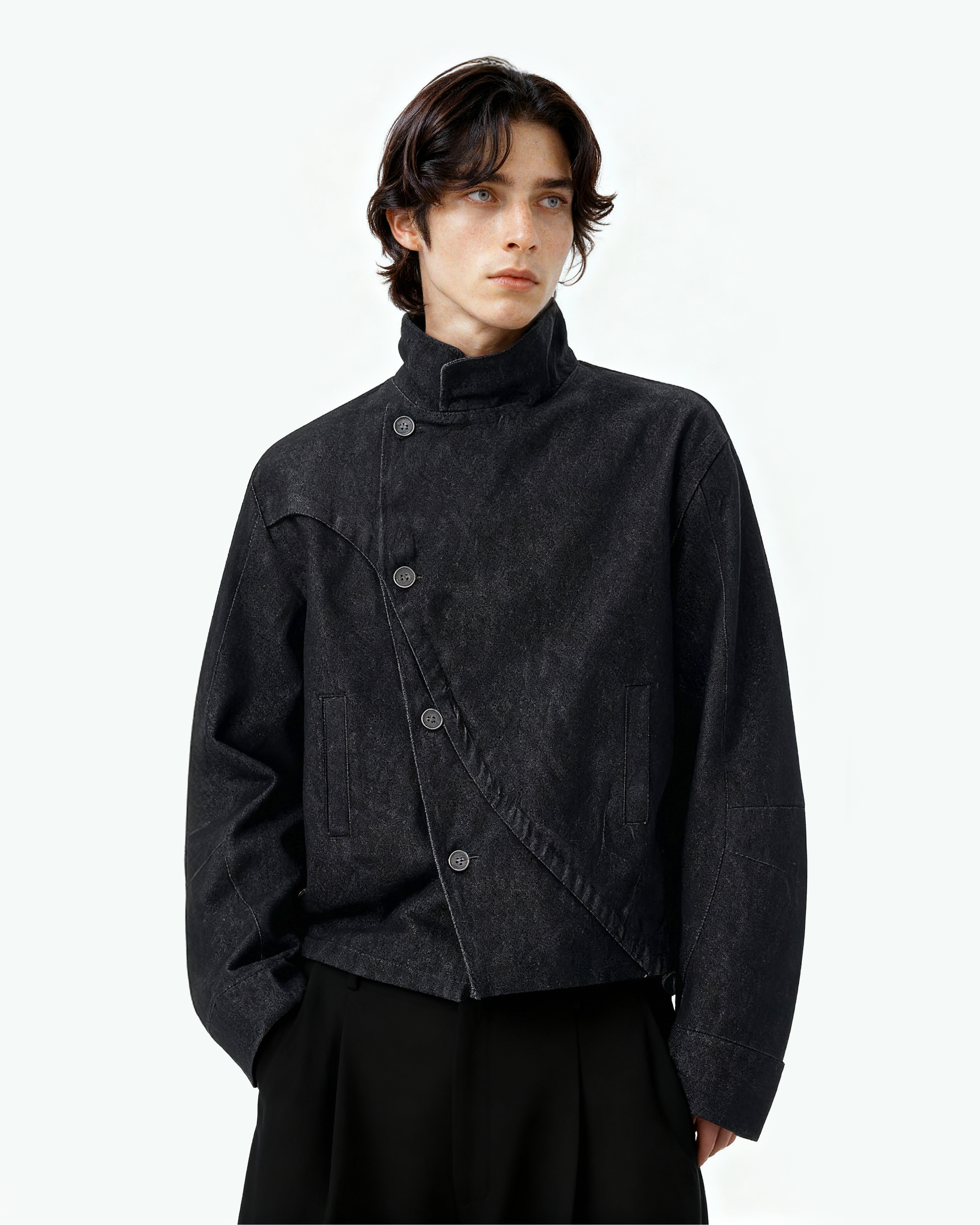 Overlap Asymmetric Button Stand Collar Denim Jacket