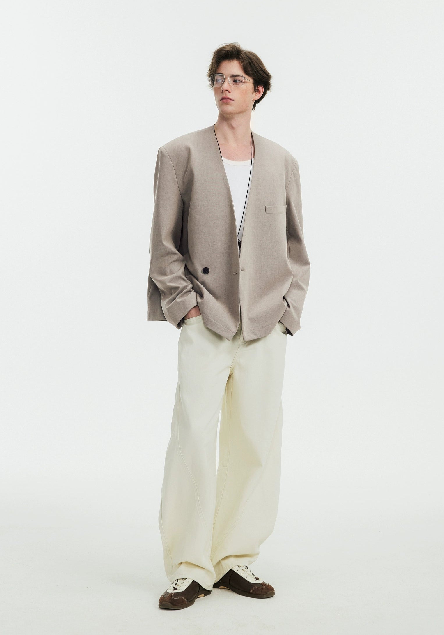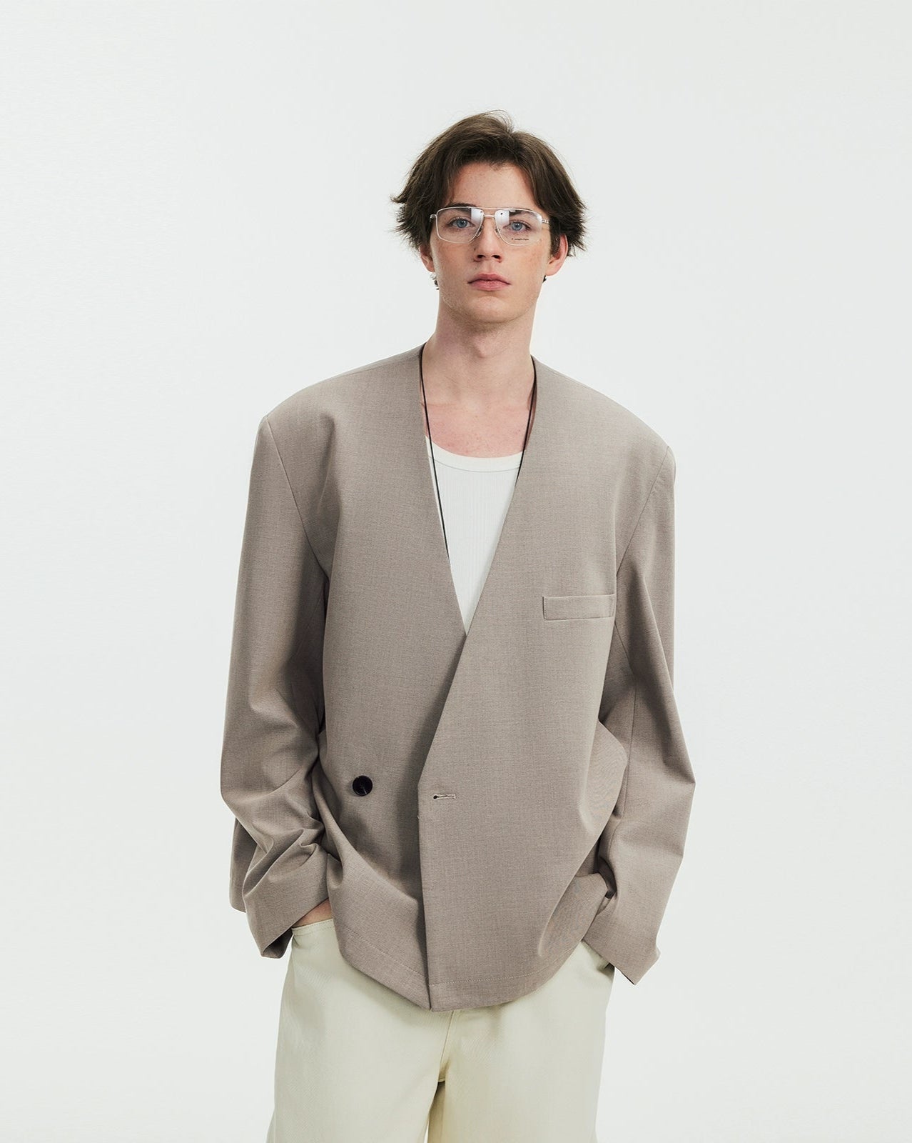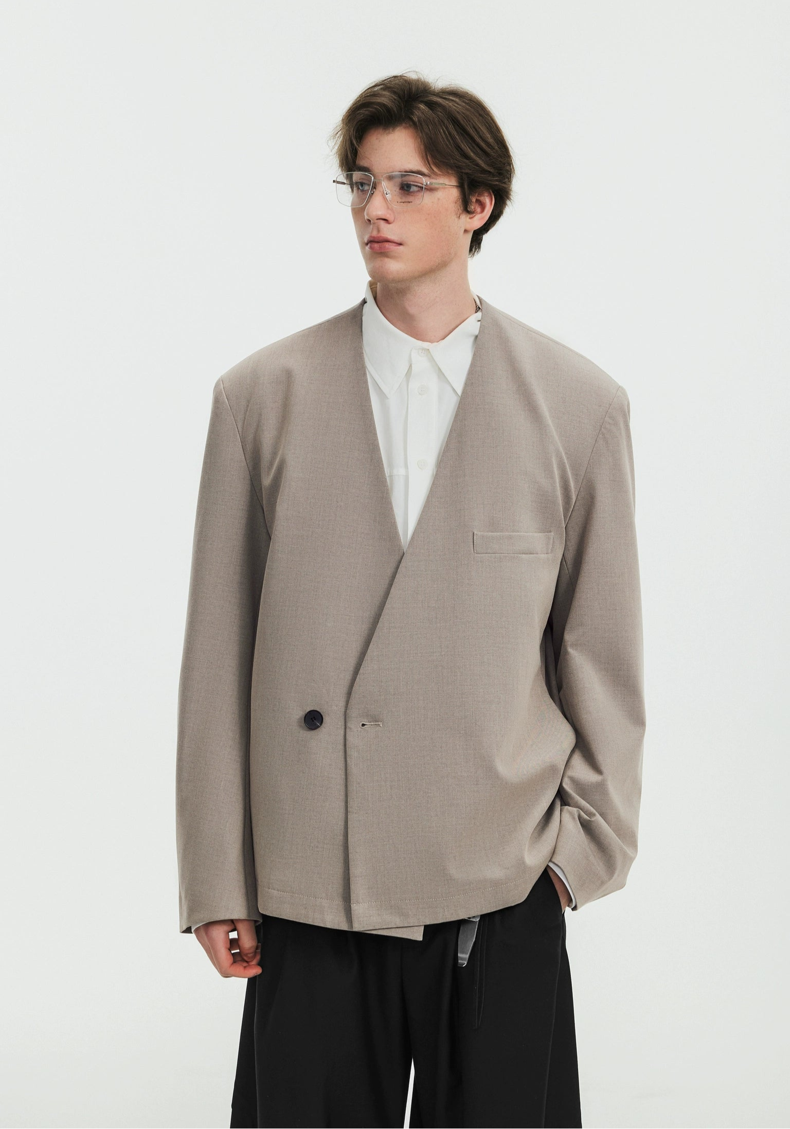 Crafted from a high-quality TR suit fabric blend, this wrap blazer features a smooth, slightly elastic texture that feels polished yet effortless. The collarless design and asymmetrical front closure bring a subtle edge, while the soft drape and loose drop-shoulder fit balance ease with intention. It's a minimal piece that makes a statement through shape, not flash.