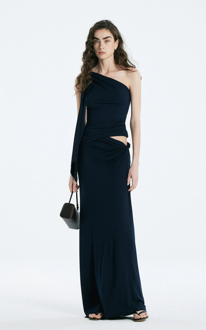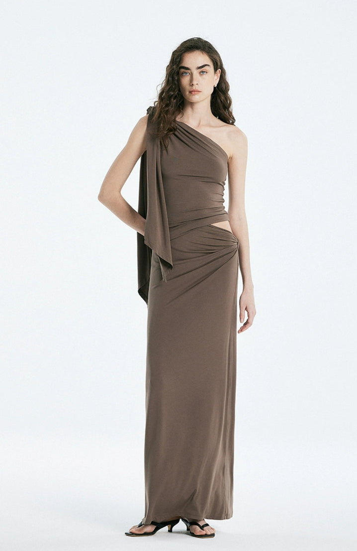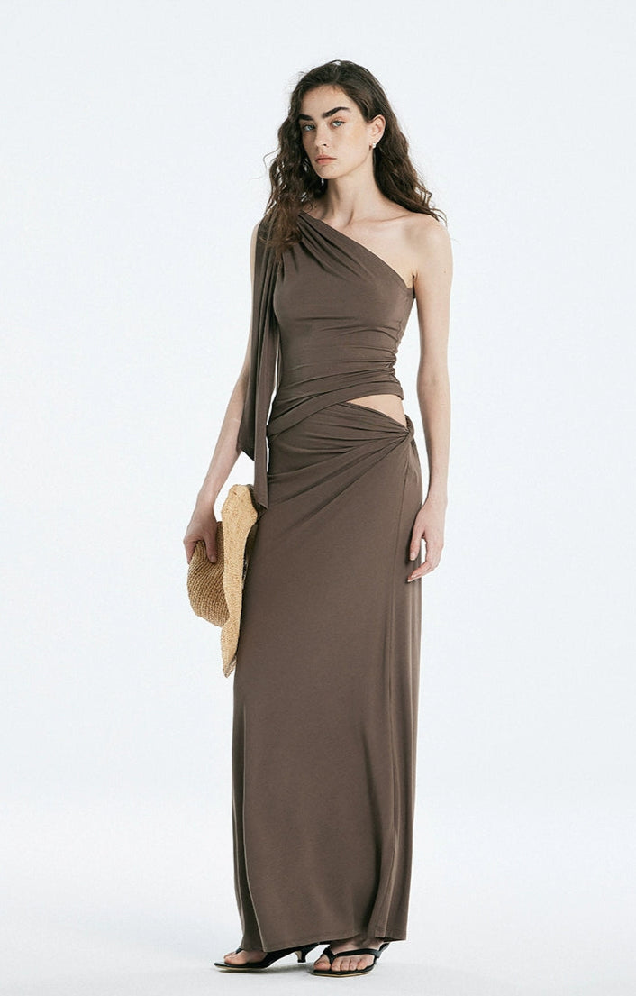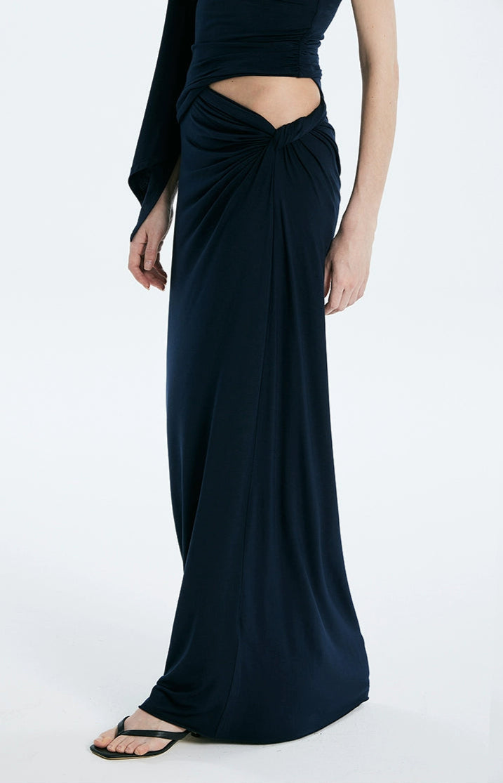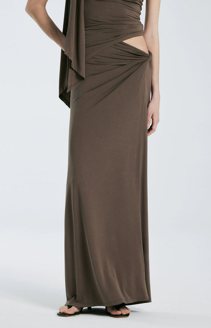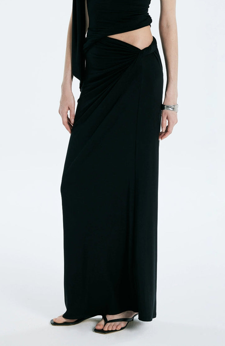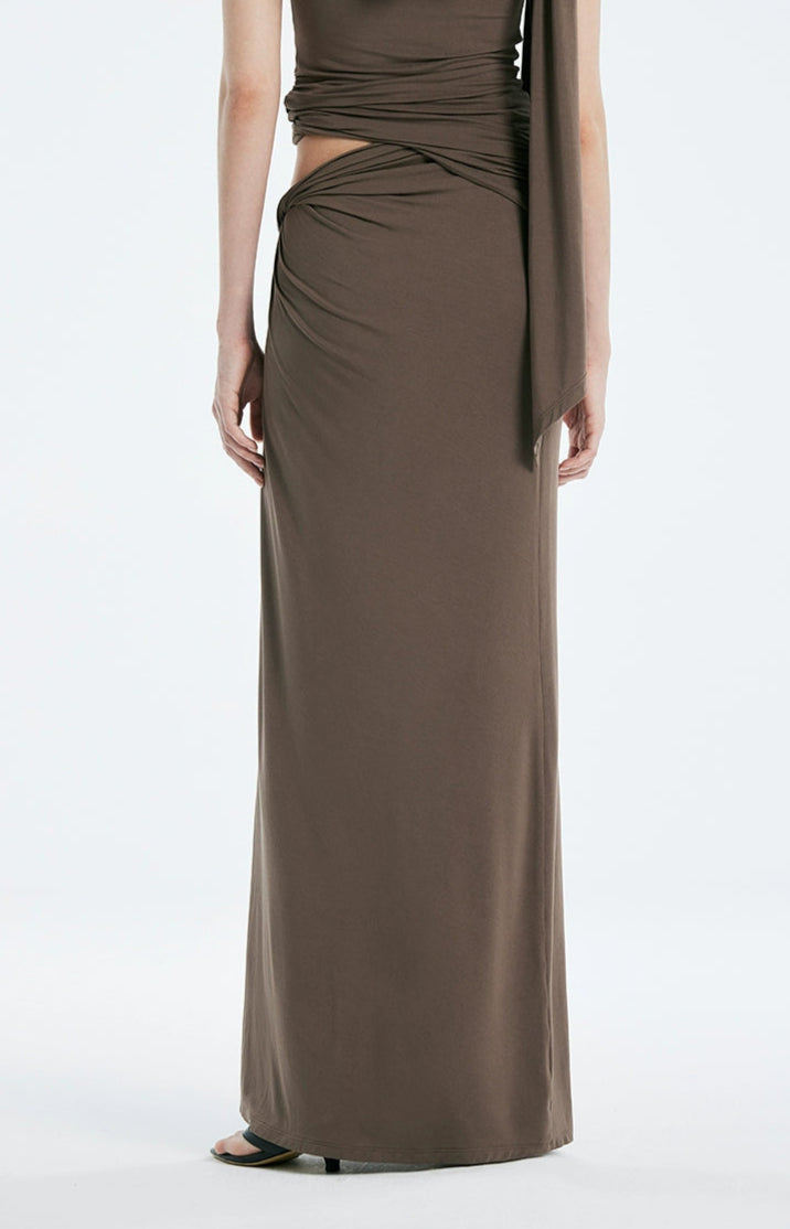 Asymmetric Drape One Shoulder Top and Gathered Twist Maxi Skirt Two-Piece Set