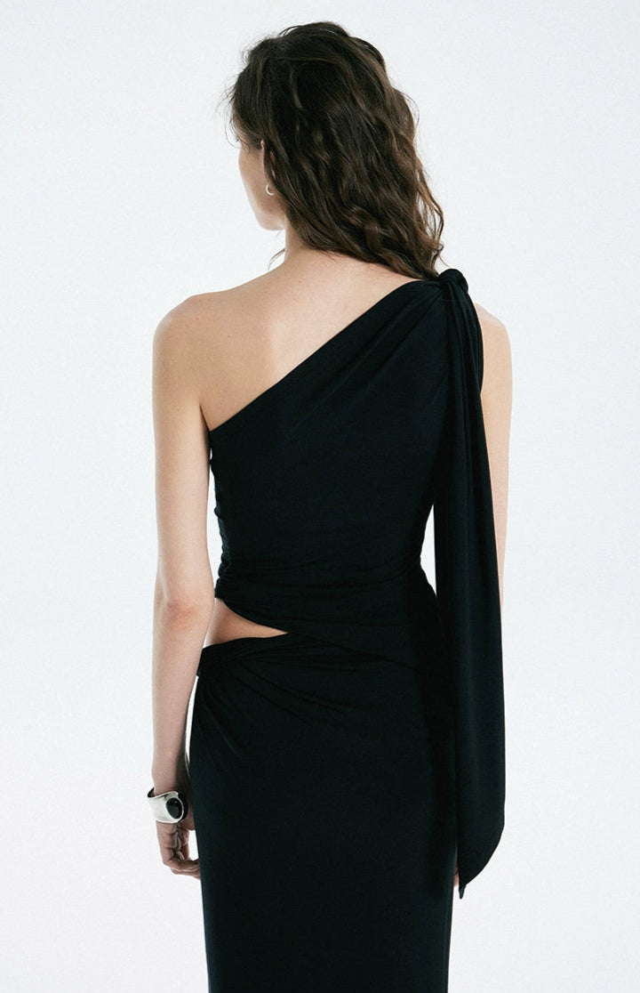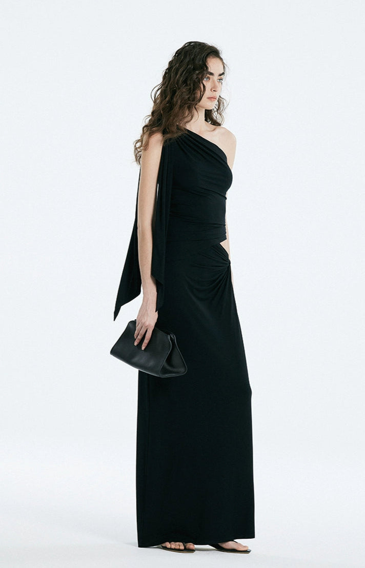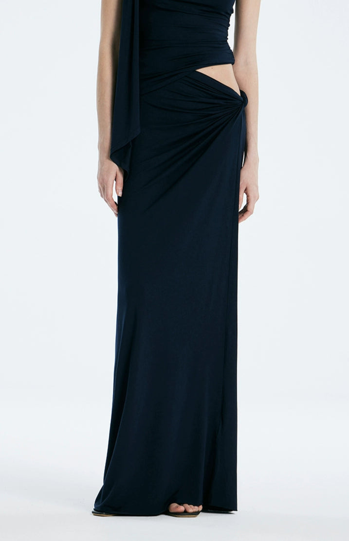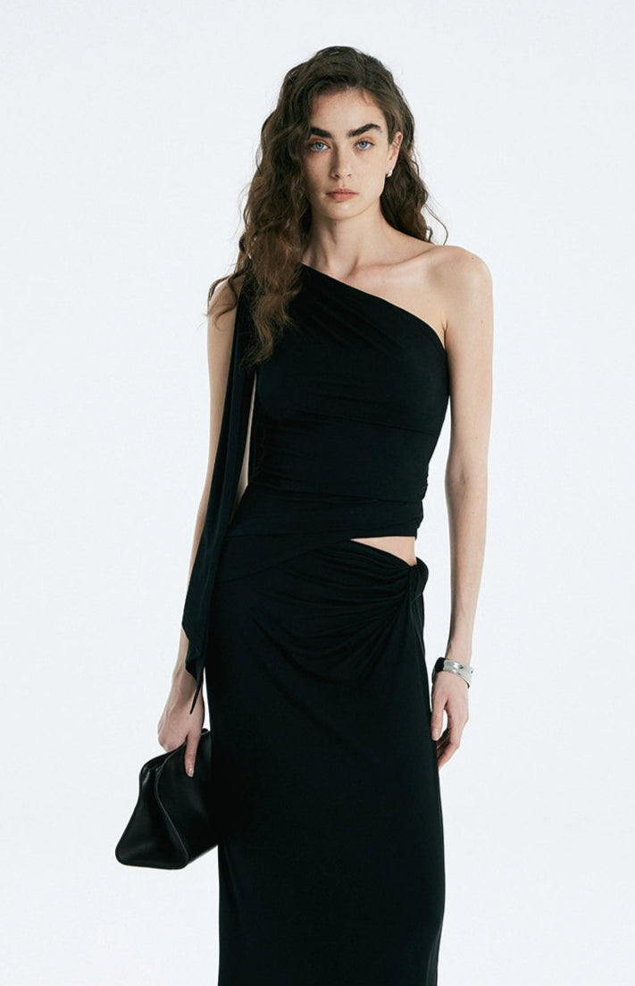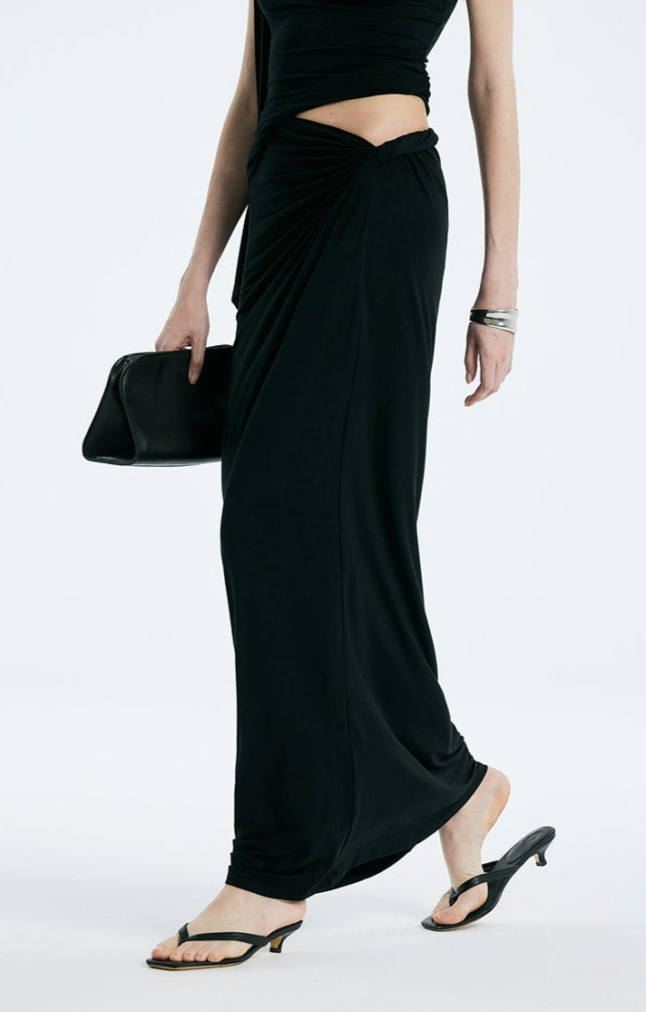 The one-shoulder top features a flowing sash that cascades down the arm, paired with subtle ruching and an organic twist at the waist that sculpt the body without constraining it. The matching knit maxi skirt is cut with a relaxed straight silhouette and completes the look with an off-center gathered twist that flatters the waist and adds dimension. The soft, high-stretch modal-spandex blend feels cool against the skin, moves fluidly, and maintains its shape without wrinkling. Draped but grounded, this set offers refined structure with zero stiffness.
