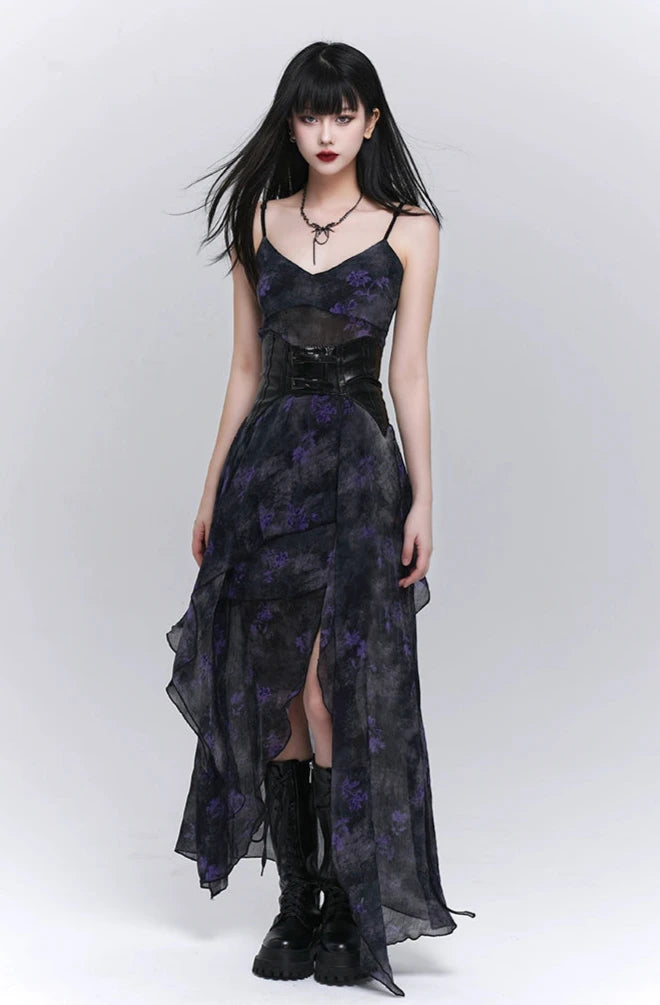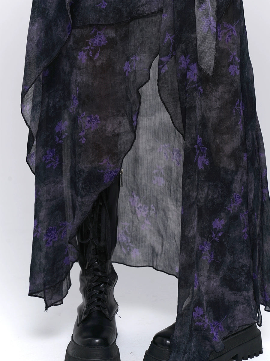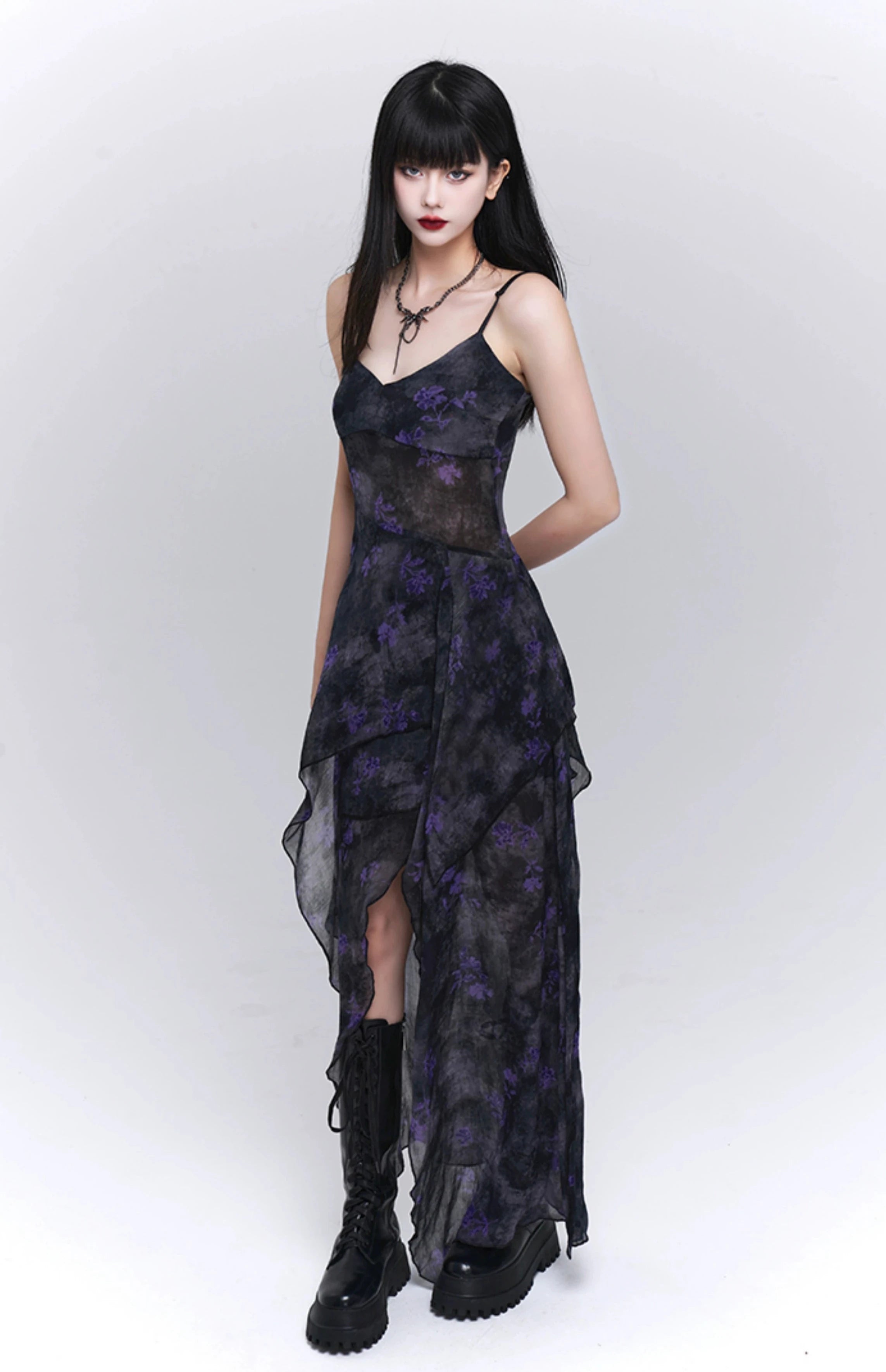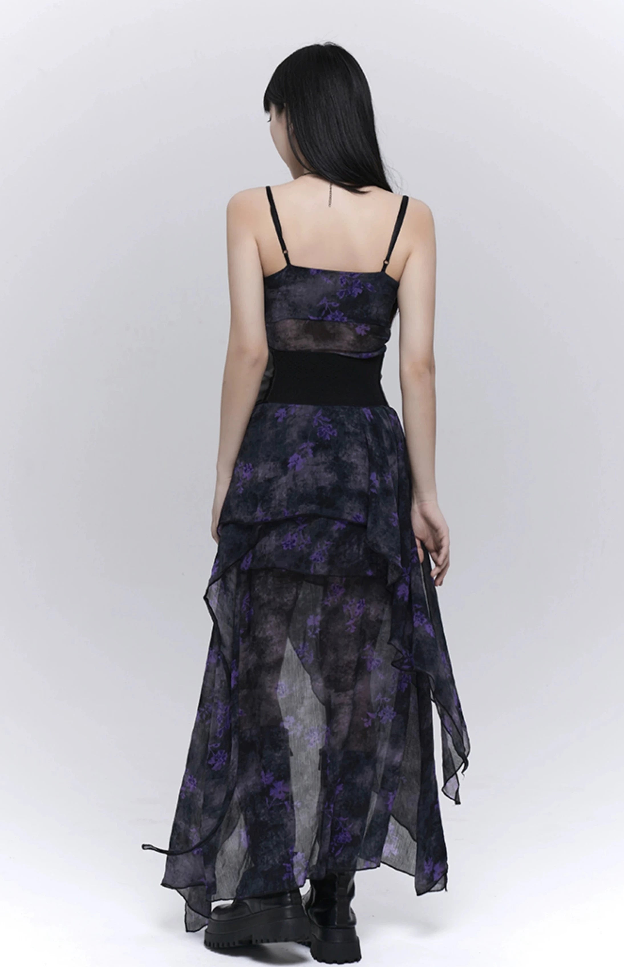 Read full Return PolicyMake a statement in the Asymmetric Hem Floral Sheer Overlay Dress, where edgy meets elegance.