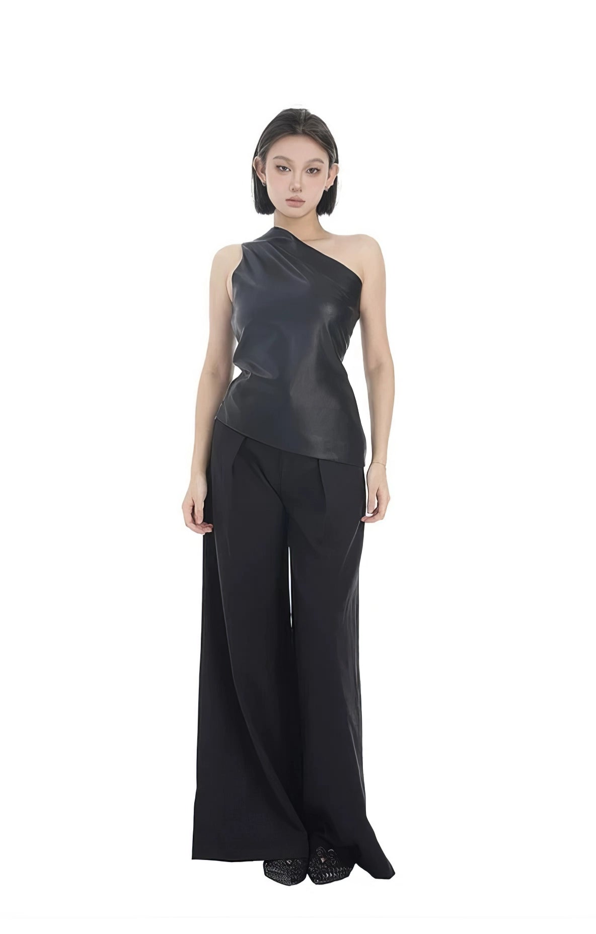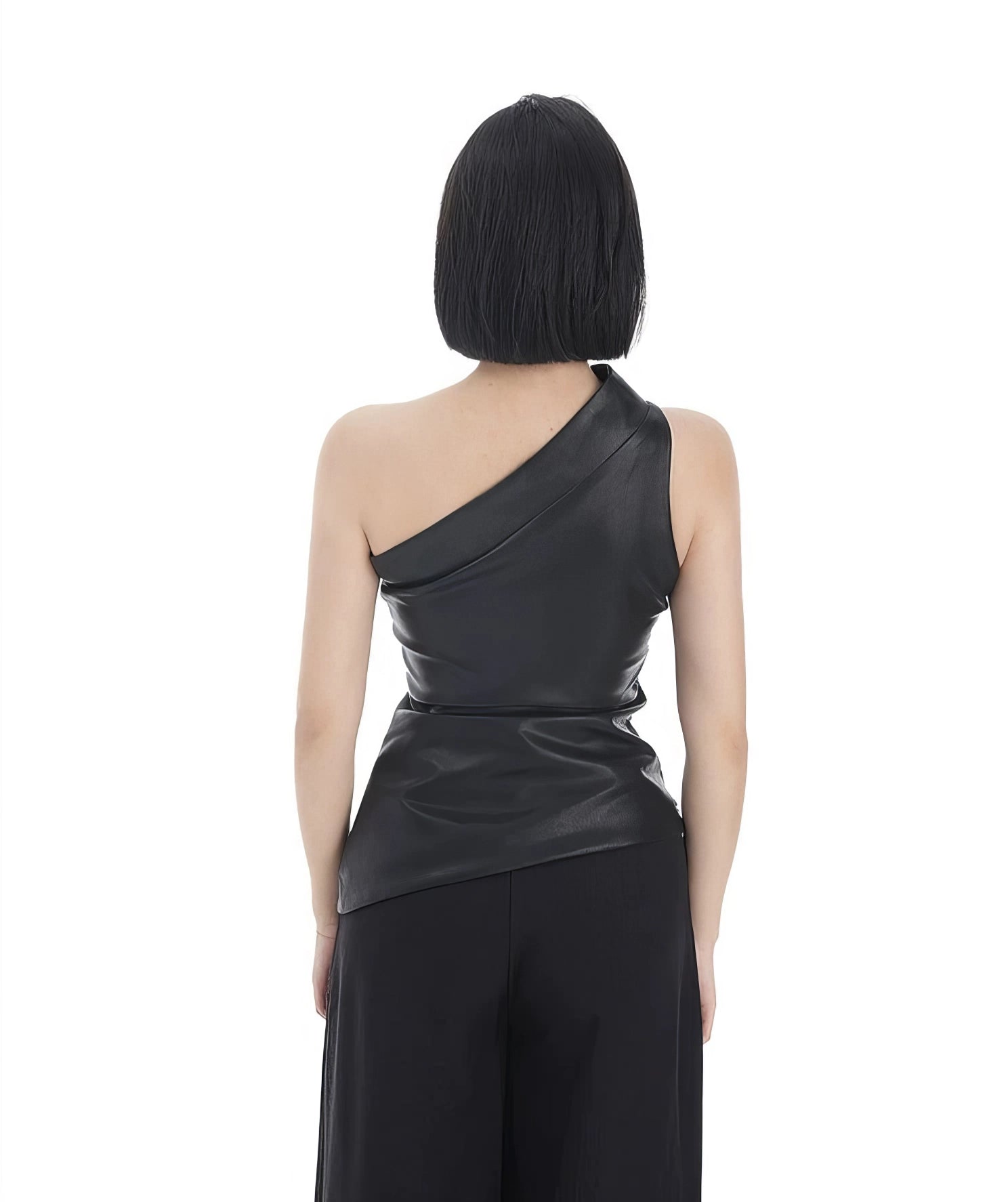Crafted from a blend of premium materials, this top features a sleek one-shoulder design with a subtle sheen that elevates its solid black hue. The slim-fit cut flatters the figure, while the high-quality faux leather offers durability and a touch of street-inspired edge.