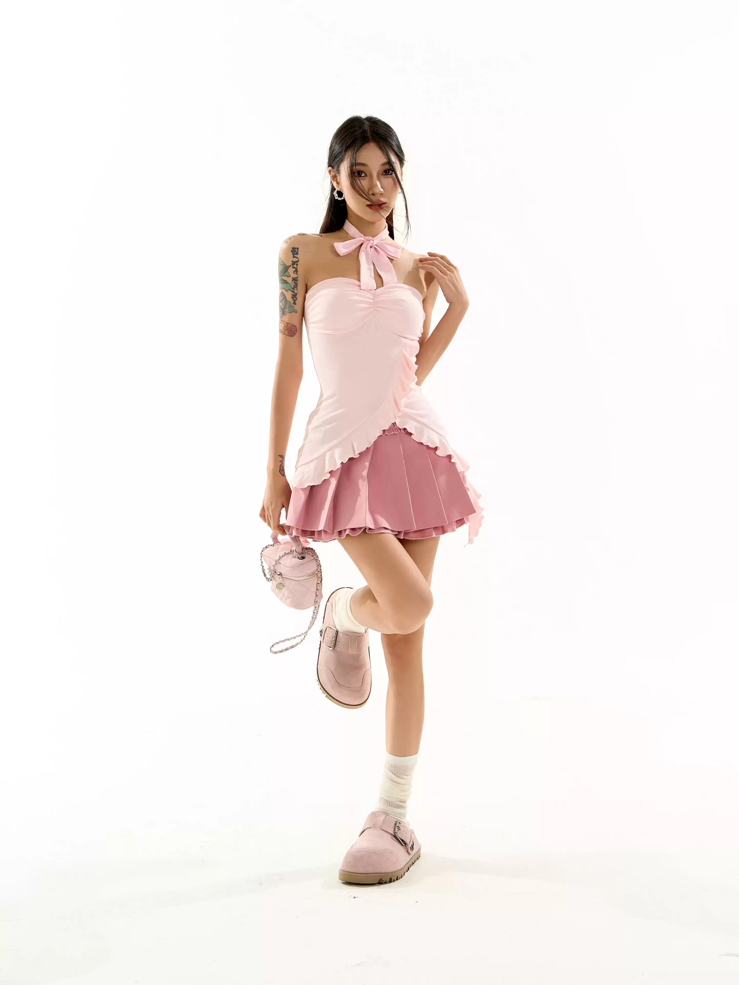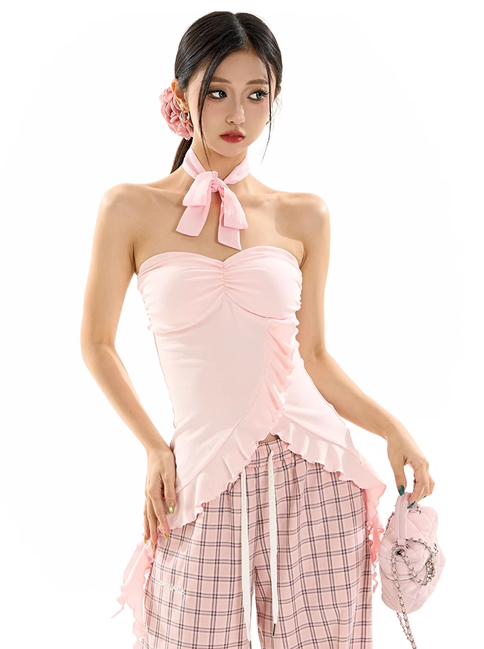 Asymmetric Ruffle Trim Tube Top with Bow Choker Detail