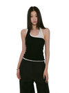 With its edge-cut neckline and mock layered design, it offers a sharp alternative to your go-to basics. Made from a soft, ribbed knit with a slight stretch, the top hugs comfortably without feeling too tight. The asymmetrical stitching gives it structure and visual impact, while the mock halter neckline adds a subtle throwback flair.