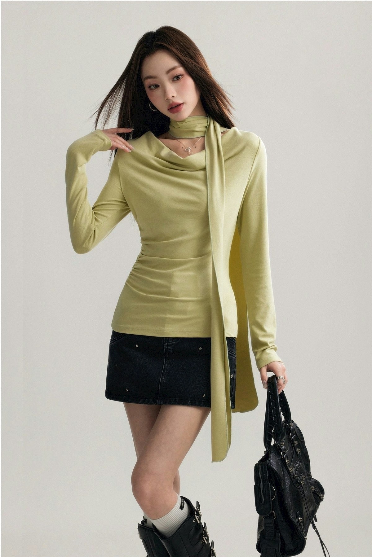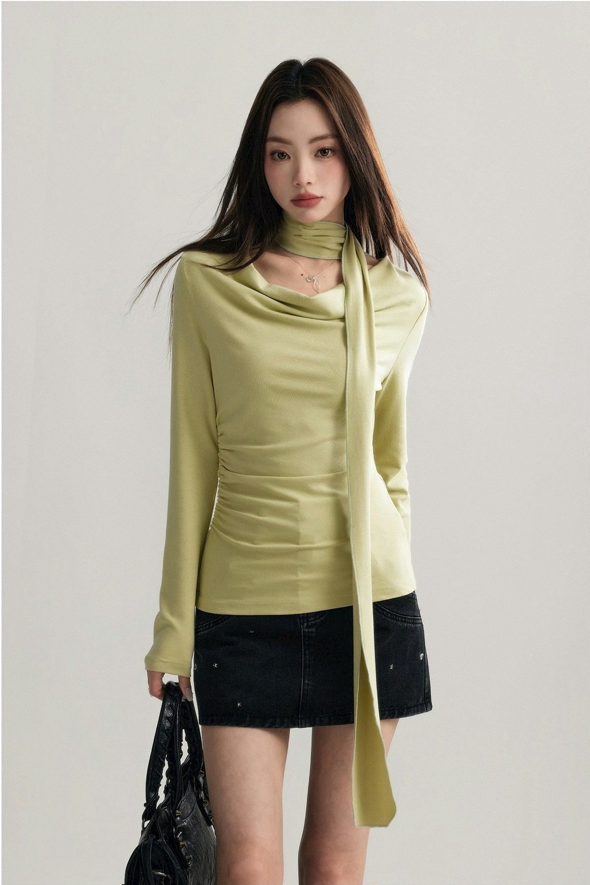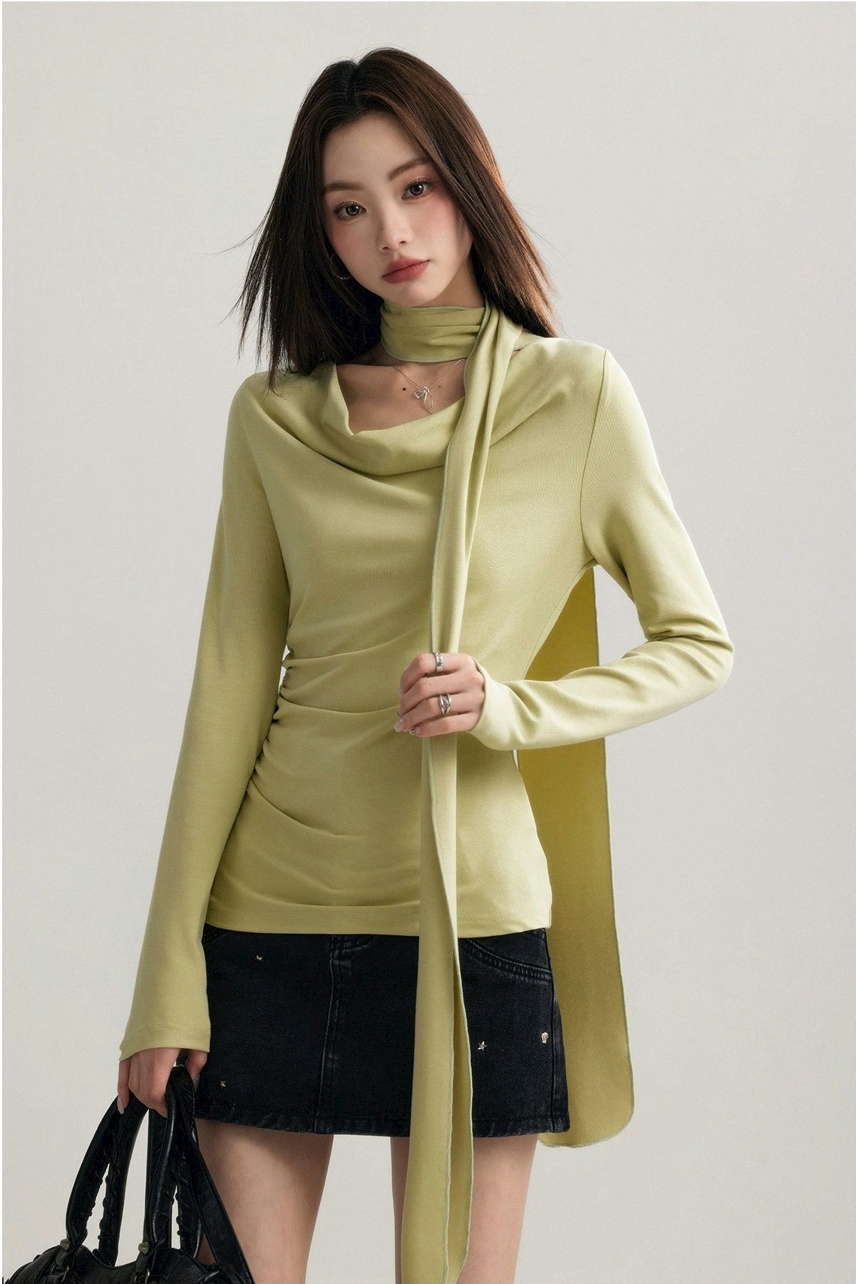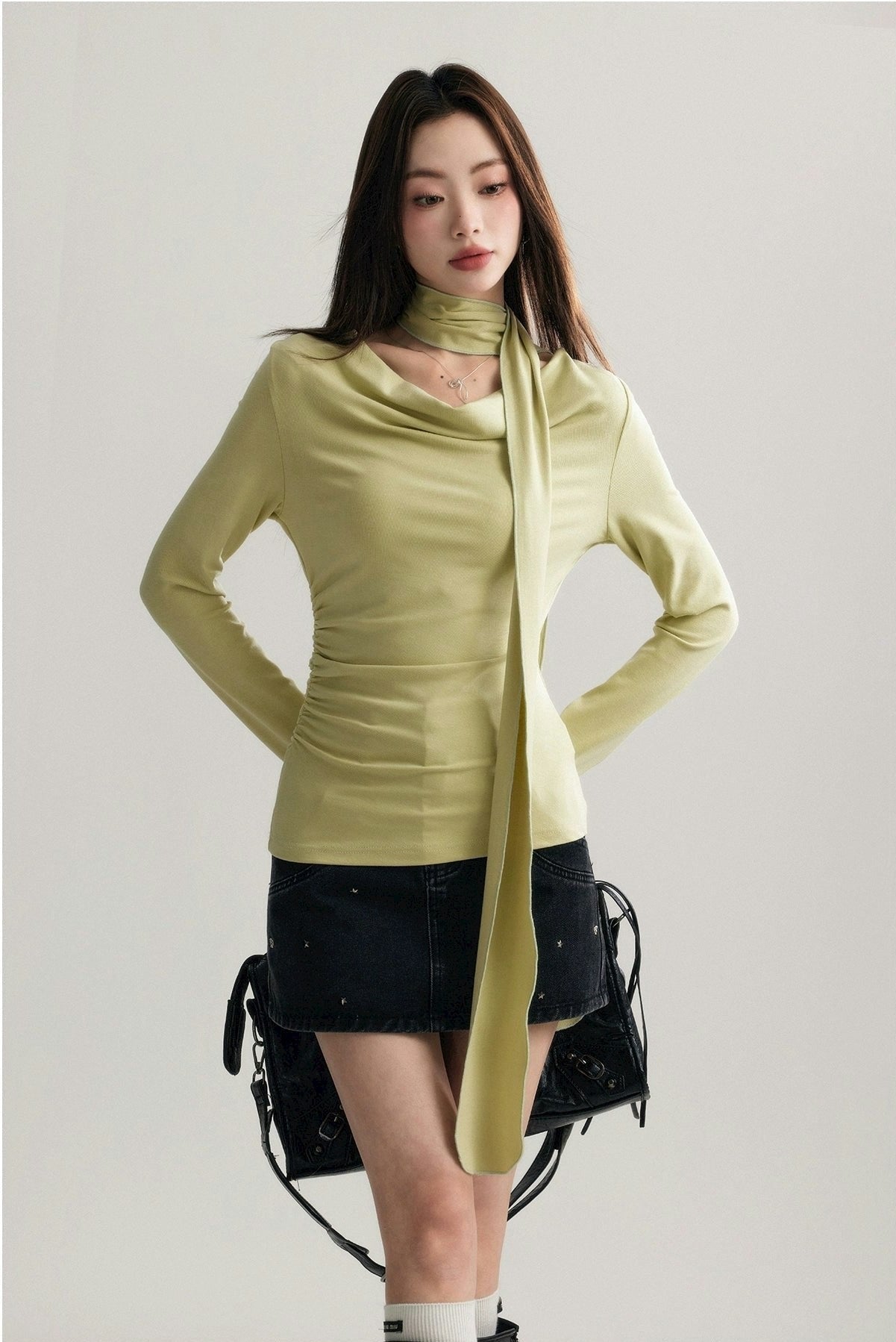 Expertly crafted from a blend of 92% cotton and 8% spandex, this top promises both comfort and a flattering fit. Its unique draped neckline and form-fitting silhouette are accentuated by a stylish scarf that can be styled in multiple ways, ensuring your look is both sophisticated and versatile.