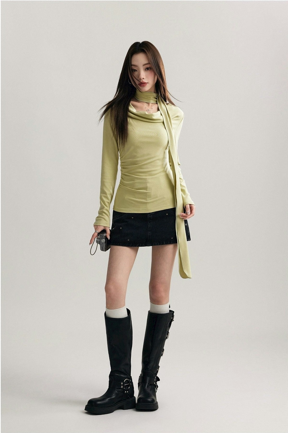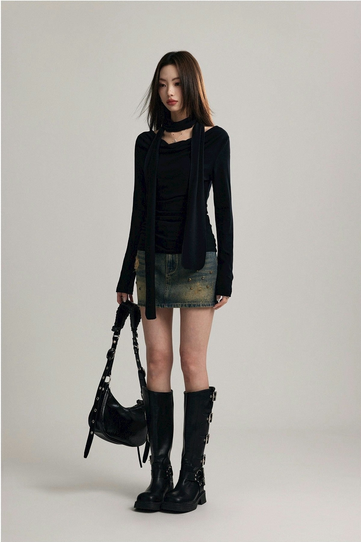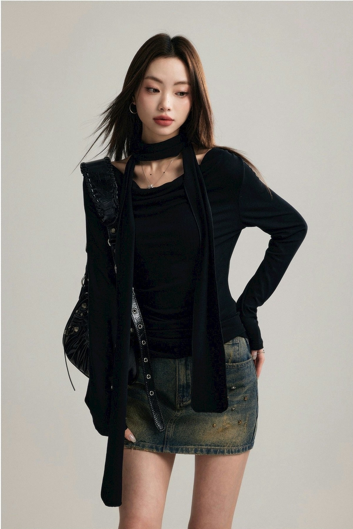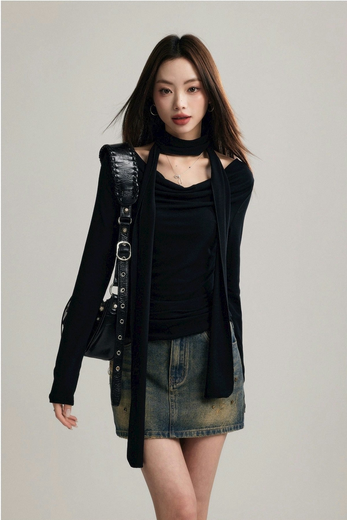 Expertly crafted from a blend of 92% cotton and 8% spandex, this top promises both comfort and a flattering fit. Its unique draped neckline and form-fitting silhouette are accentuated by a stylish scarf that can be styled in multiple ways, ensuring your look is both sophisticated and versatile.