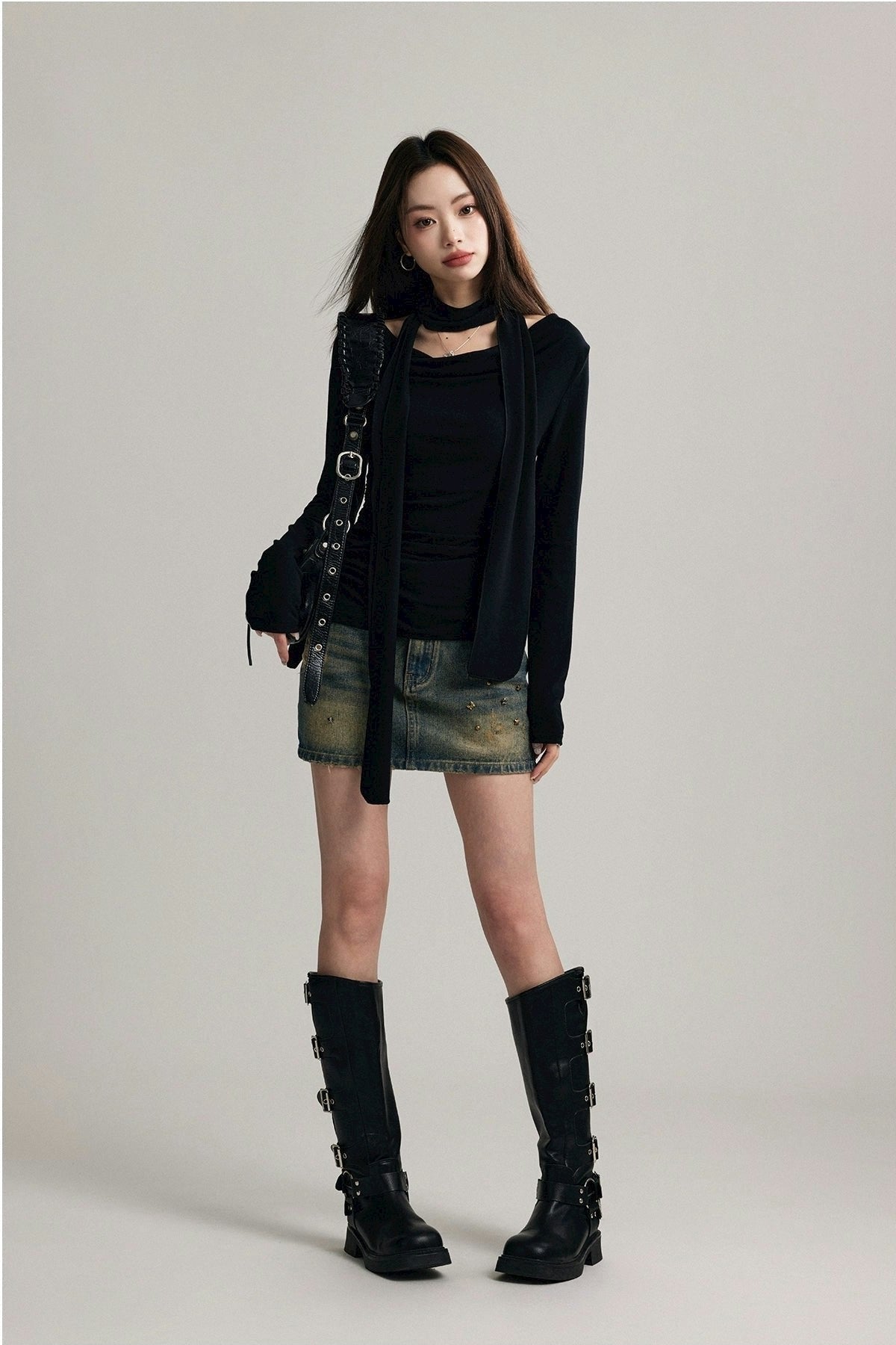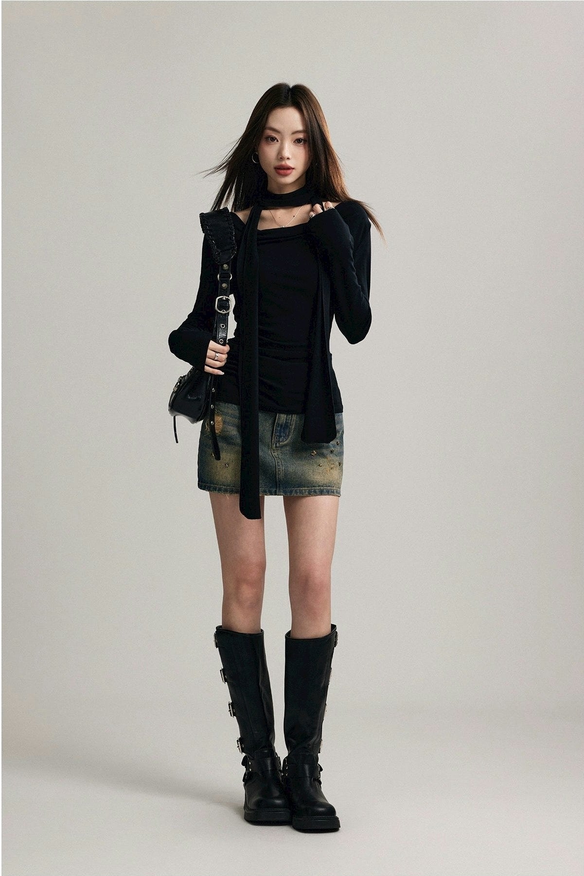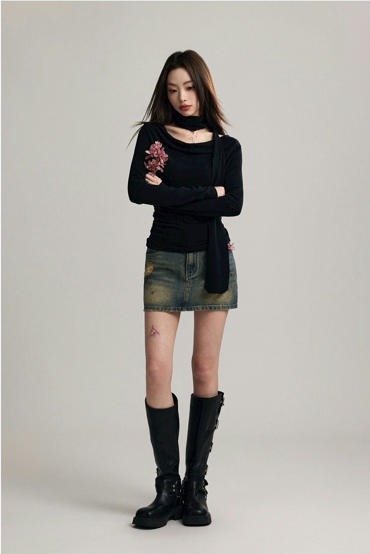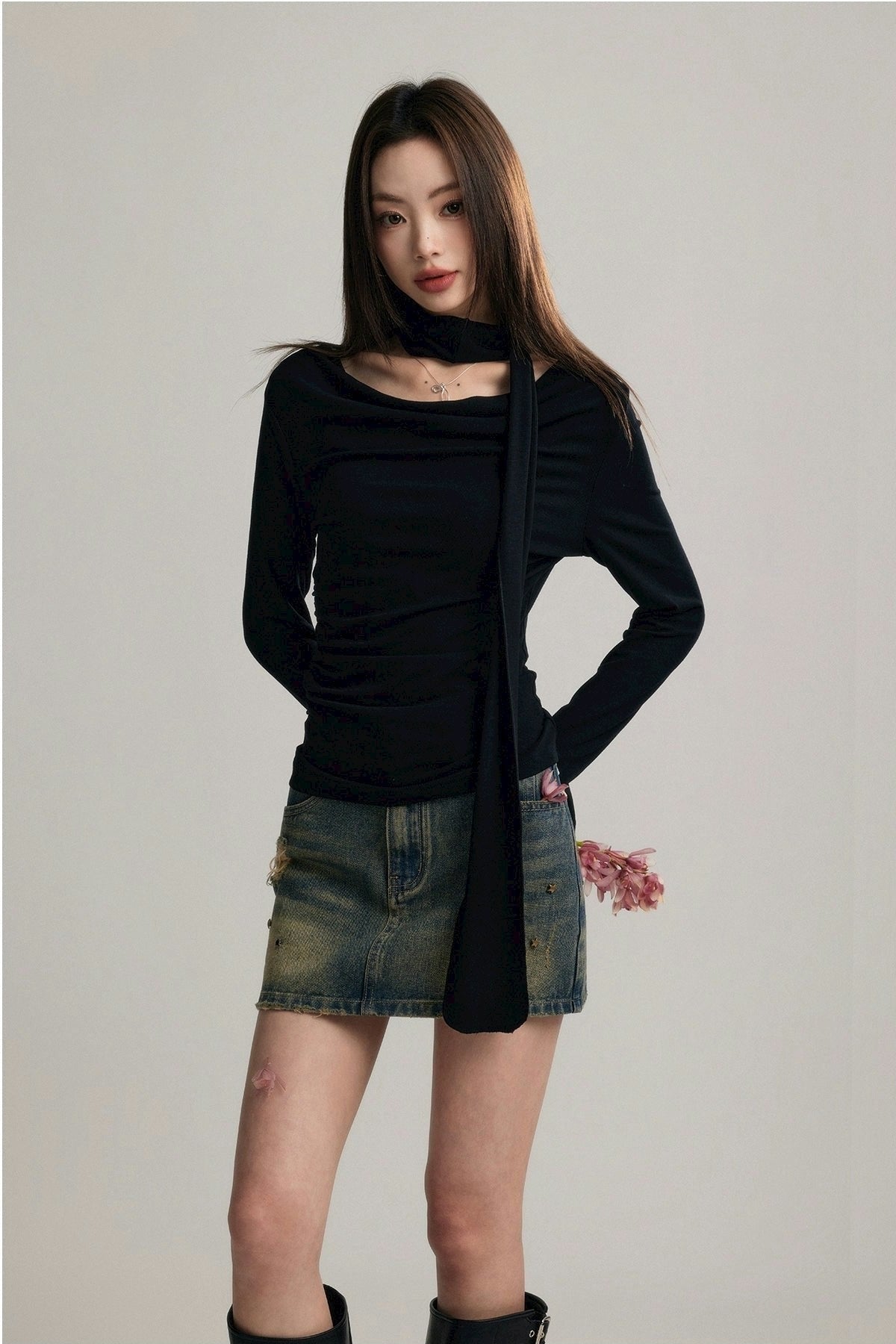 Expertly crafted from a blend of 92% cotton and 8% spandex, this top promises both comfort and a flattering fit. Its unique draped neckline and form-fitting silhouette are accentuated by a stylish scarf that can be styled in multiple ways, ensuring your look is both sophisticated and versatile.