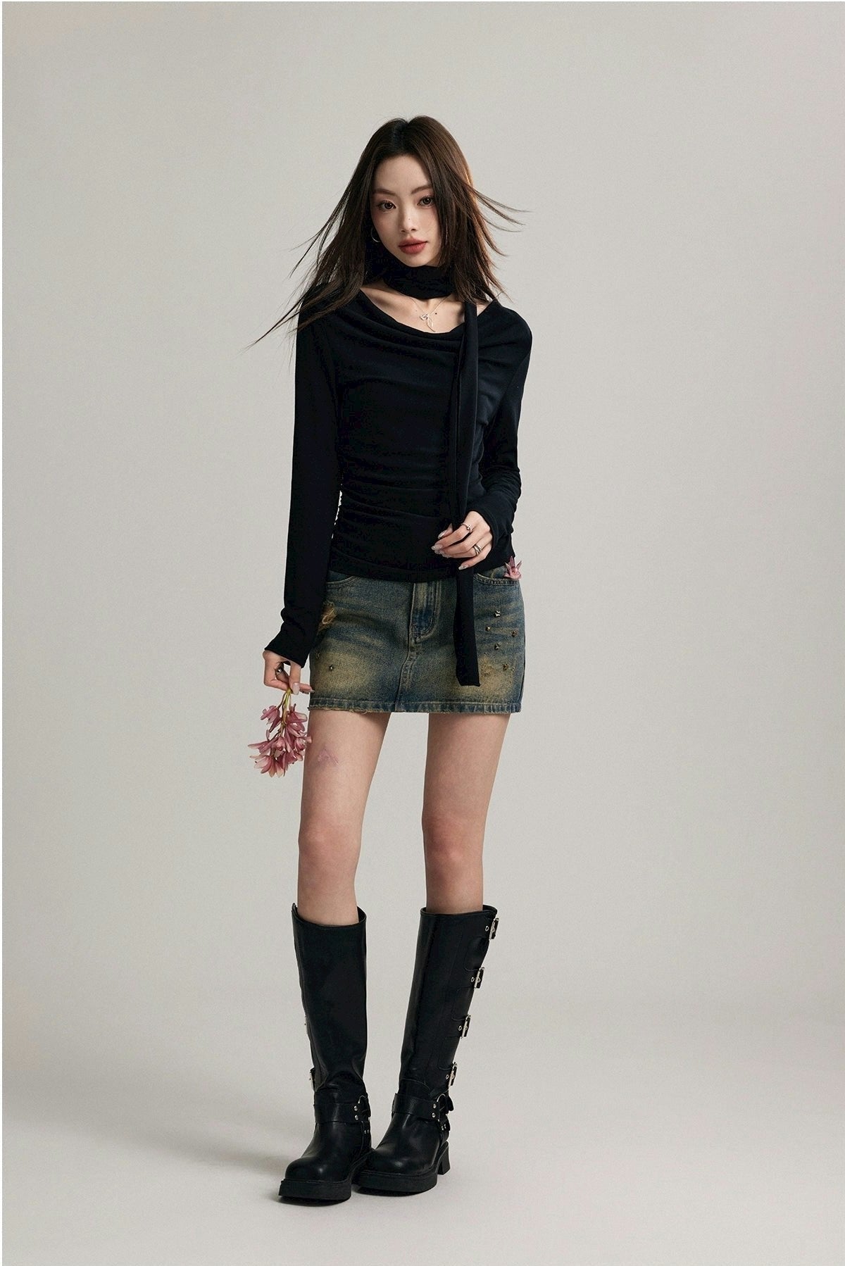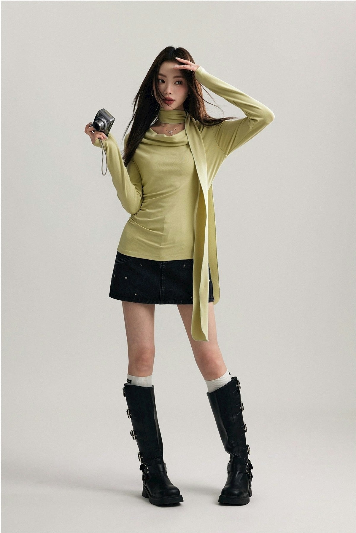 Read full Return PolicySet the scene with our Asymmetrical Draped Neckline Long Sleeve Top with Scarf, a chic statement piece perfect for any occasion.