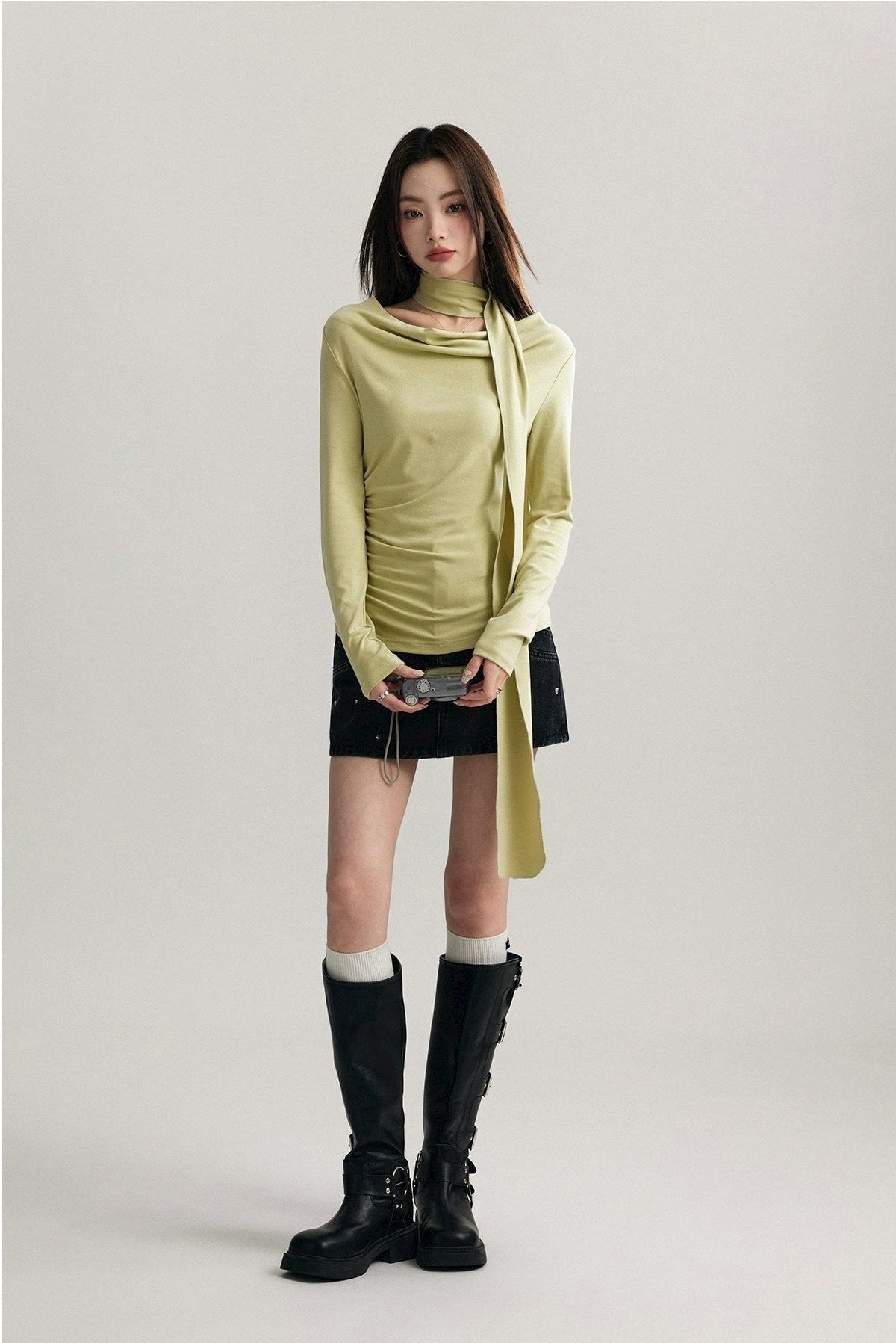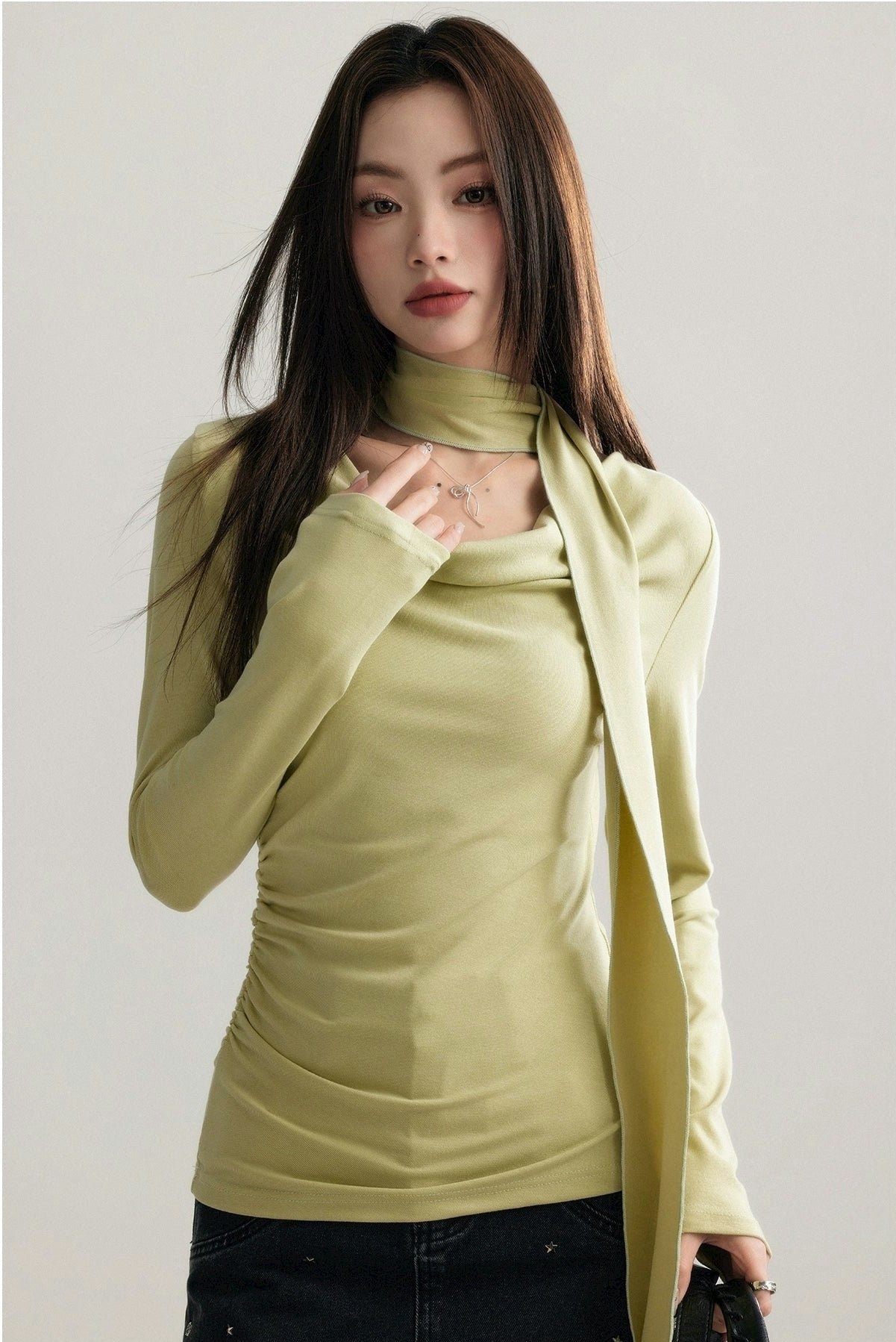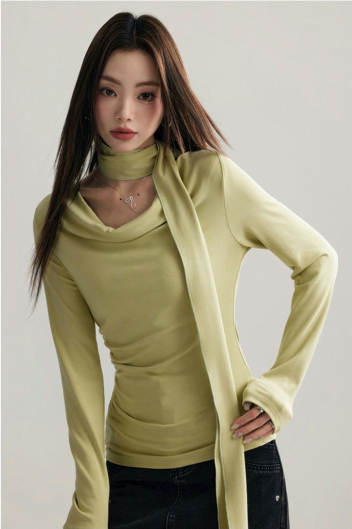 Asymmetrical Draped Neckline Long Sleeve Top with Scarf