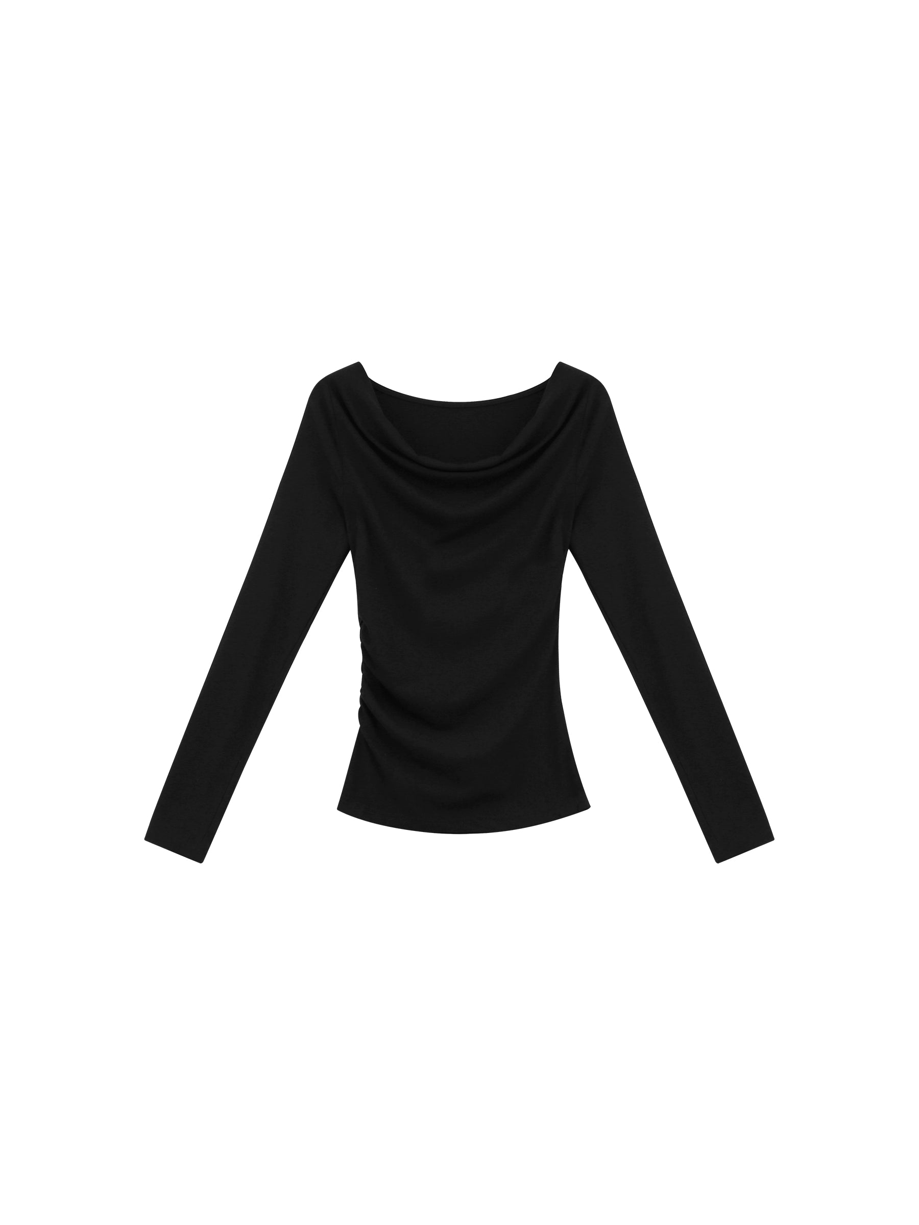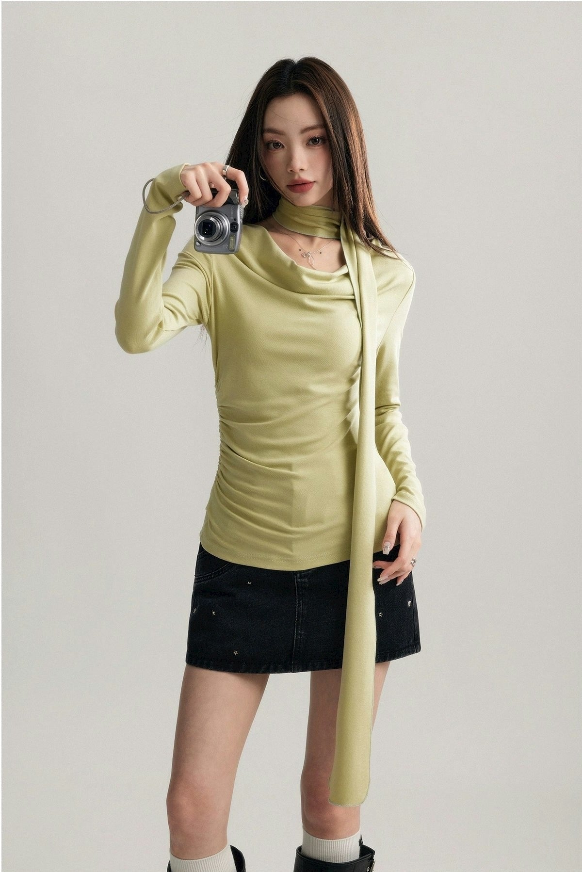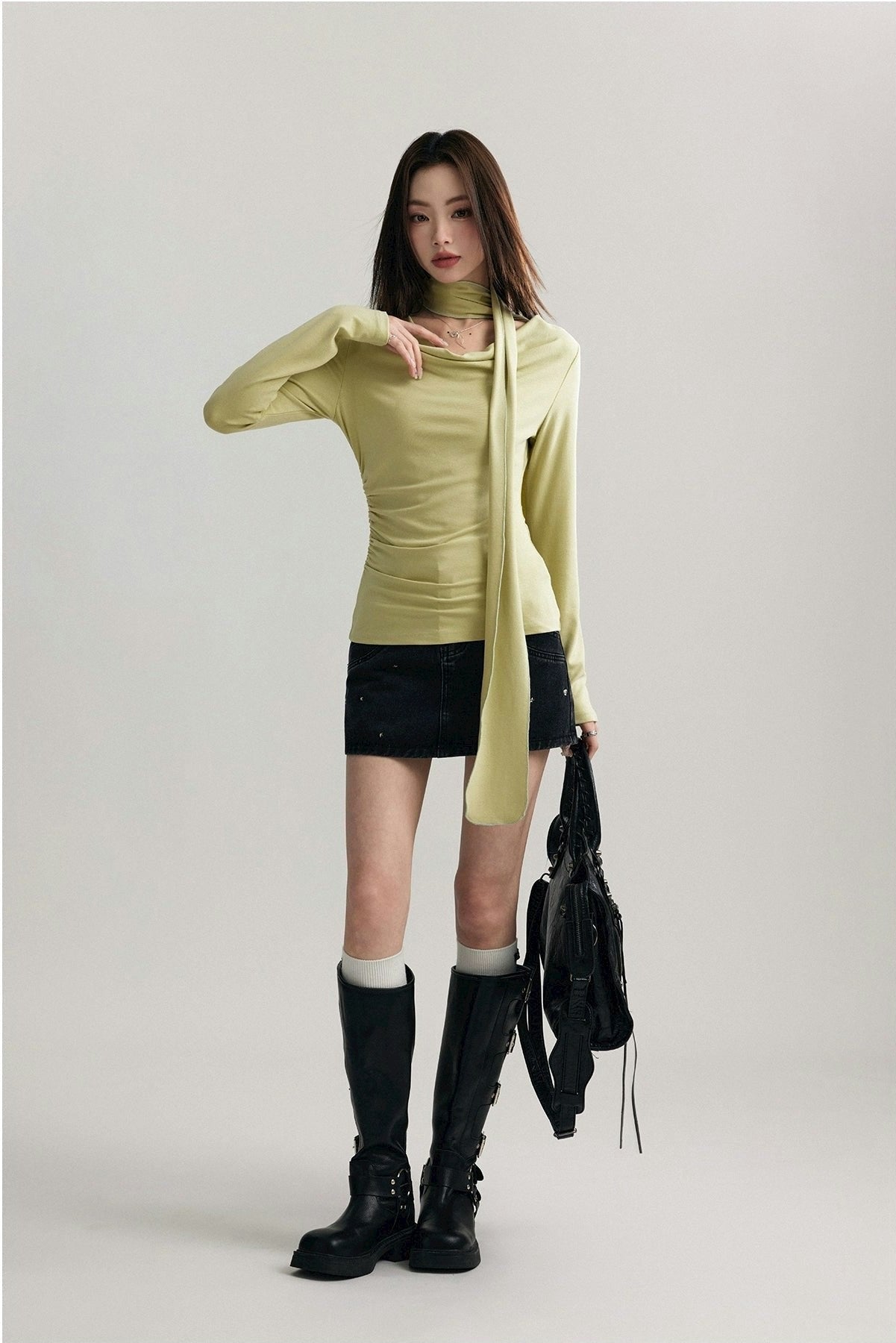 Asymmetrical Draped Neckline Long Sleeve Top with Scarf