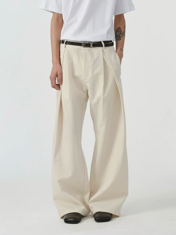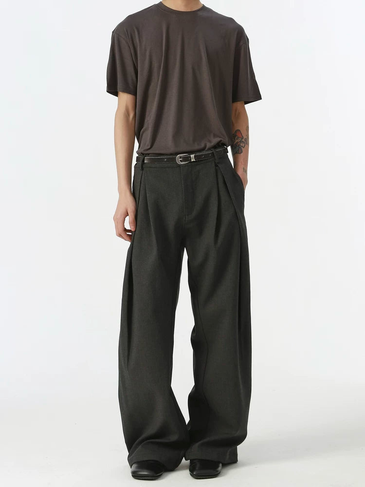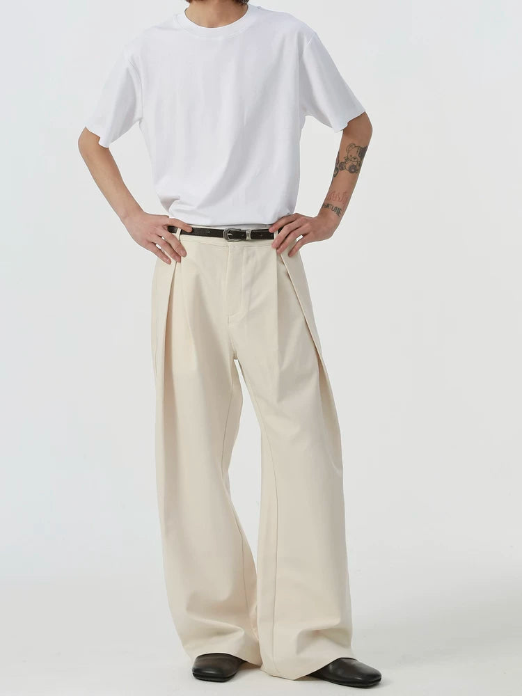 Designed with a sharp A-line drape and structured pleats, these wide-leg pants hold their shape without feeling stiff. Crafted from a subtly lustrous TR blend, the fabric gives off a clean, tailored mood while remaining breathable and lightweight.