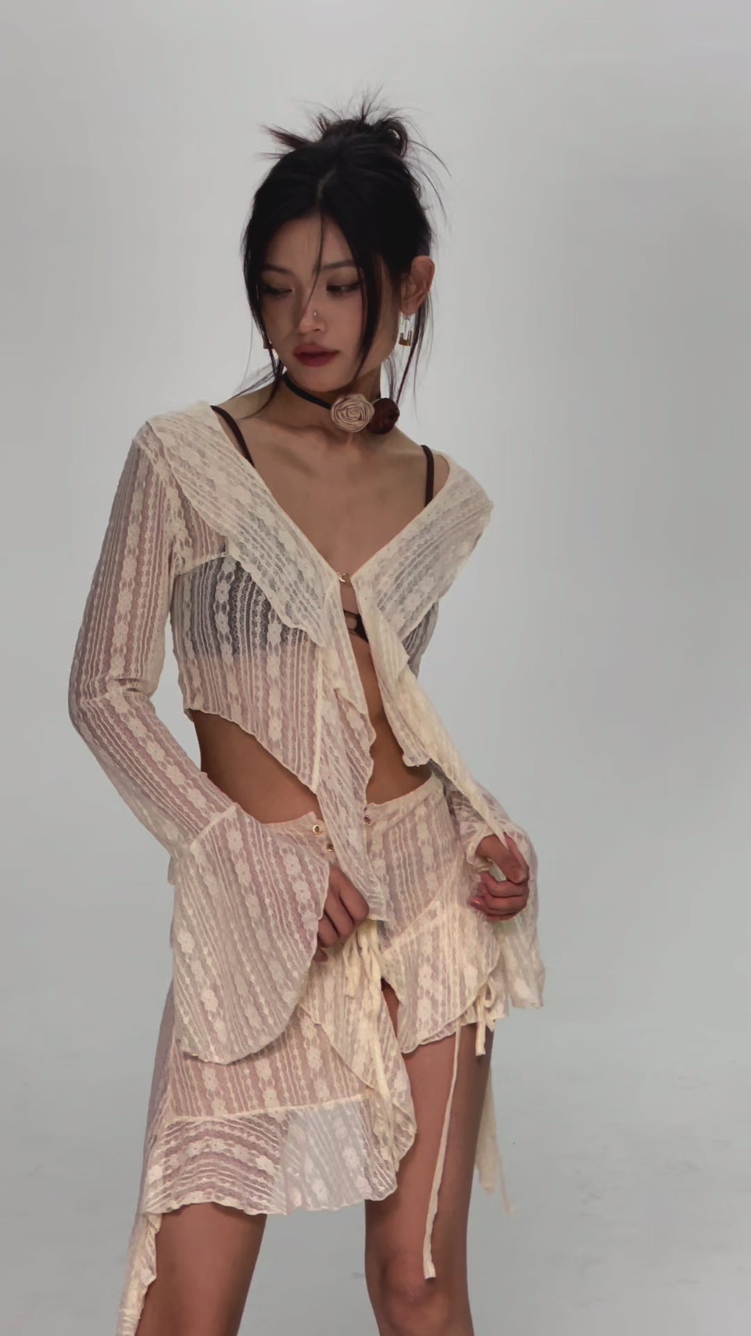 Crafted from soft polyester, this set features a charming V-neckline top adorned with delicate ruffles, accented with a whimsical lace-up design that cinches the waist for a flattering silhouette. The matching skirt, with its irregular ruffle trim, adds a playful and relaxed vibe, promising ease of movement and a touch of romance.