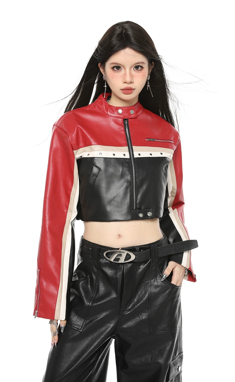 Read full Return PolicyThis faux leather racer jacket is sure to turn heads with its unique color blocking. This boxy cropped style is crafted from super soft faux leather, making it lightweight and comfortable. With its timeless appeal, this jacket will be a go-to for years to come.