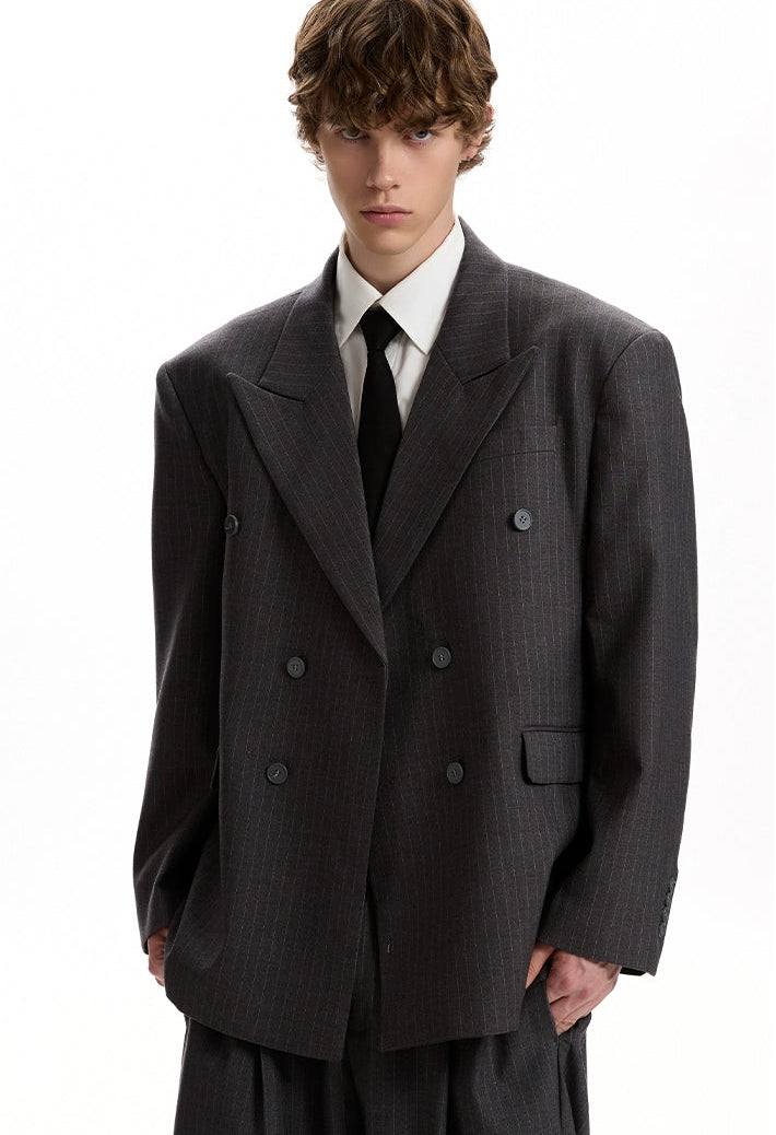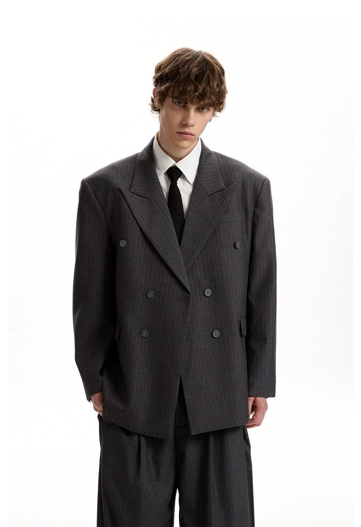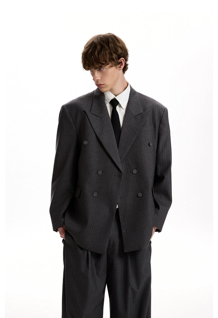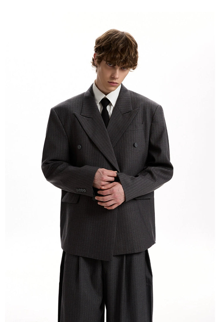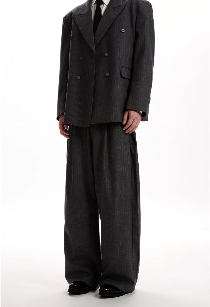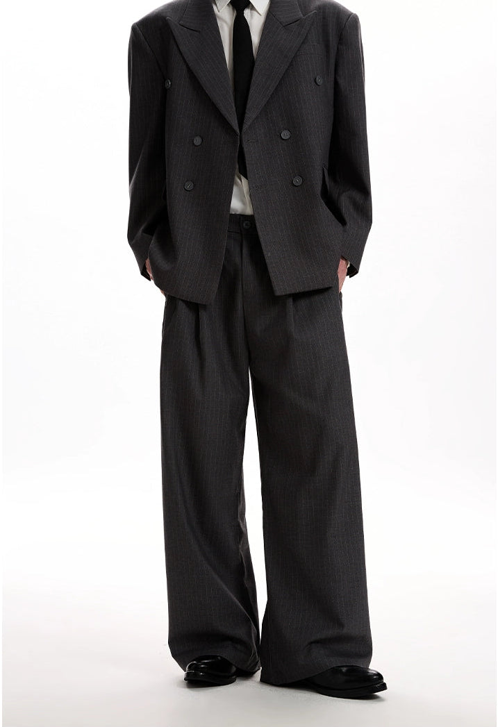 Boxy Double-Breasted Pinstripe Blazer and Wide Leg Pleated Pants Two-Piece Set
