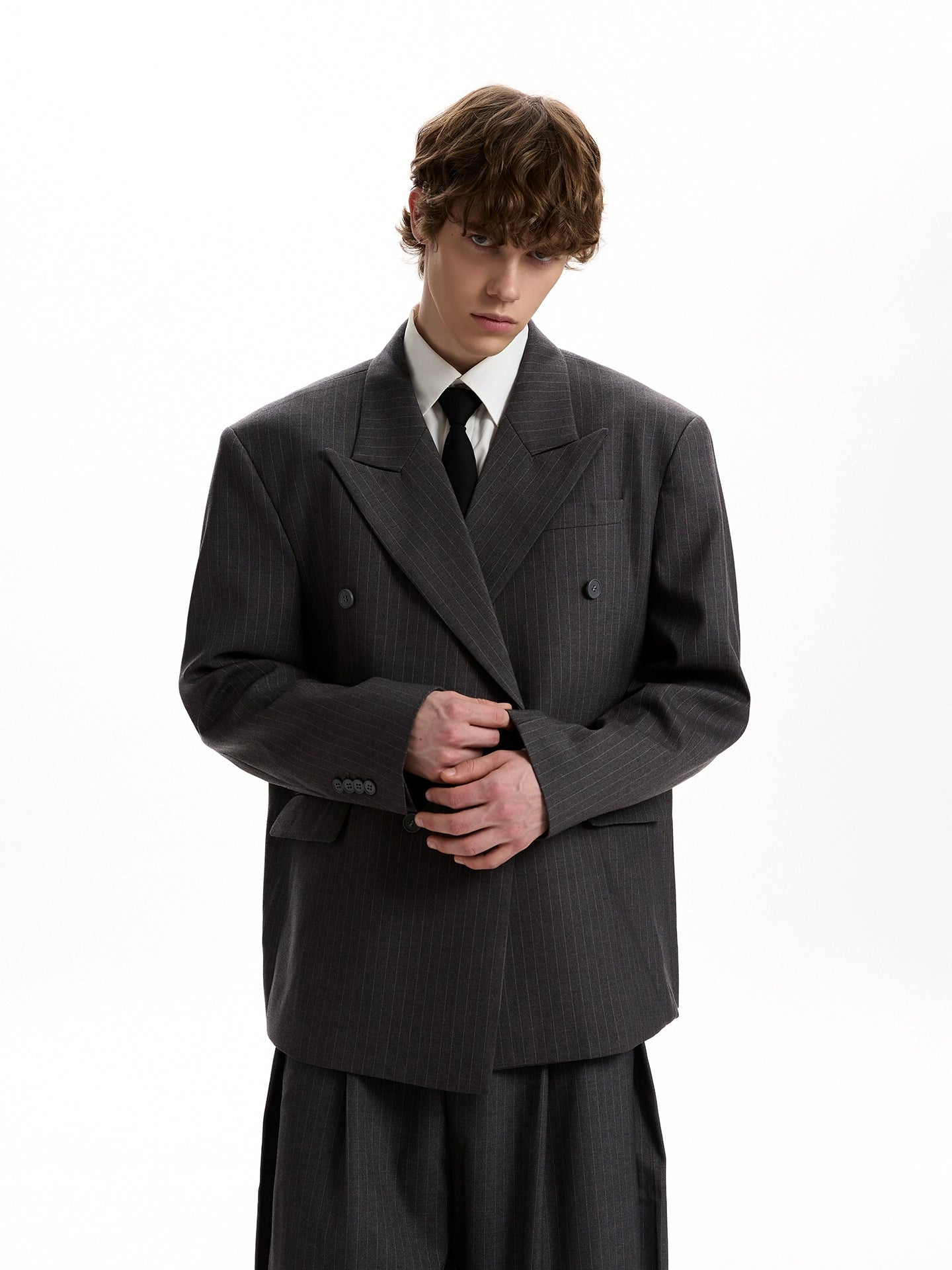 Read full Return PolicyAn oversized silhouette meets understated structure in this double-breasted pinstripe blazer and pleated wide-leg pants set.