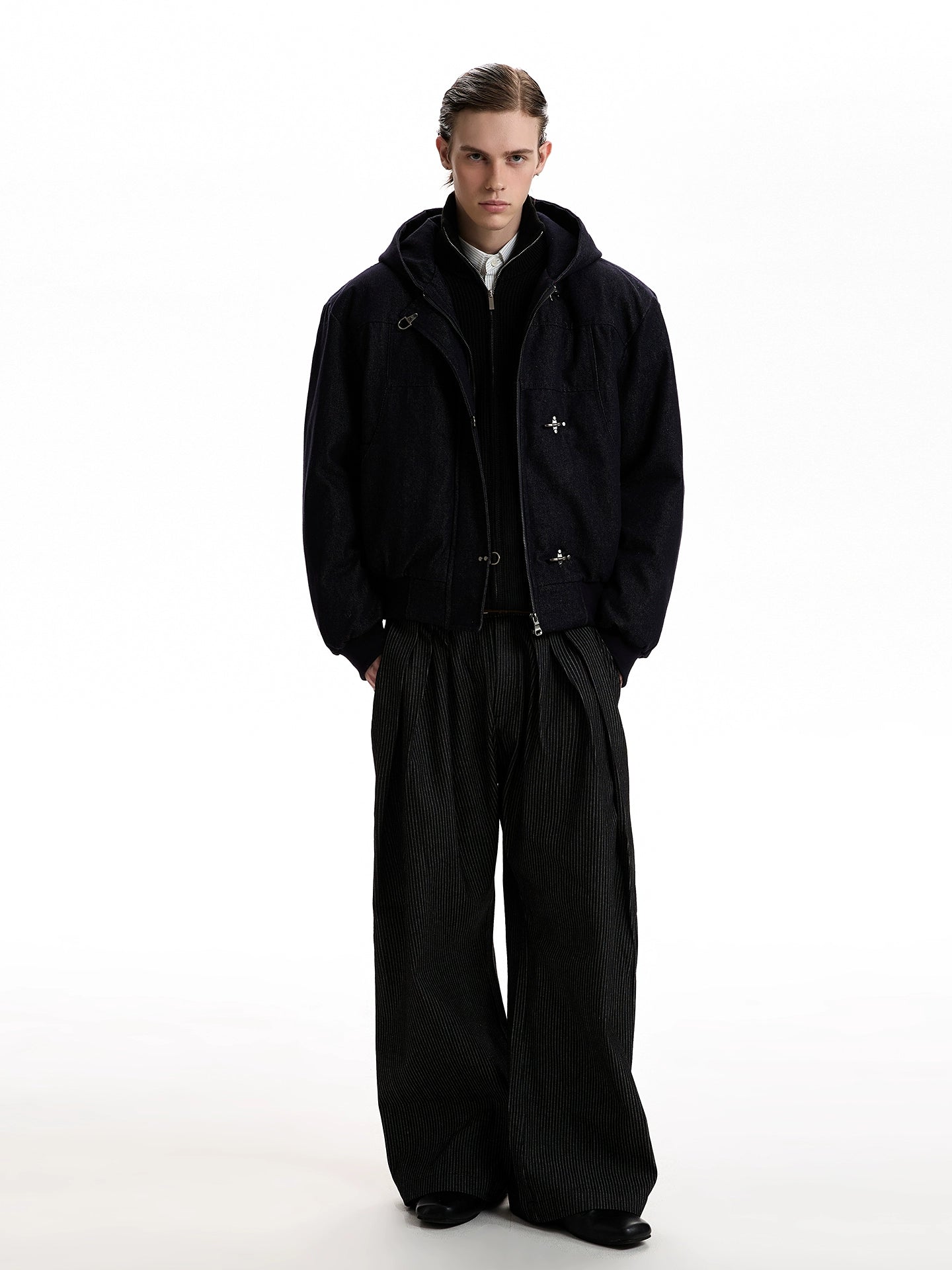 Its structured silhouette and heavyweight feel bring a bold balance of comfort and confidence. Crafted in a thick dark-wash denim with subtle texture, the design features a soft hood, zip closure, and distinctive metal fireman-style clasps that elevate the look without trying too hard. Ribbed cuffs and hem help retain warmth, while inset side pockets offer everyday utility.