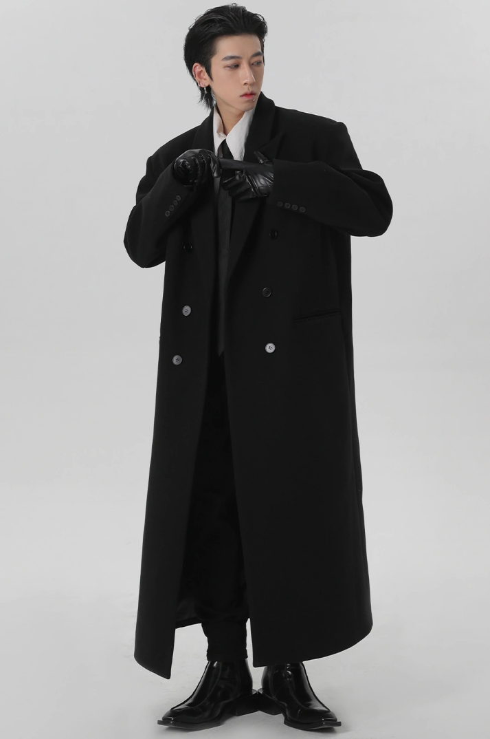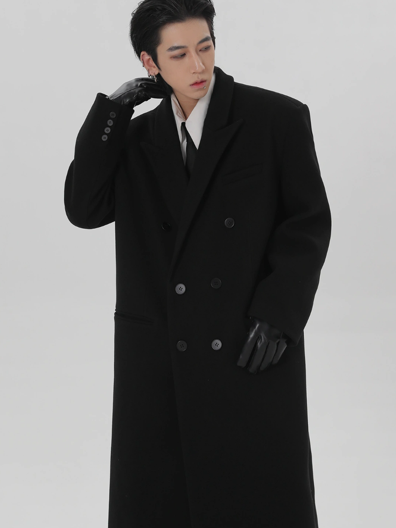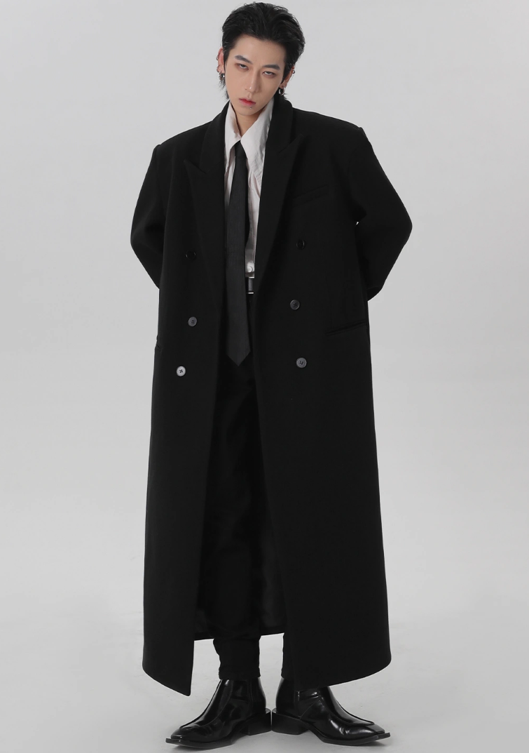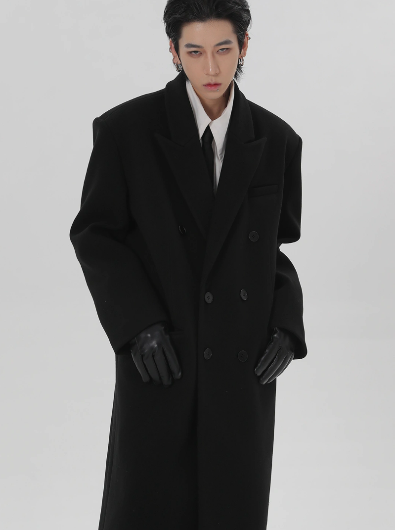 Expertly tailored from premium wool fabric, this coat embodies sophistication with its sharp suit collar and solid color design. Its long, straight-cut silhouette paired with double-breasted closure adds an element of classic style, while the loose fit offers a contemporary edge and comfortable wear.