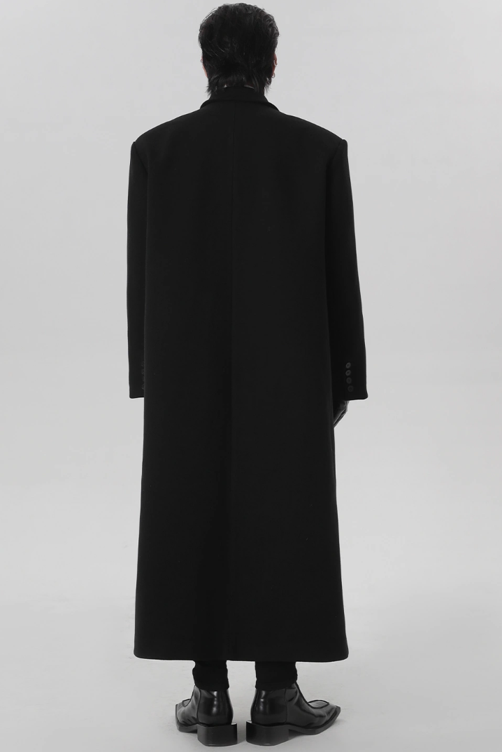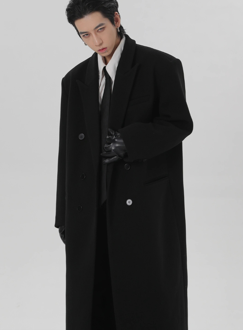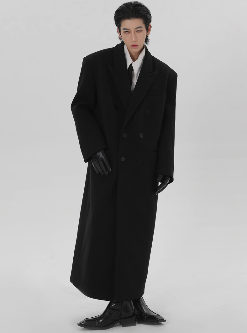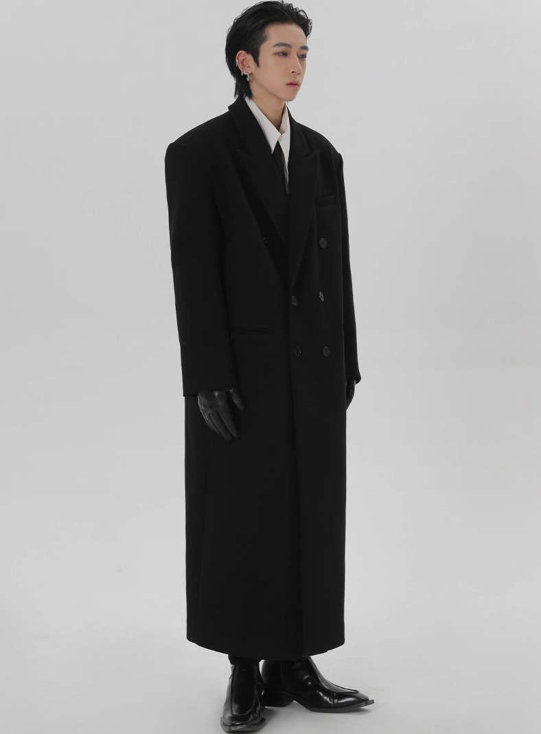 Expertly tailored from premium wool fabric, this coat embodies sophistication with its sharp suit collar and solid color design. Its long, straight-cut silhouette paired with double-breasted closure adds an element of classic style, while the loose fit offers a contemporary edge and comfortable wear.