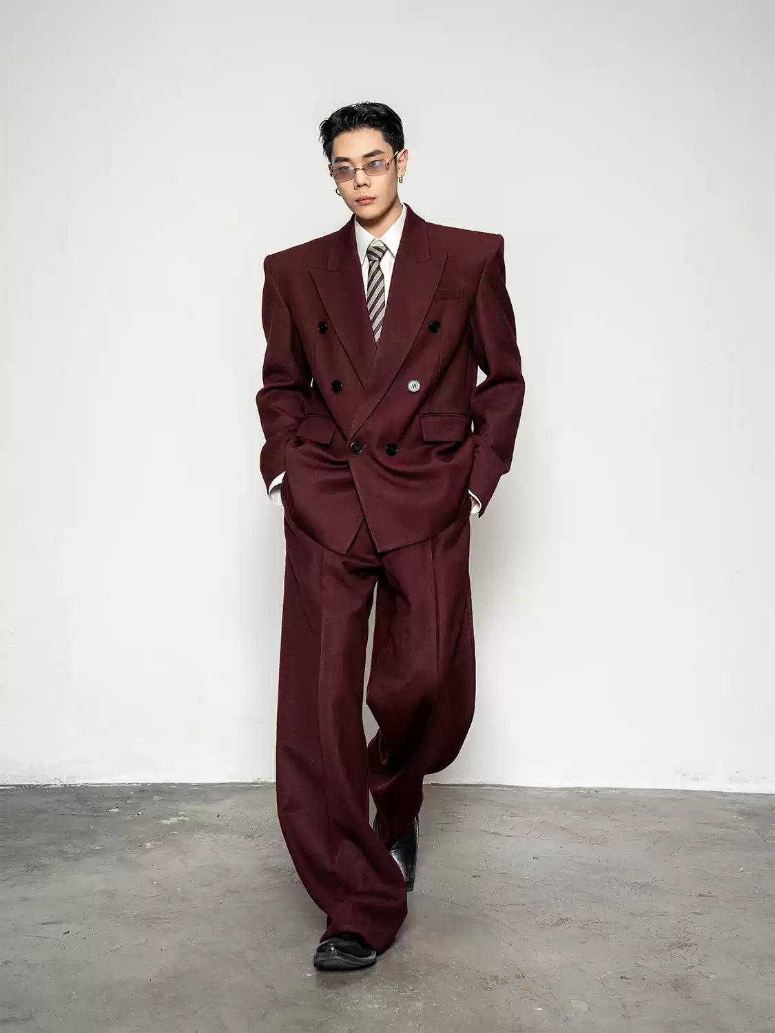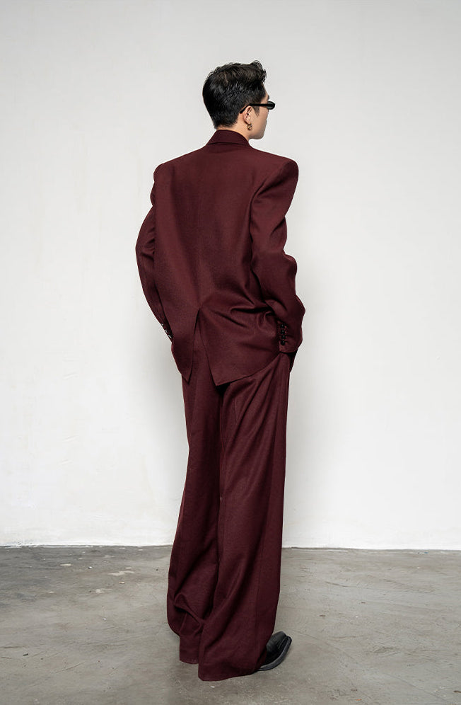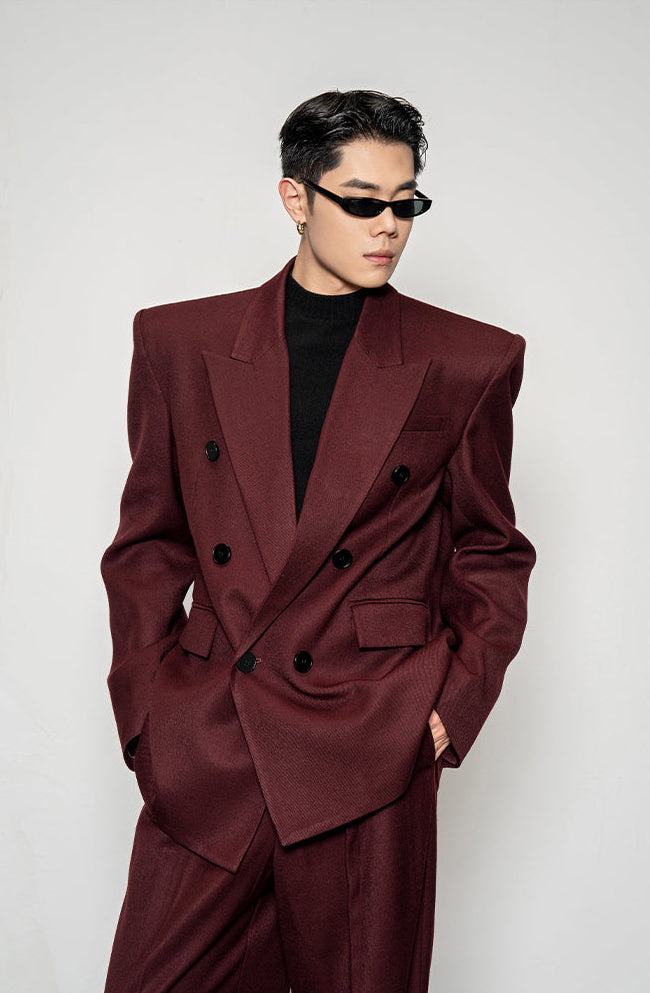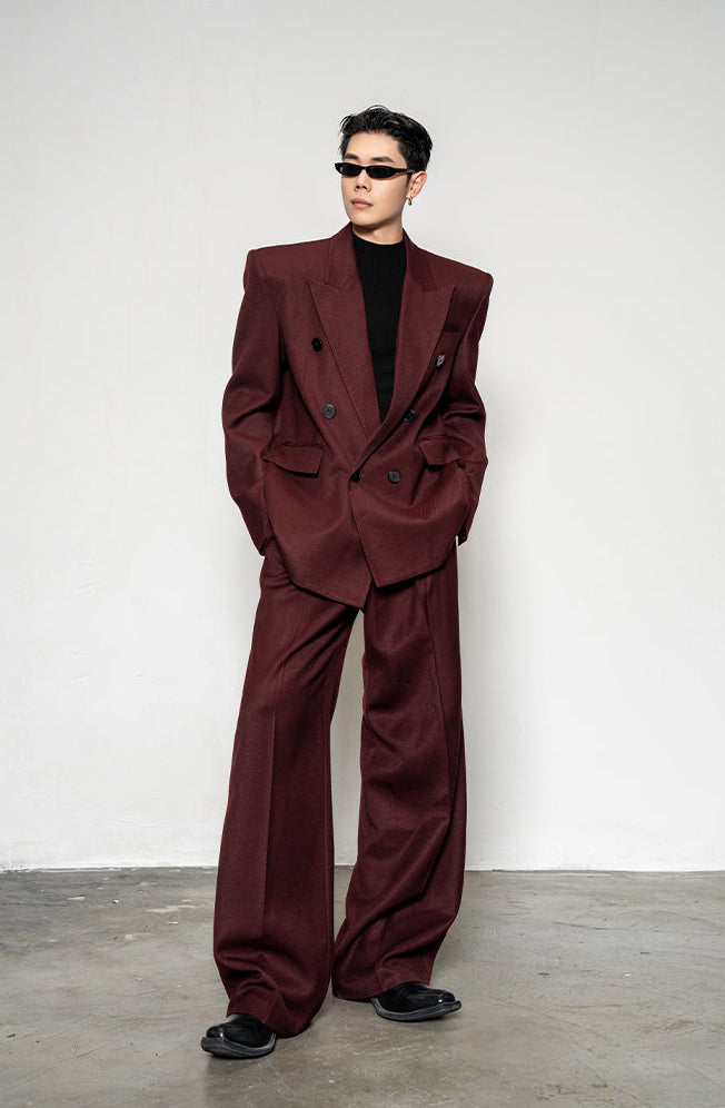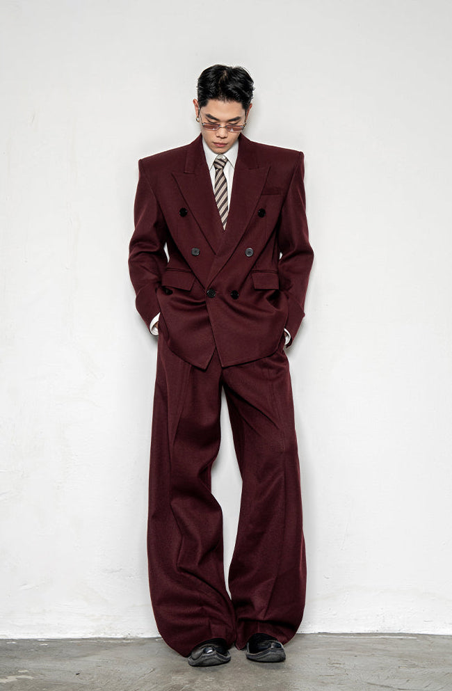 Crafted from a smooth, medium-weight woven fabric, the blazer features a wide peak lapel, double-breasted front, and padded shoulders for a sharp, sculpted profile. The matching trousers fall with a wide, straight leg that complements the boxy upper half, creating a balanced silhouette with effortless drape and flow.
