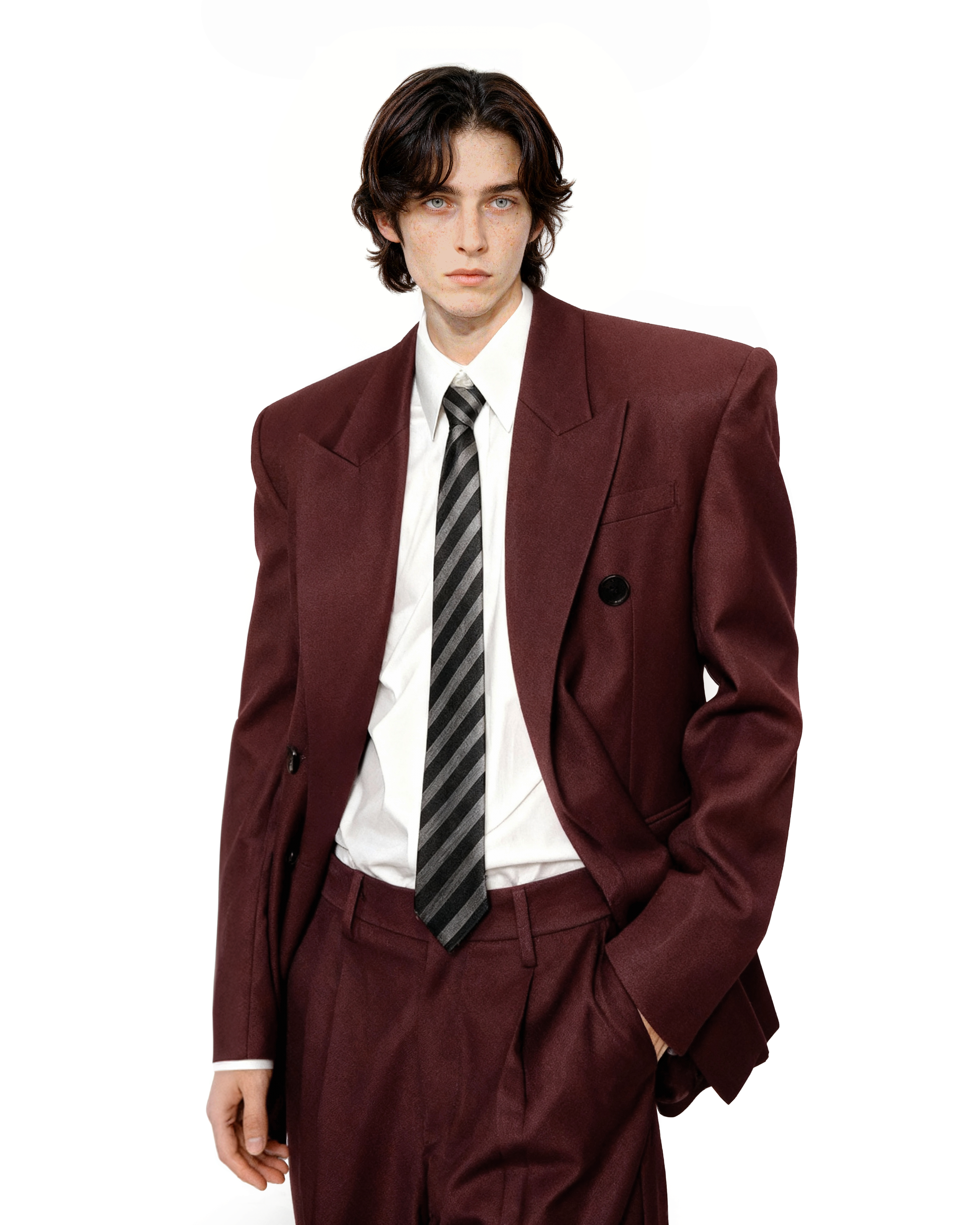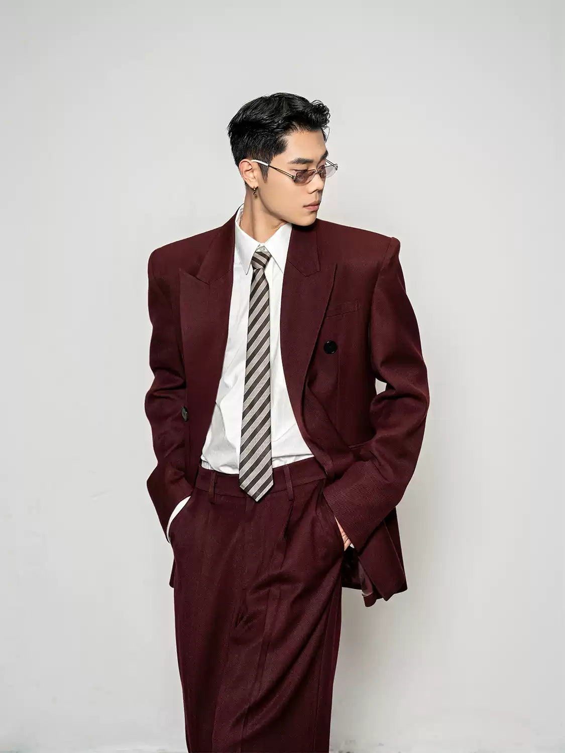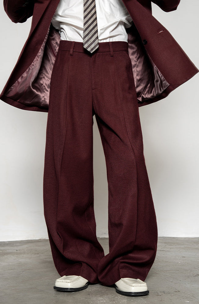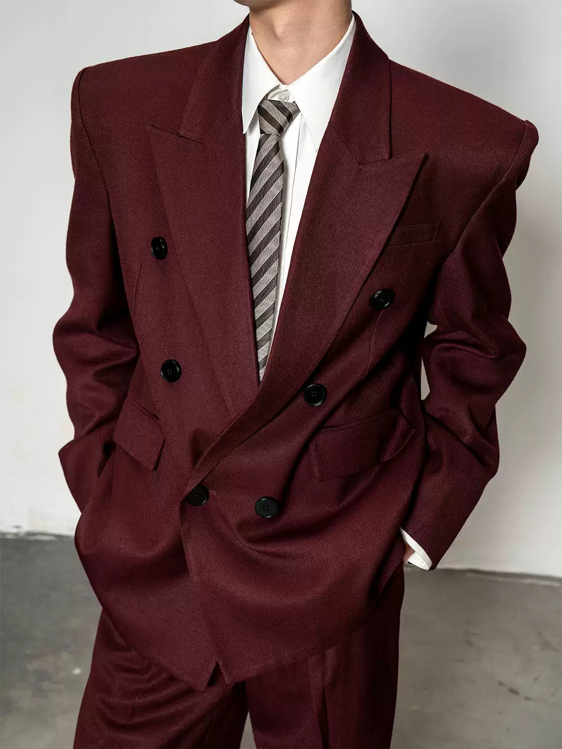 Crafted from a smooth, medium-weight woven fabric, the blazer features a wide peak lapel, double-breasted front, and padded shoulders for a sharp, sculpted profile. The matching trousers fall with a wide, straight leg that complements the boxy upper half, creating a balanced silhouette with effortless drape and flow.