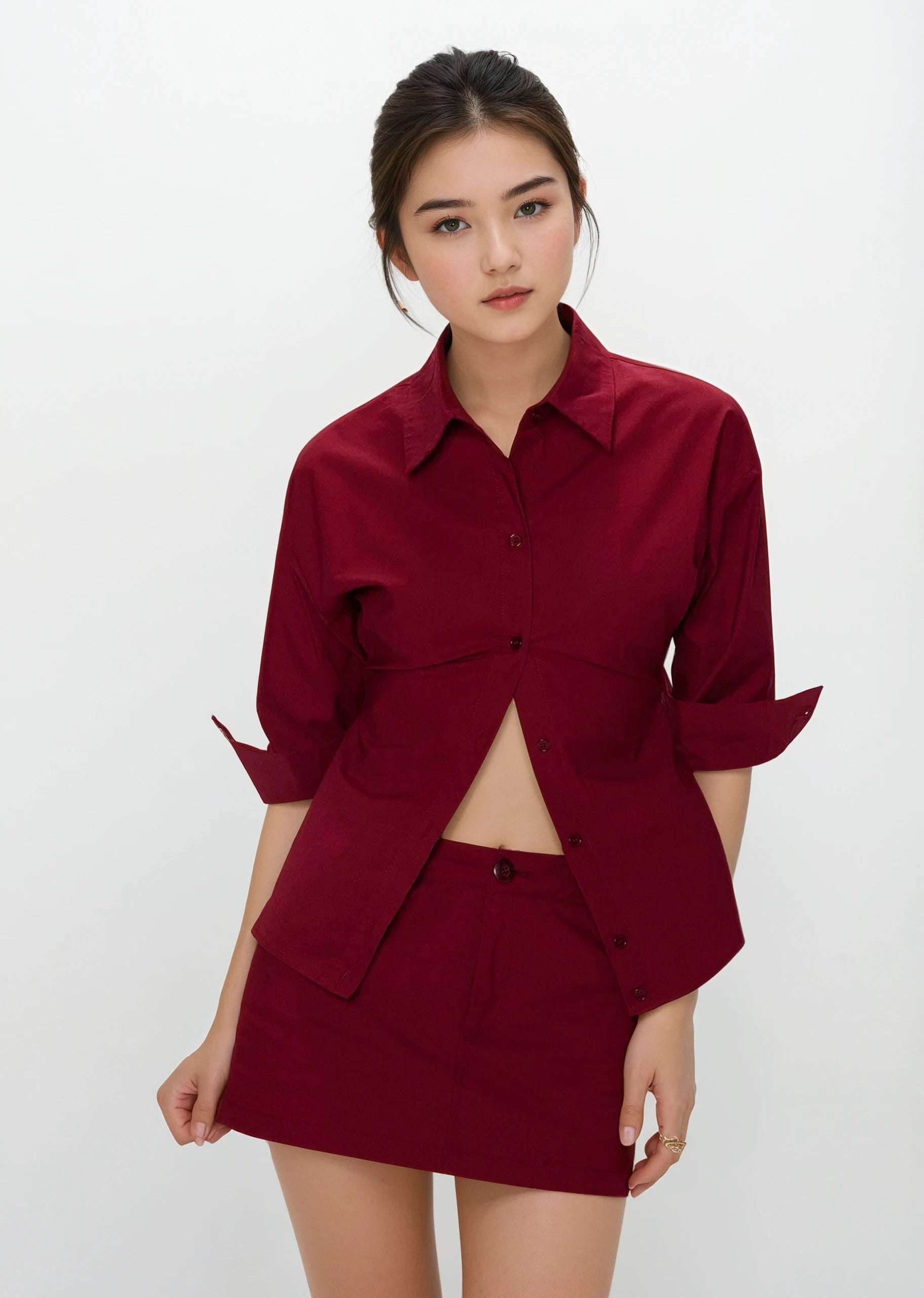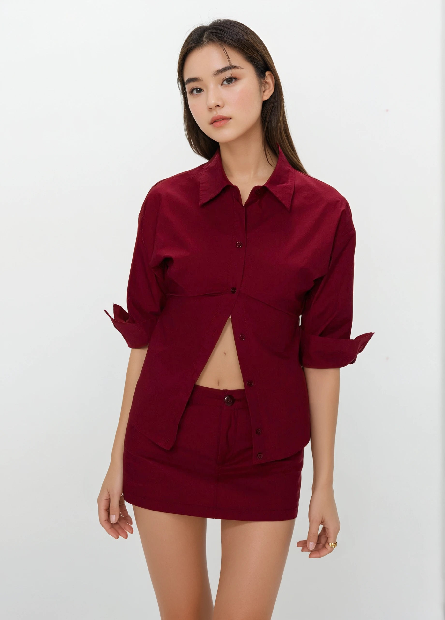 Made from a structured, stretch-woven fabric blend, the shirt features a relaxed straight fit with a crisp collar and partial placket, paired with a fitted mini skirt that sits neatly at the waist. The deep red hue adds edge, while the streamlined silhouette stays true to a confident, understated vibe.