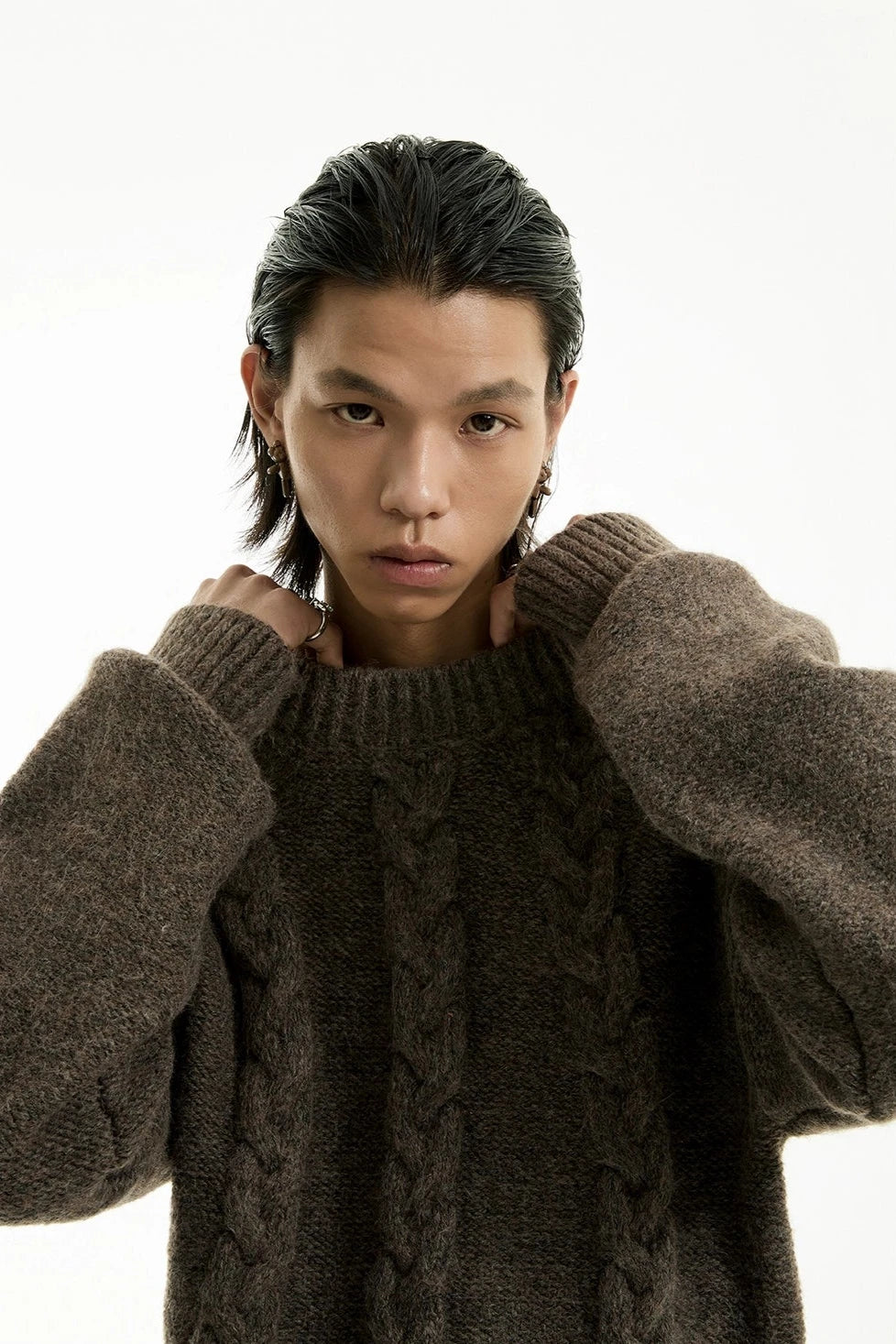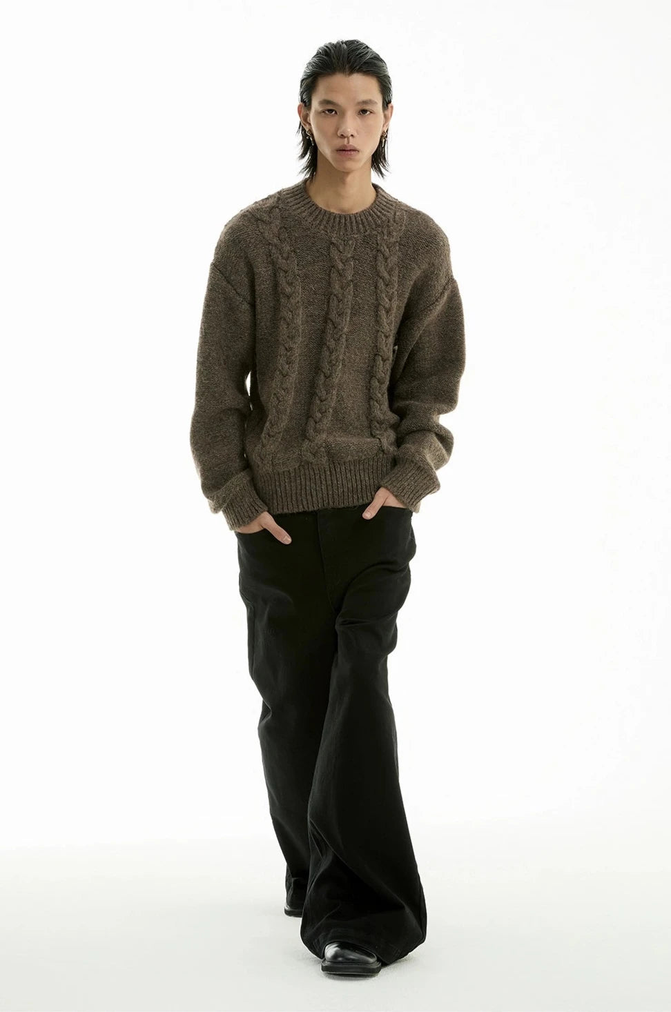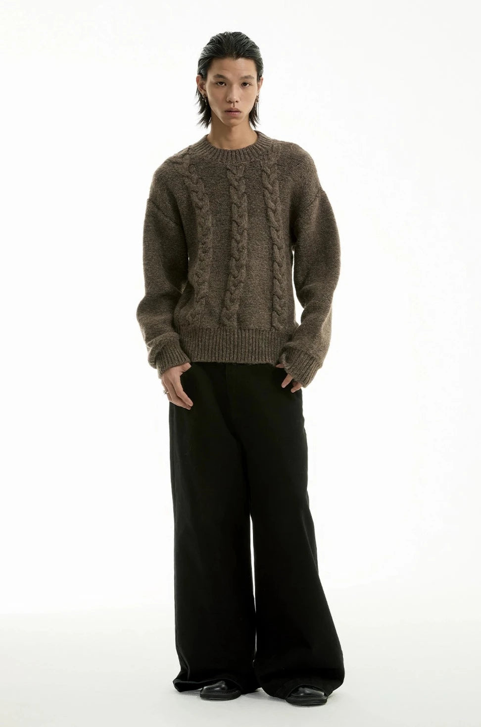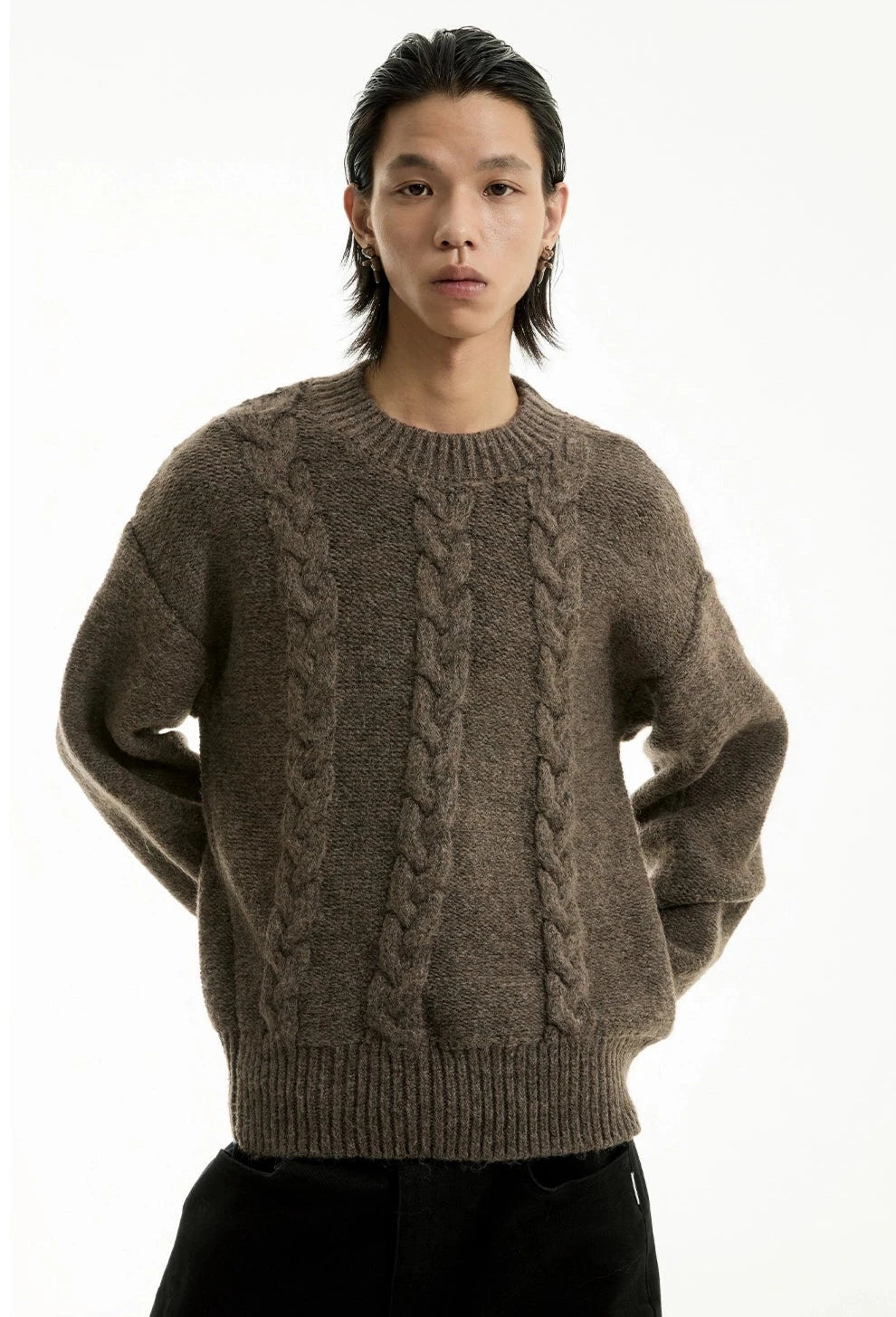 Read full Return PolicyDiscover understated sophistication with our Cable Knit Crewneck Sweater, embodying an edgy aesthetic fused with a touch of professional poise.