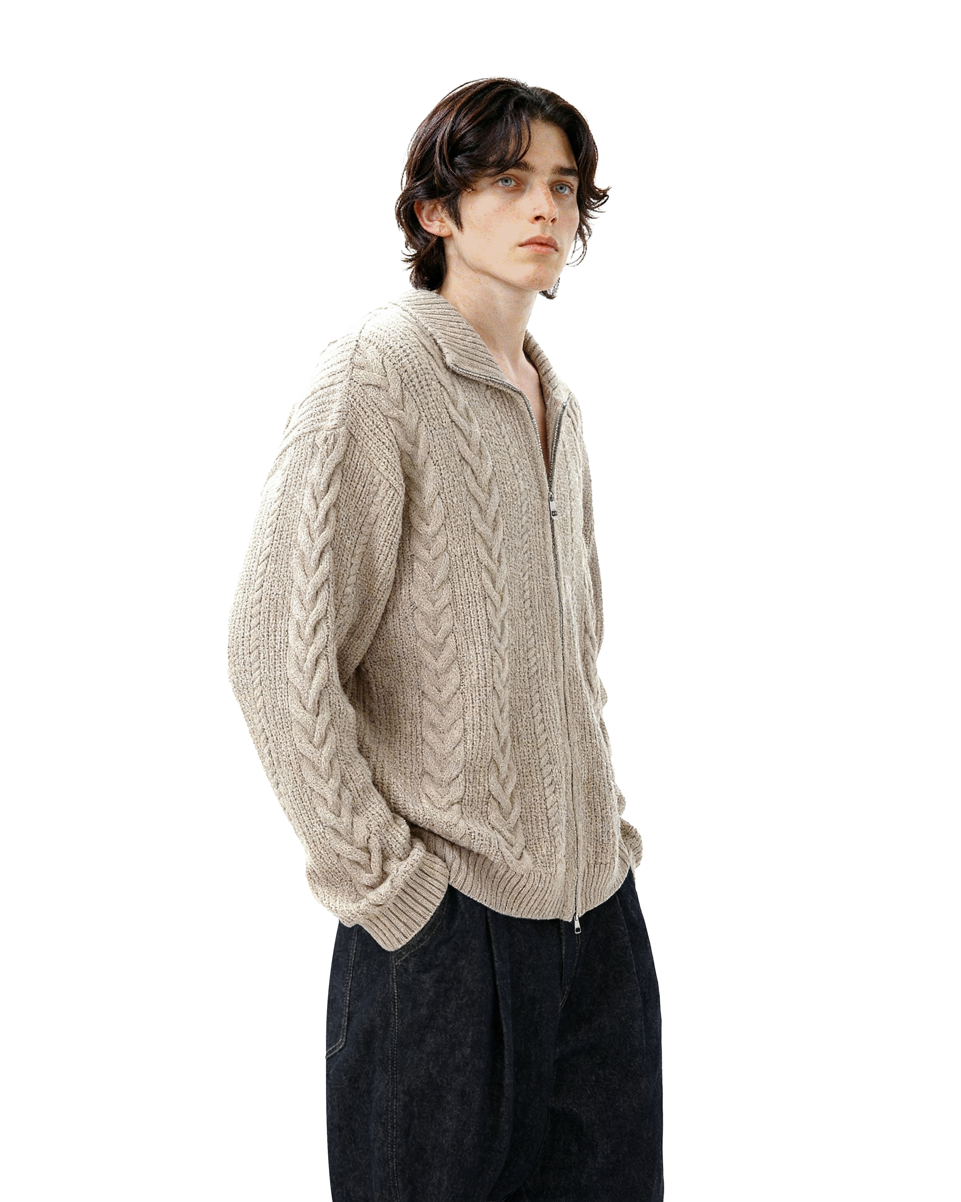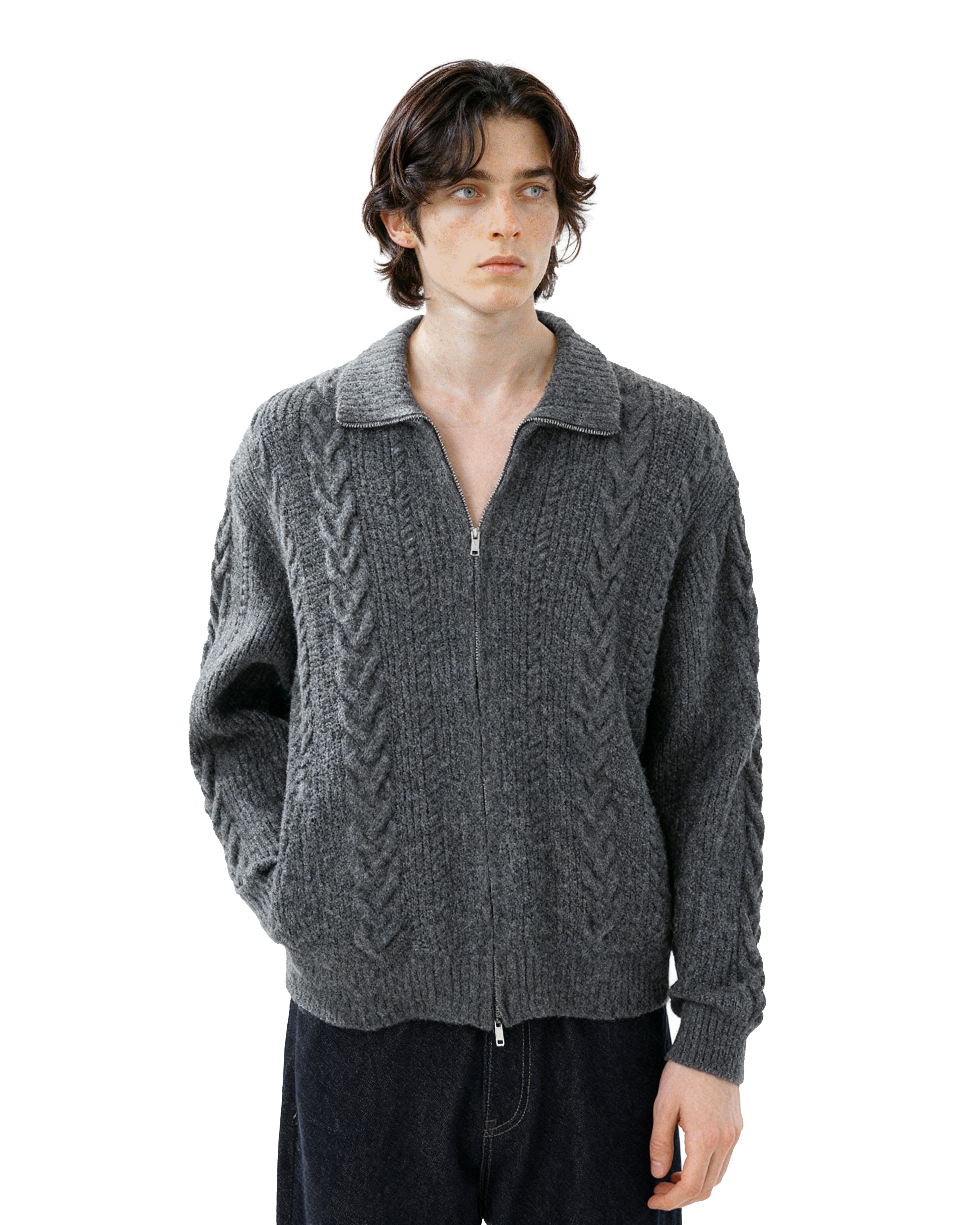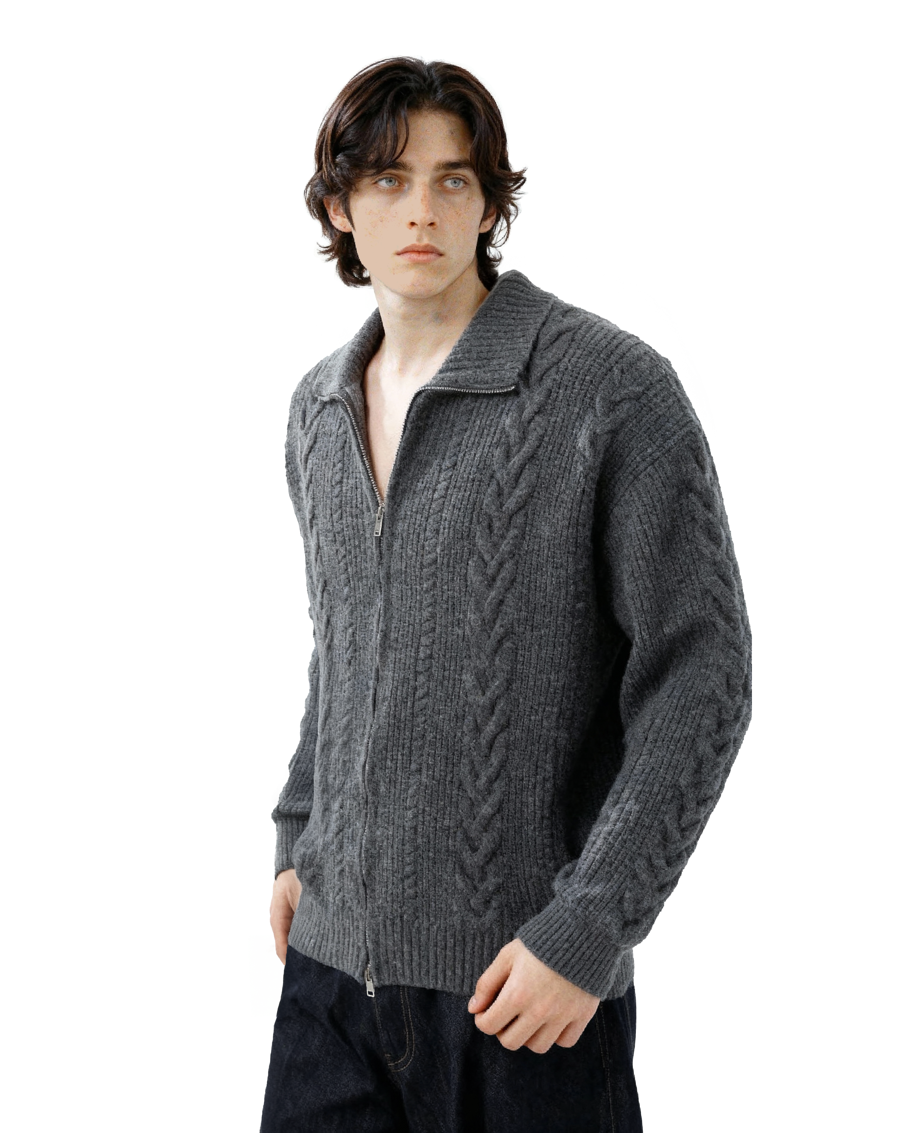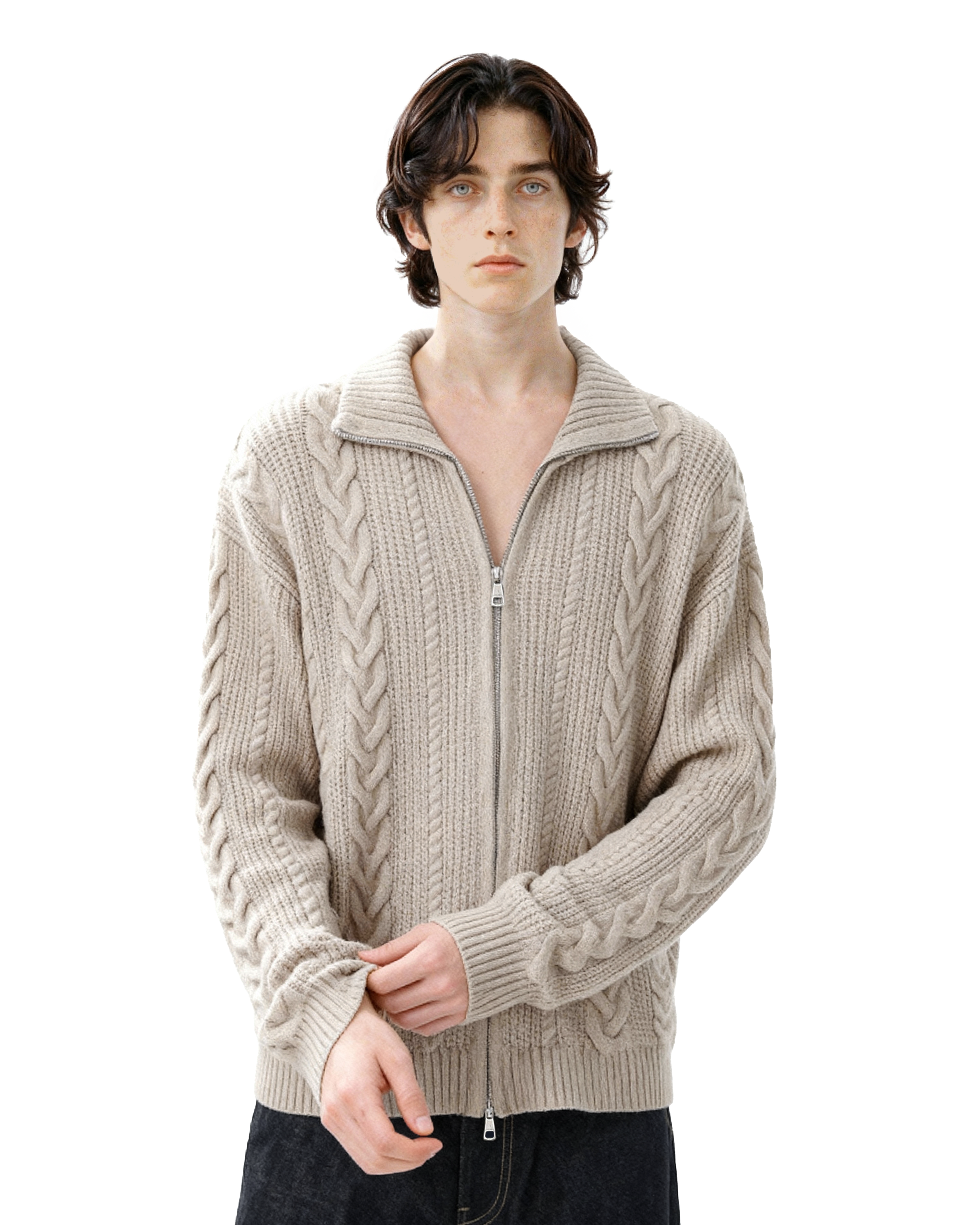 It's designed for everyday ease without losing style points. Made from a soft, skin-friendly knit blend, this zip cardigan features a double-ended zipper, ribbed finishes, and a wide cable-knit pattern that elevates a simple layering piece with just the right amount of detail. The lapel collar adds a structured touch, working well whether fully zipped or left open. Ideal for off-duty days, coffee runs, or casual plans that still call for a bit of intentional style.