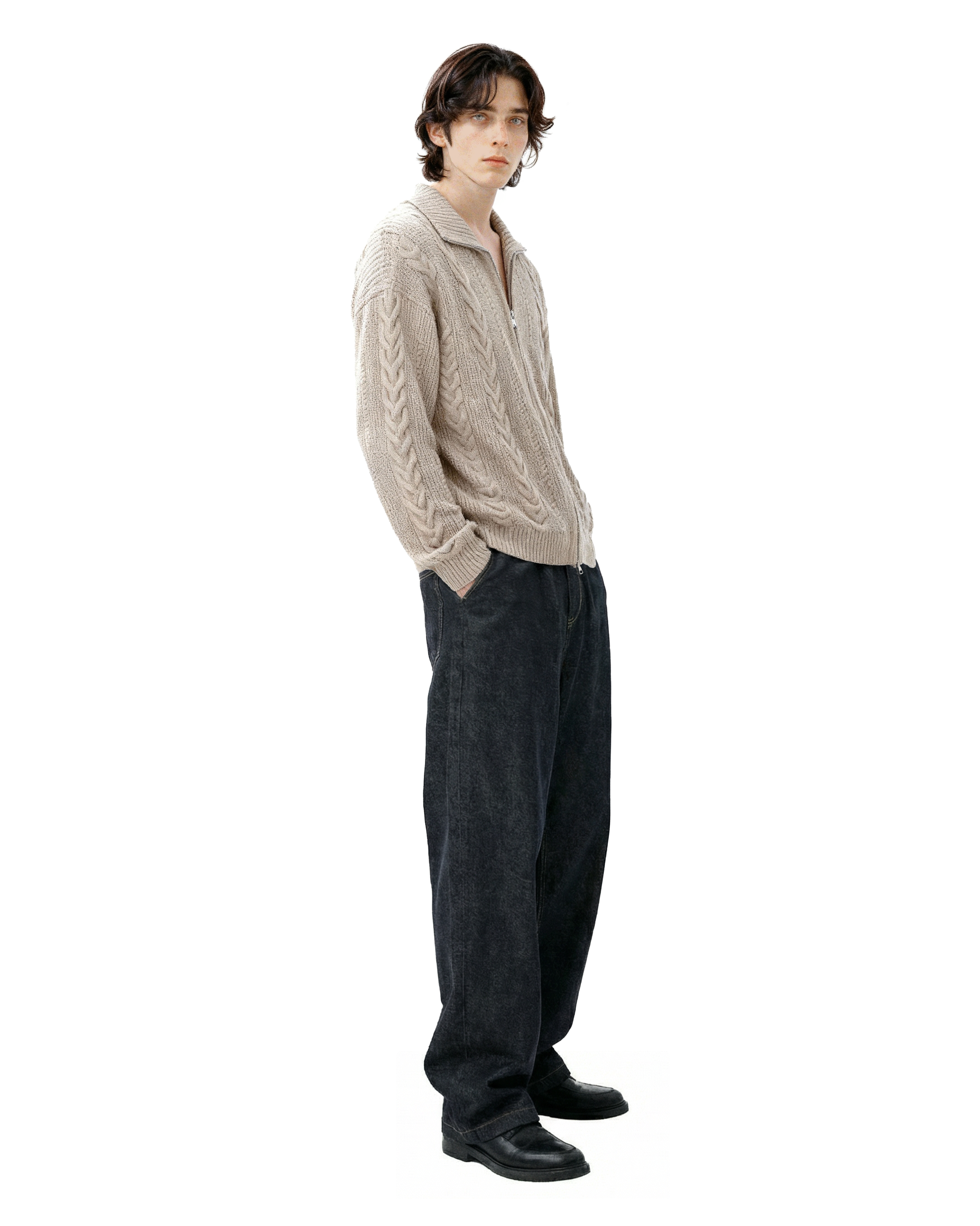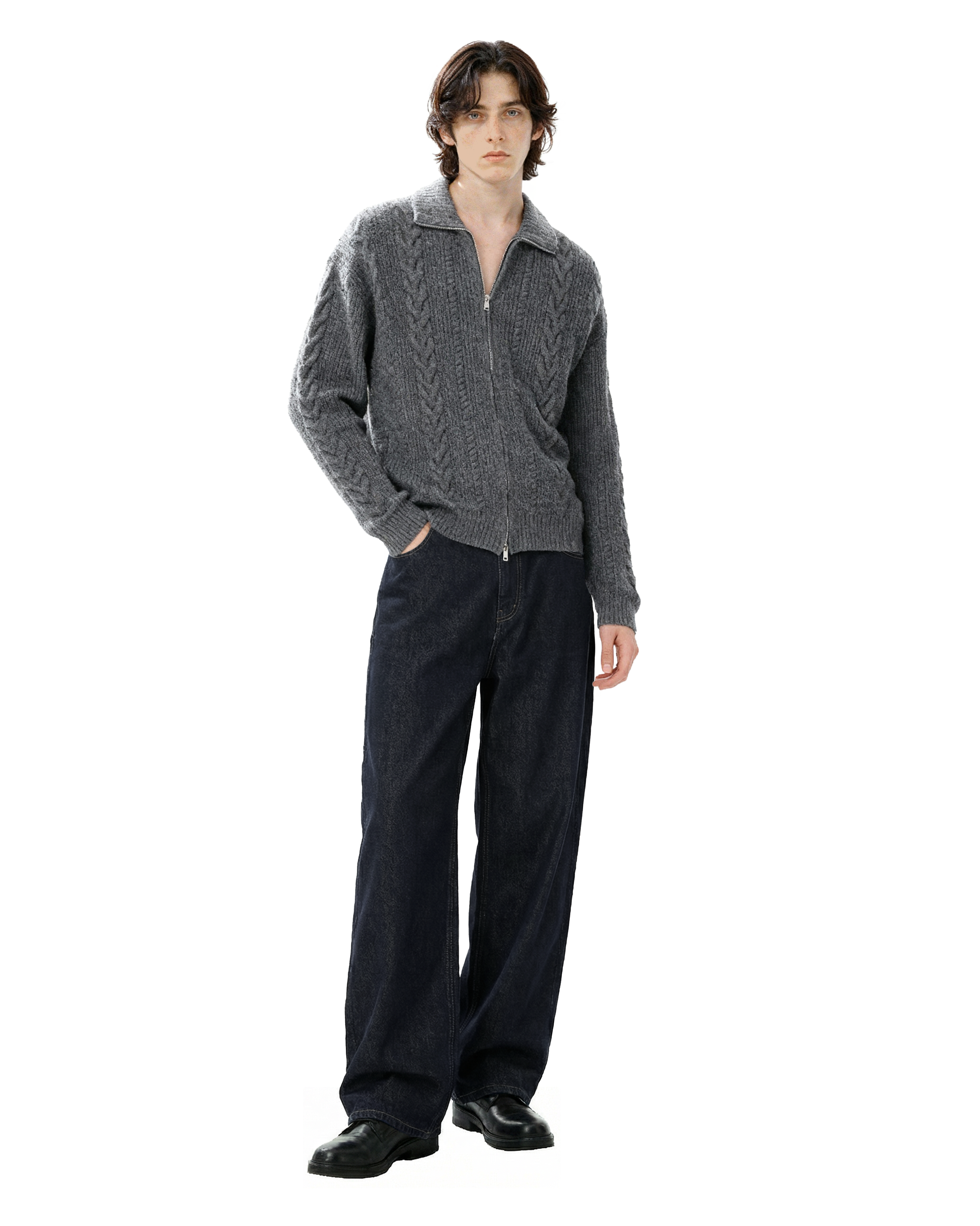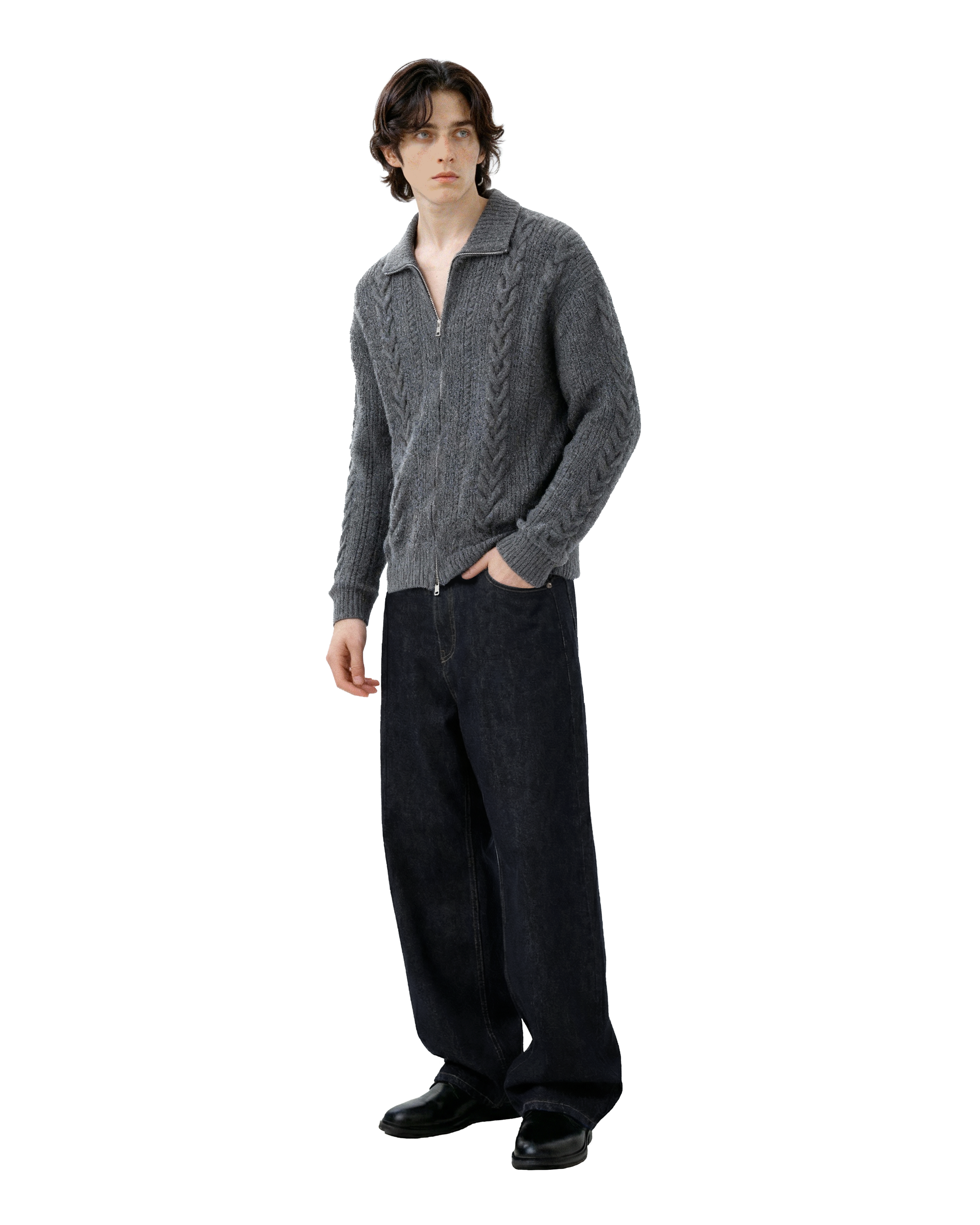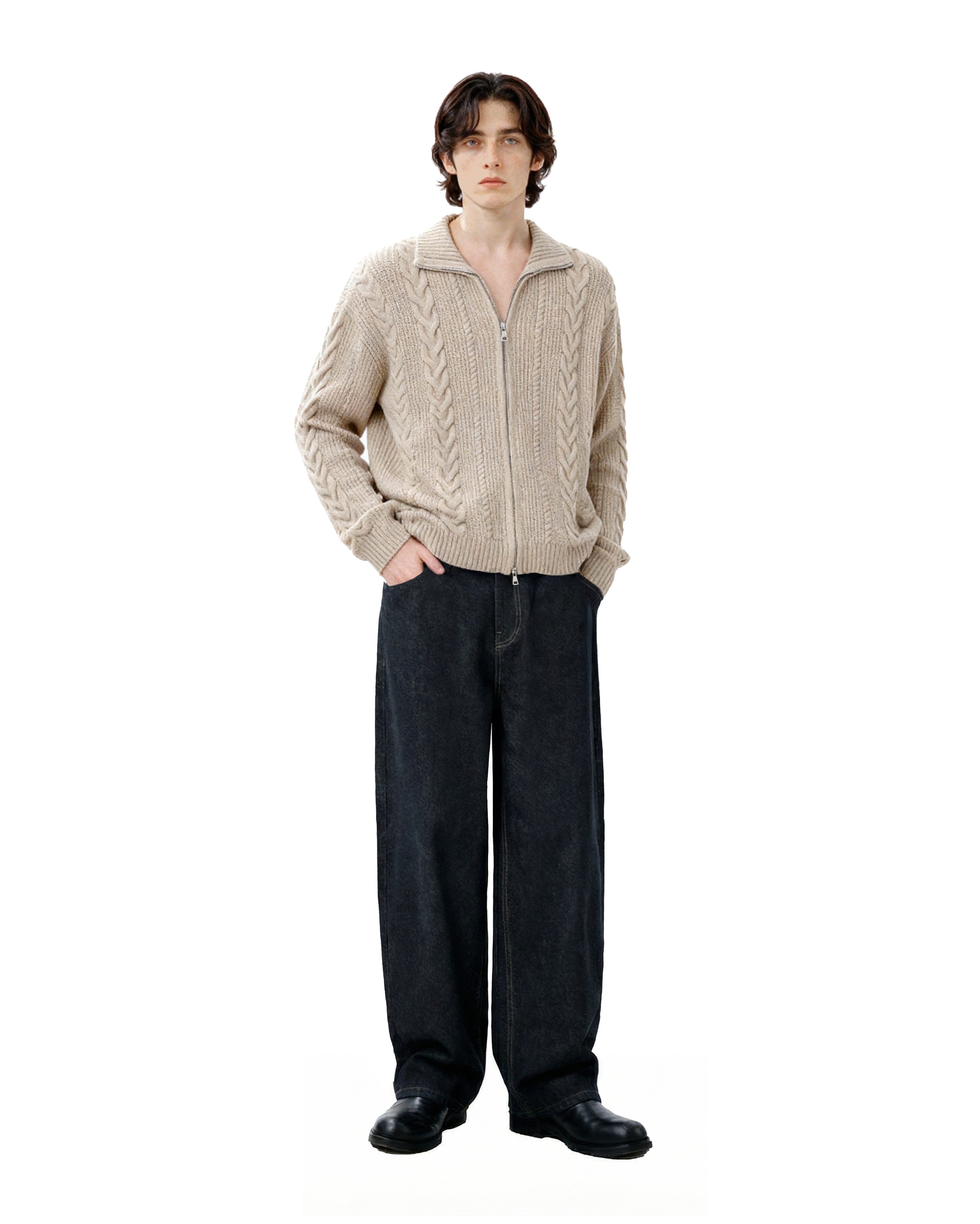 It's designed for everyday ease without losing style points. Made from a soft, skin-friendly knit blend, this zip cardigan features a double-ended zipper, ribbed finishes, and a wide cable-knit pattern that elevates a simple layering piece with just the right amount of detail. The lapel collar adds a structured touch, working well whether fully zipped or left open. Ideal for off-duty days, coffee runs, or casual plans that still call for a bit of intentional style.