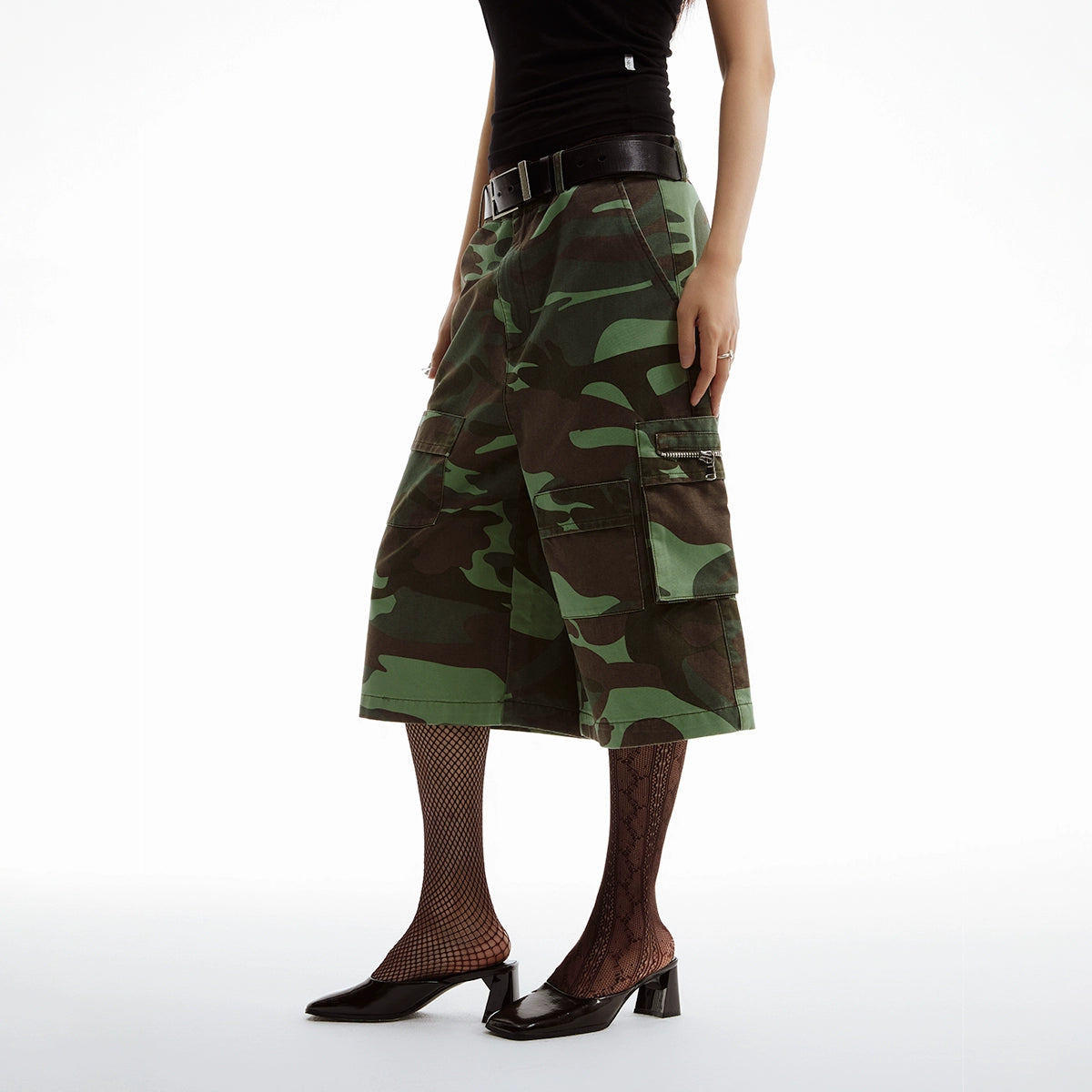 Constructed from durable cotton fabric, these culotte shorts feature a classic camouflage print with nuanced, fade detailing for a lived-in look. The design integrates multiple pockets for functionality, while the loose straight fit offers comfort without compromising on style. Their mid-waist and washed process give them an already-worn feel, ideal for your day-to-day ensemble.