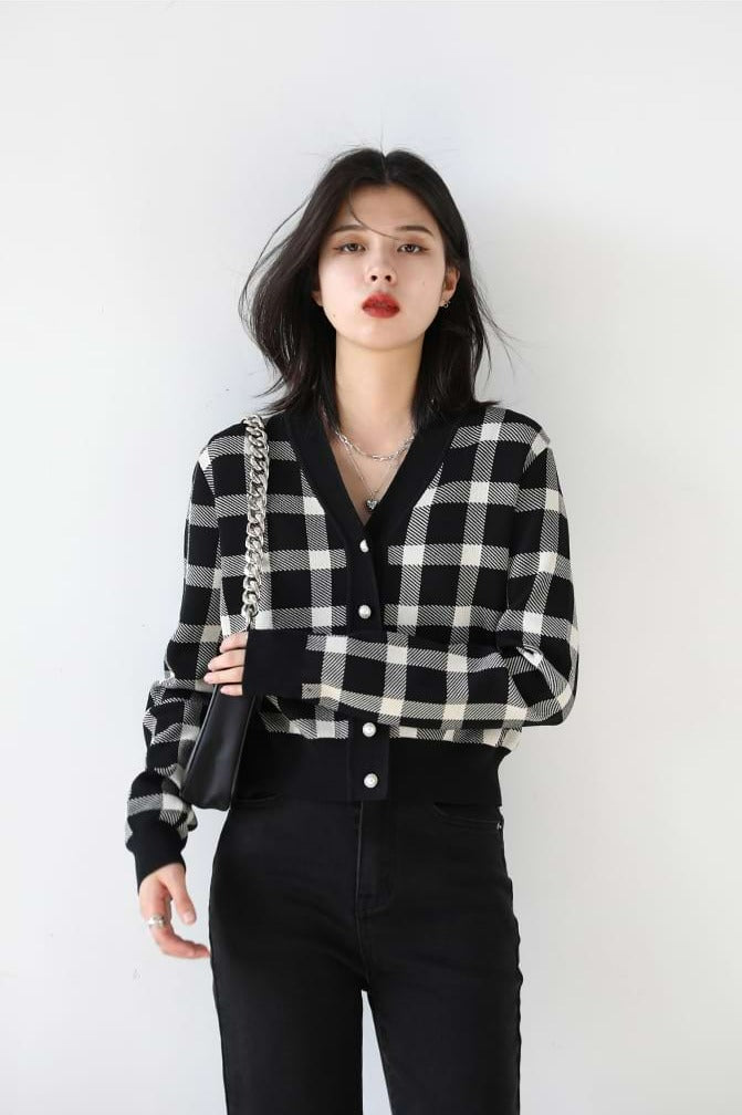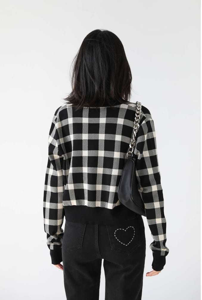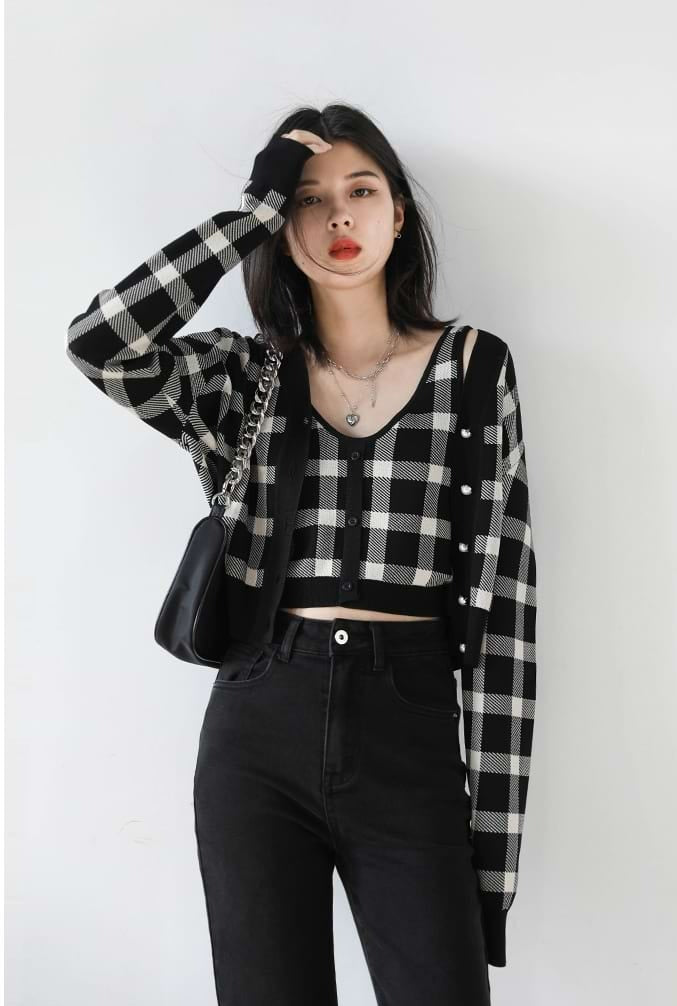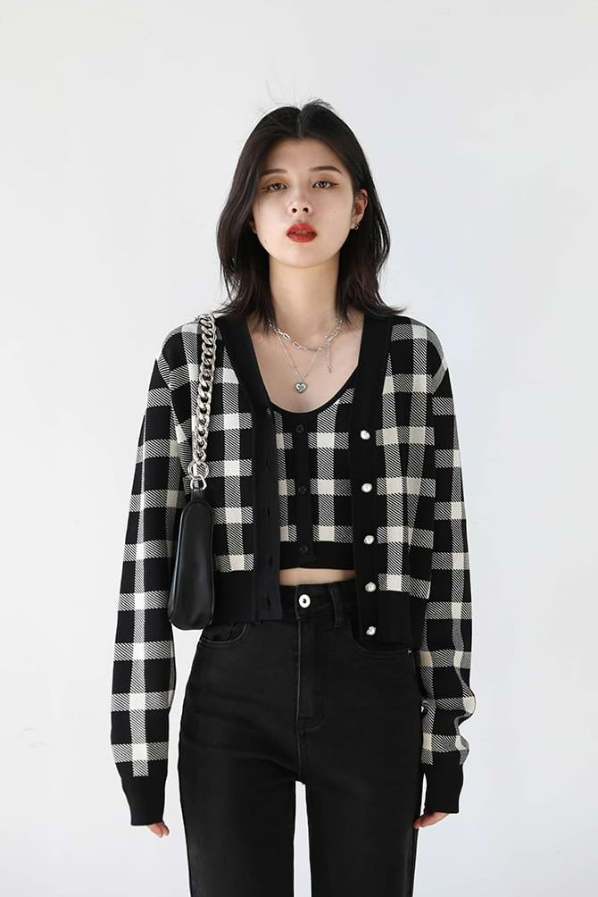 Read full Return PolicyStand out from the crowd with this stylish Checker Sleeveless Crop Top and Cardigan combo. Rock the checker pattern separately or together to create a statement look. The black and white checker pattern pairs beautifully together for a look that's both modern and edgy. Throw on the sleeveless crop top for a night out on the town or show off your more modest side with the cardigan. Whether you wear them separately or together, you'll be sure to turn heads in this fashion-forward combination!