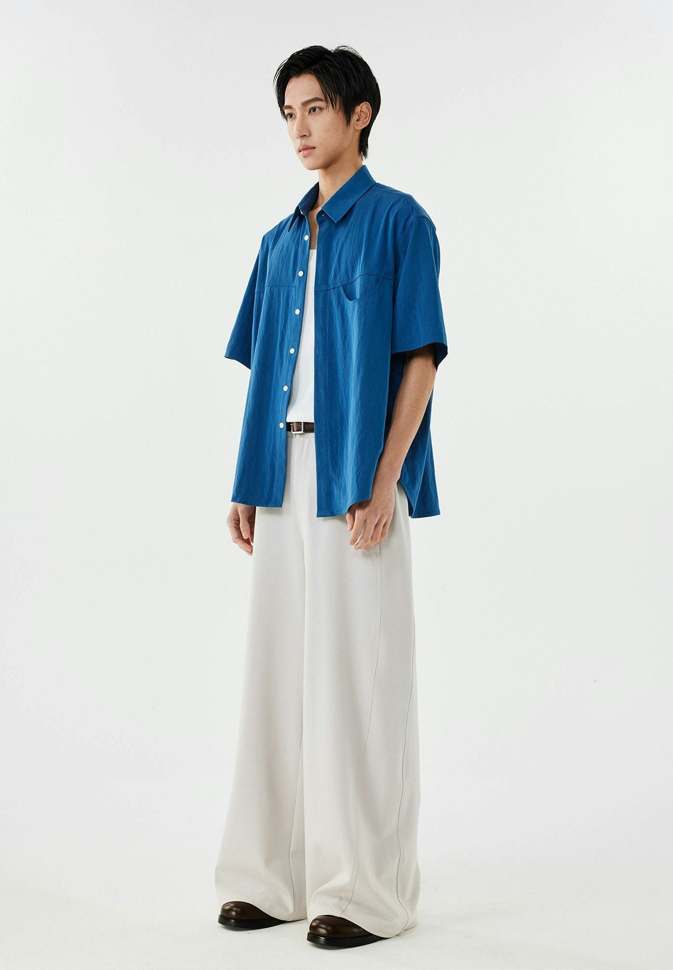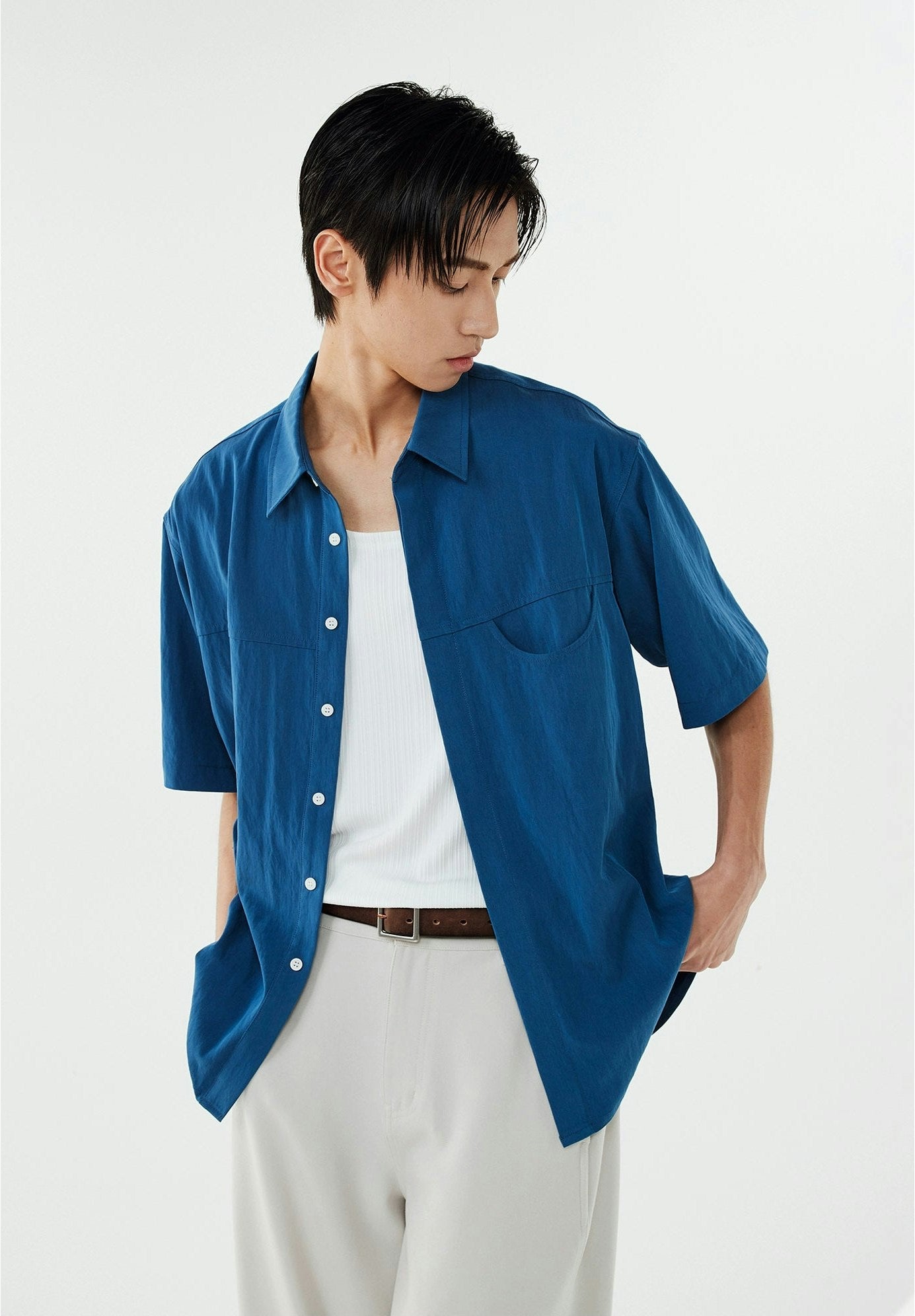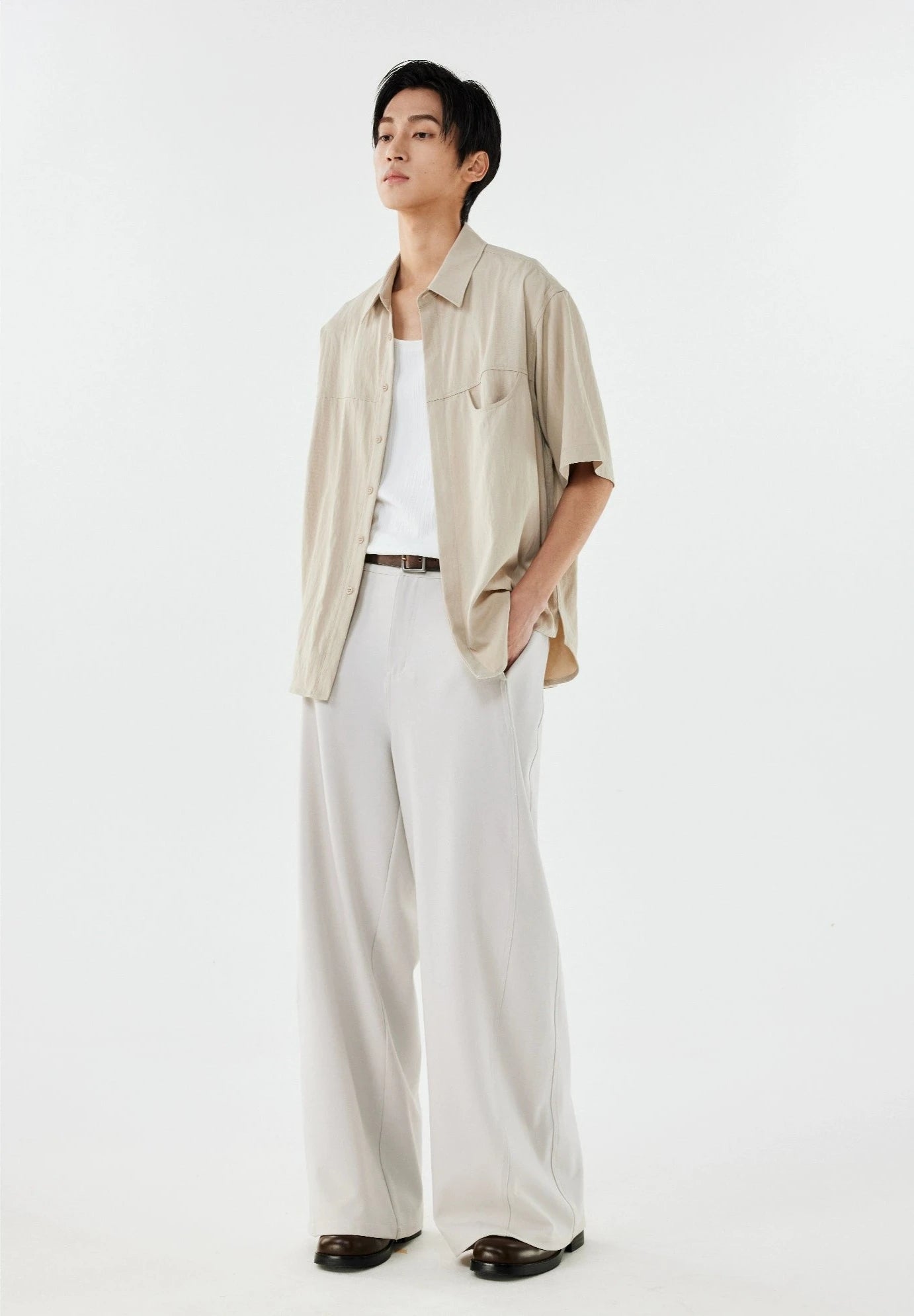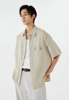 Made with a tactile mix of 70% polyamide fiber and 30% recycled cellulose fiber, this shirt's linen-blend fabric offers a crisp texture and a relaxed drape. The thoughtful design, complete with a structured lapel collar and arc-shaped pocket, adds an element of sophistication. Crafted to be non-restrictive, it maintains a loose silhouette that complements the natural lines of the body, making it a go-to for any scene.