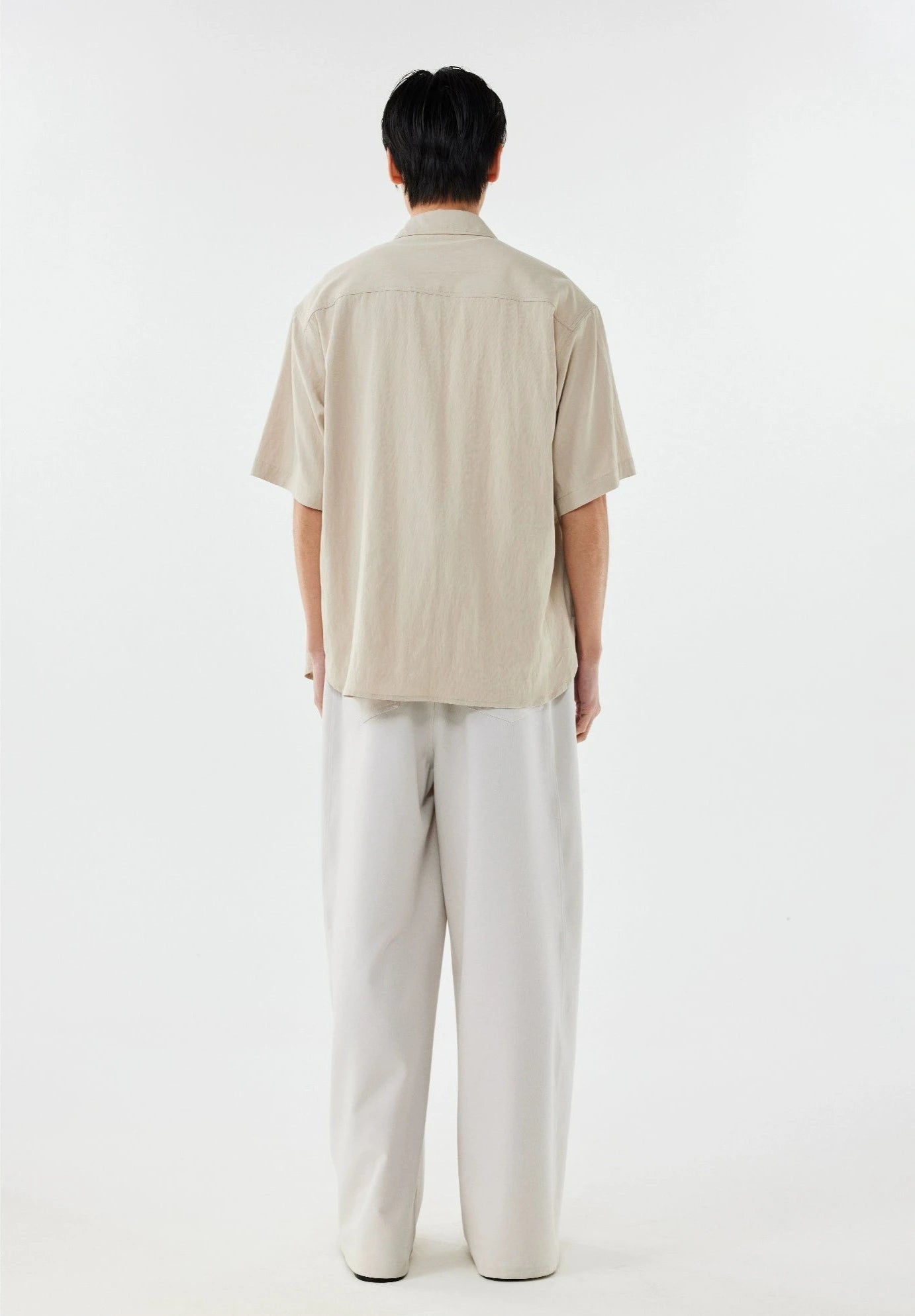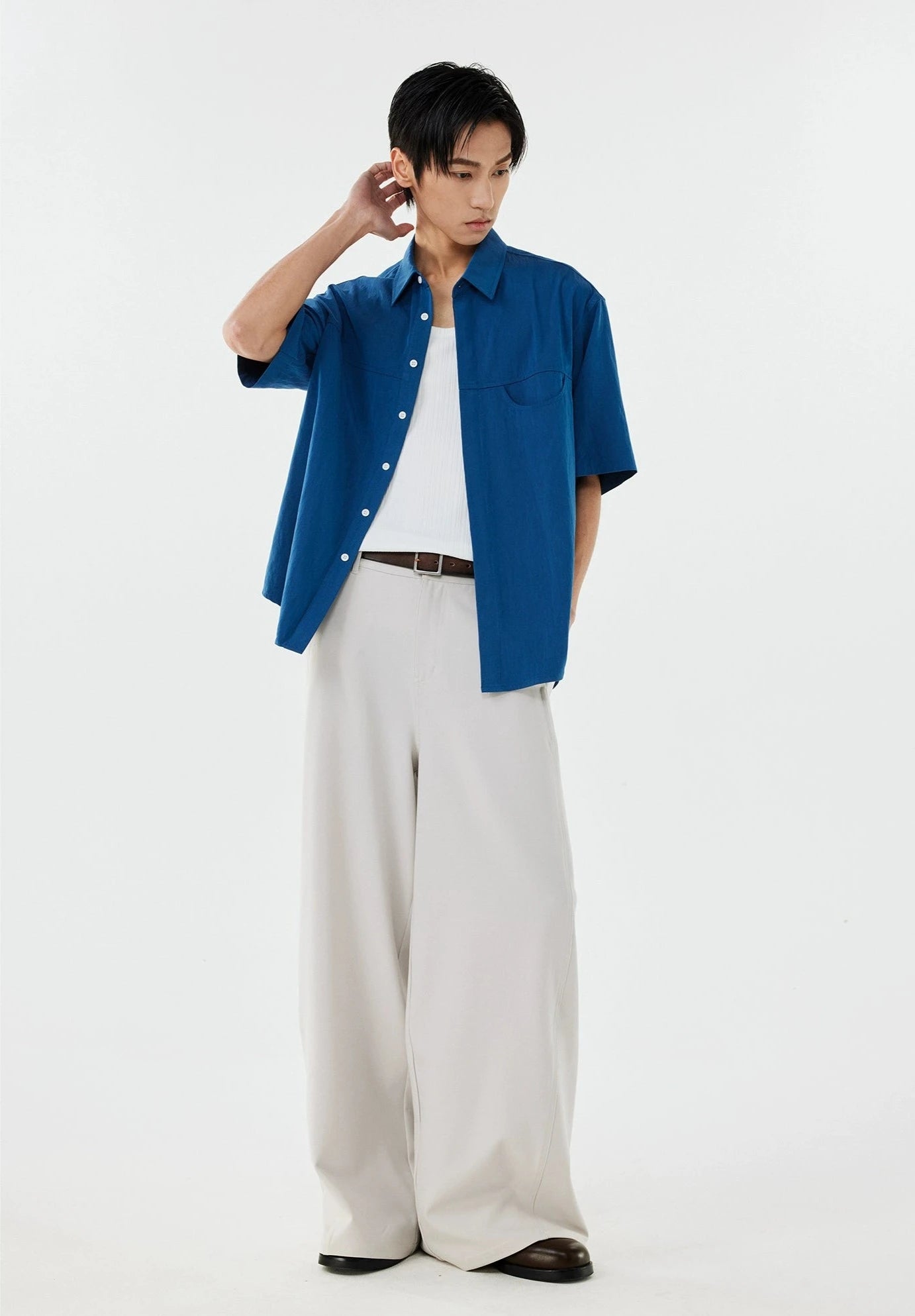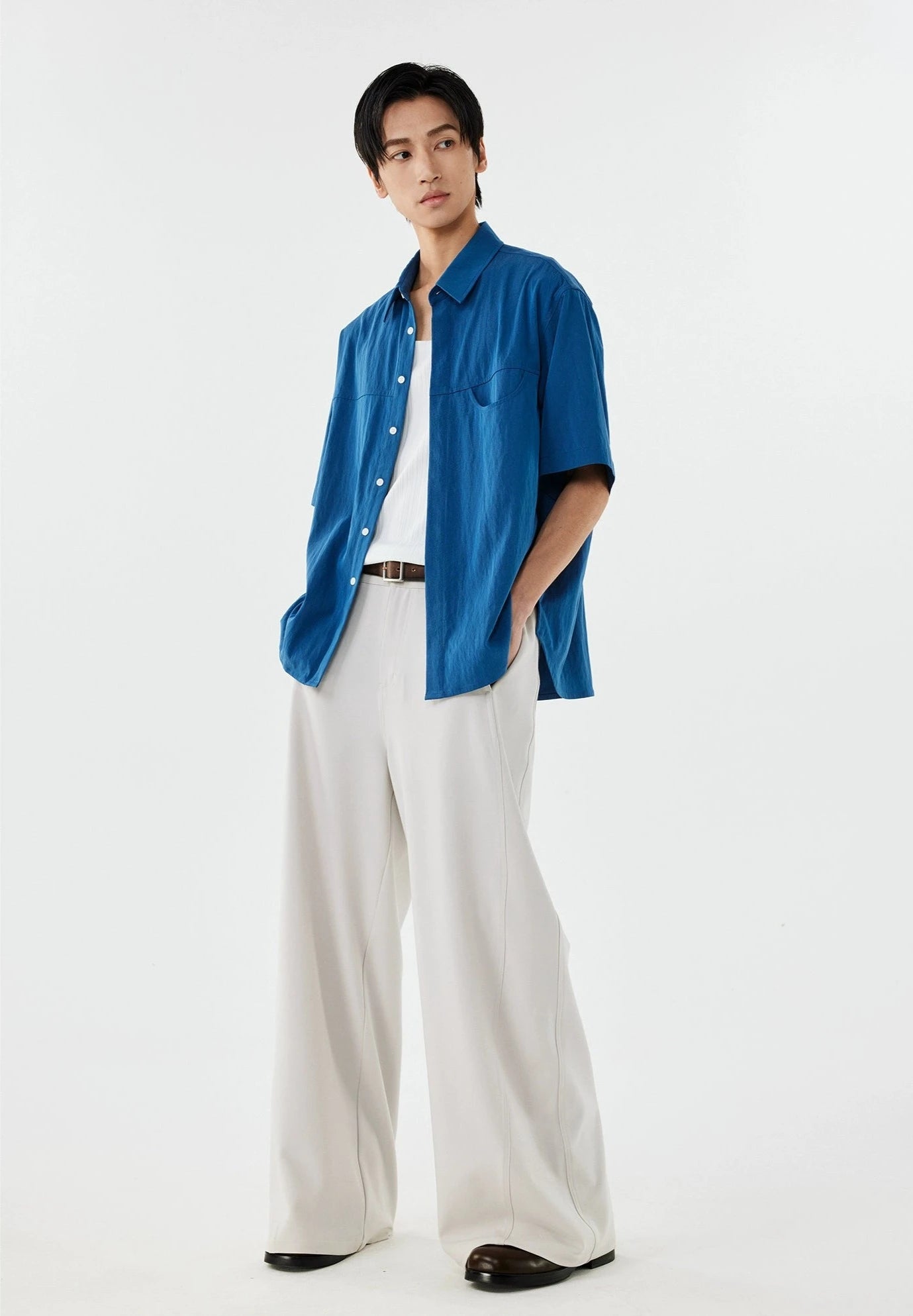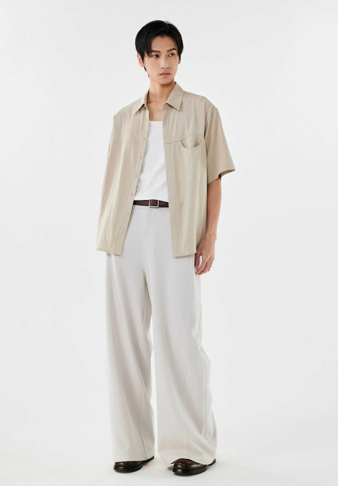 Made with a tactile mix of 70% polyamide fiber and 30% recycled cellulose fiber, this shirt's linen-blend fabric offers a crisp texture and a relaxed drape. The thoughtful design, complete with a structured lapel collar and arc-shaped pocket, adds an element of sophistication. Crafted to be non-restrictive, it maintains a loose silhouette that complements the natural lines of the body, making it a go-to for any scene.