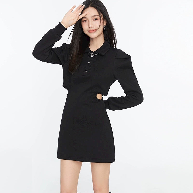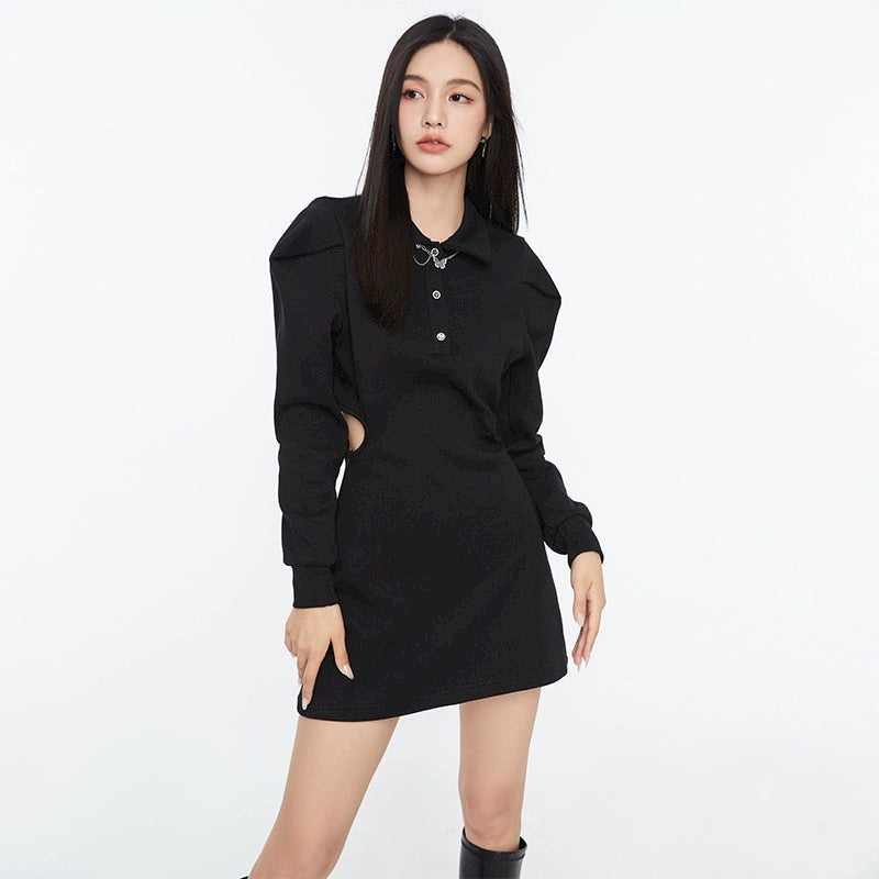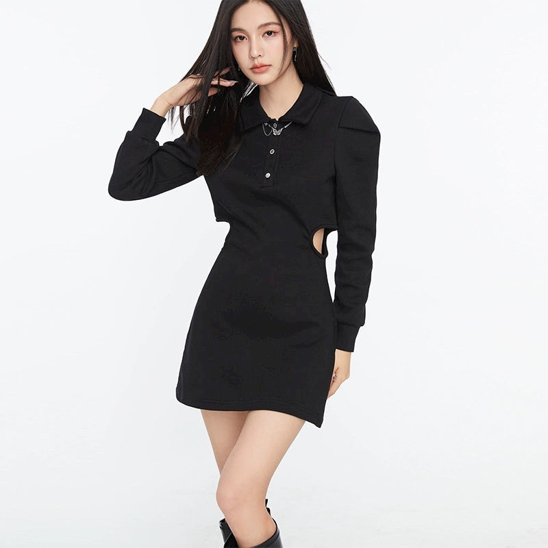 Made with a blend of polyester fiber and spandex, this dress exhibits the perfect union of comfort and durability. The polo collar adds a crisp, tailored look while the mini A-line silhouette teamed with a cutout at the waist injects an unexpected edge. The solid black color and minimalist design are versatile enough for both professional settings and laid-back social gatherings.