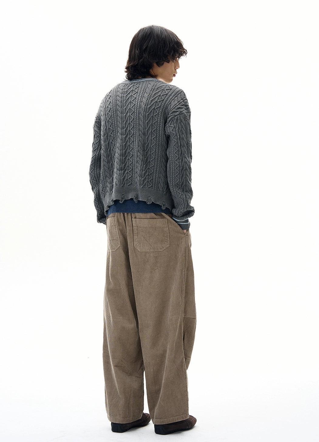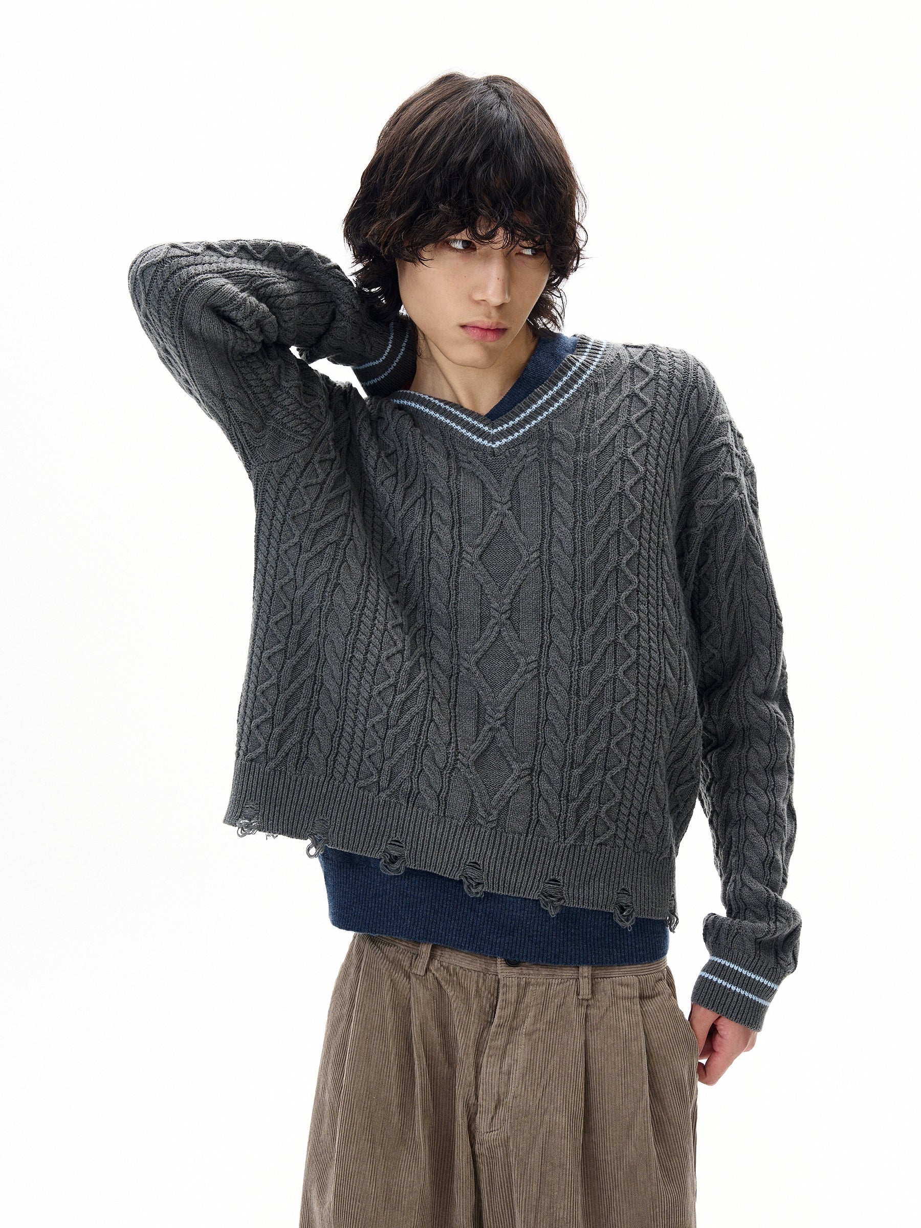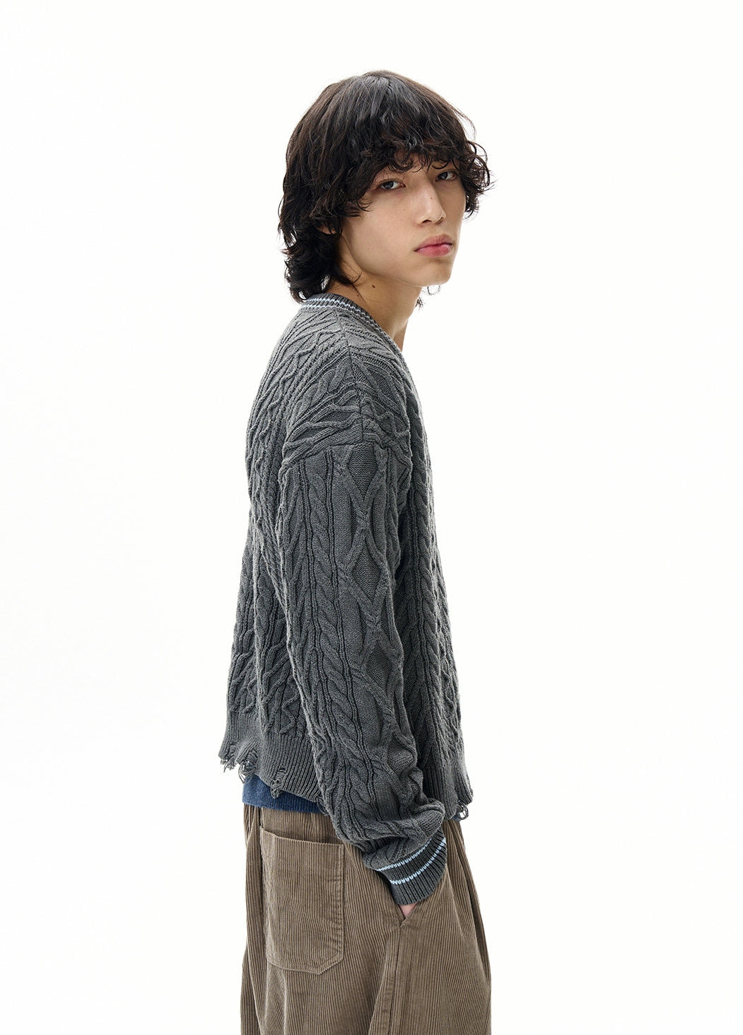 Contrast Distressed Trim Cropped Cable Knit Sweater
