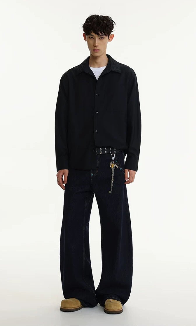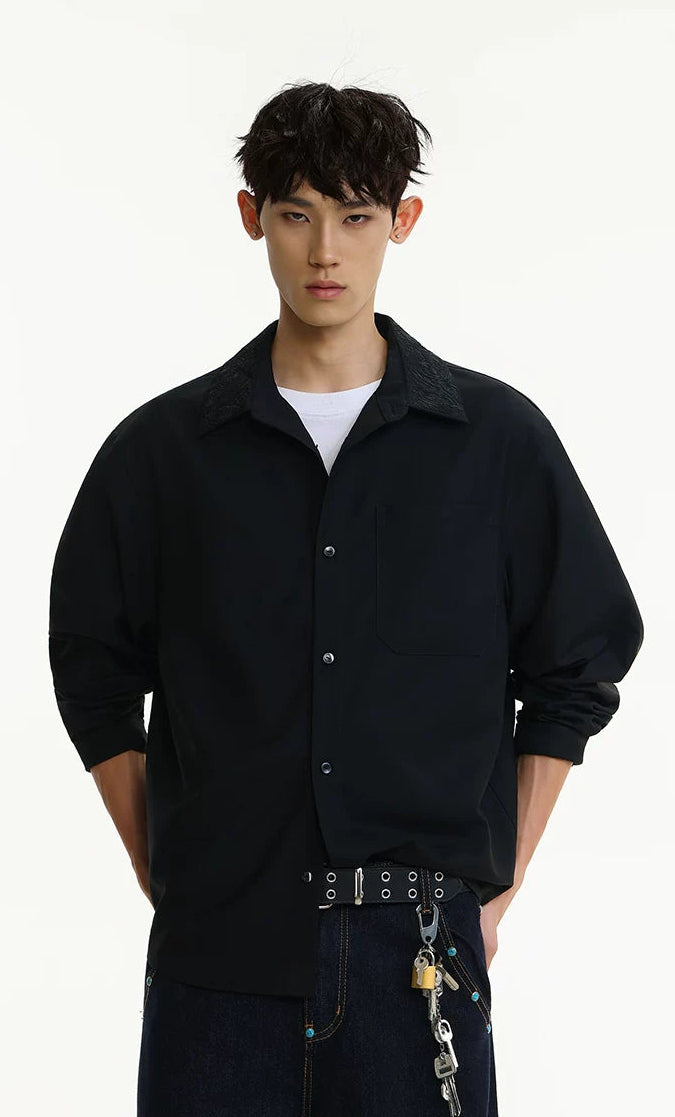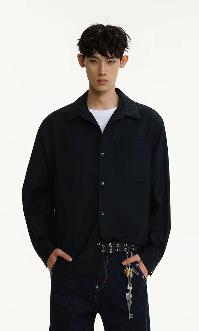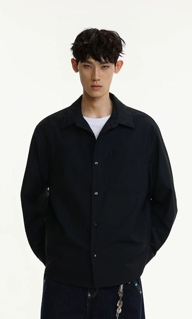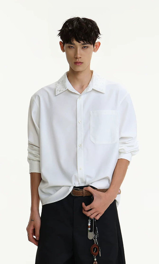 The distinctive embroidered collar detail adds depth without overdoing it, making it easy to wear but hard to ignore. Crafted from a smooth, medium-weight cotton blend, this shirt is cut with a relaxed silhouette for freedom of movement and laid-back structure. The minimalist design highlights sharp tailoring, while the single chest pocket and clean button front keep it grounded in function.
