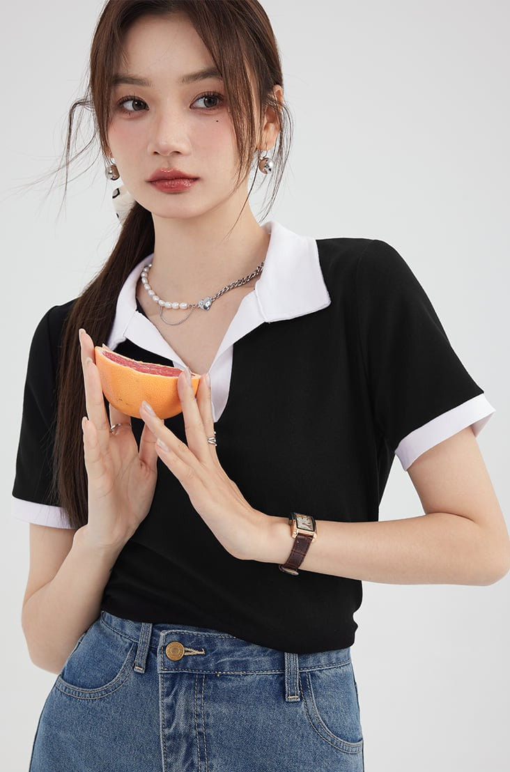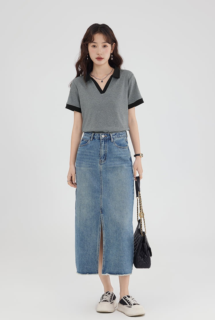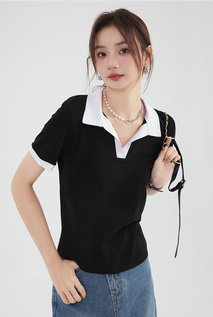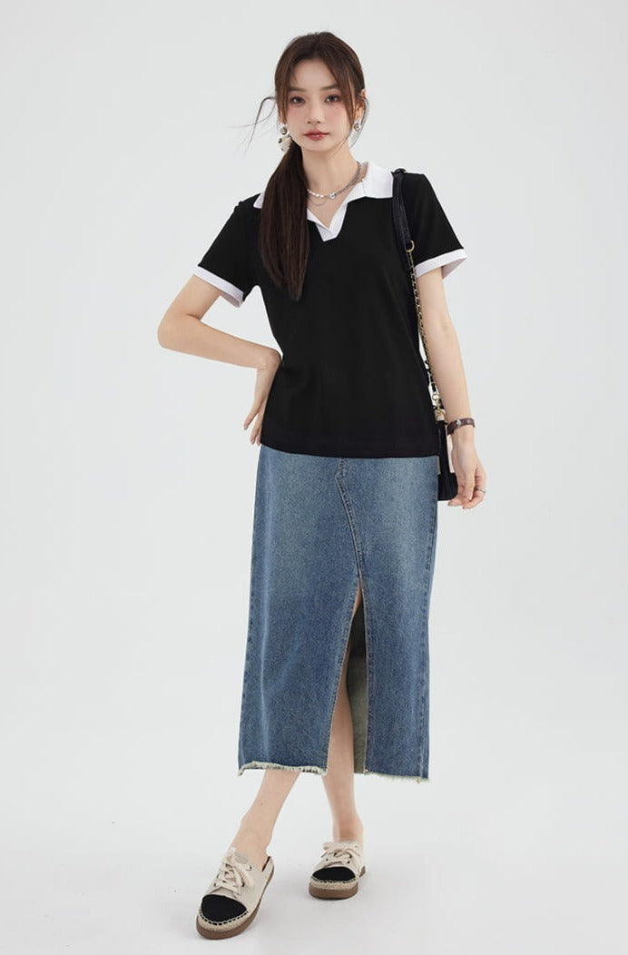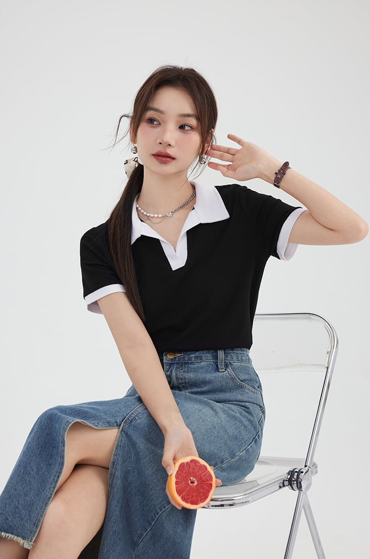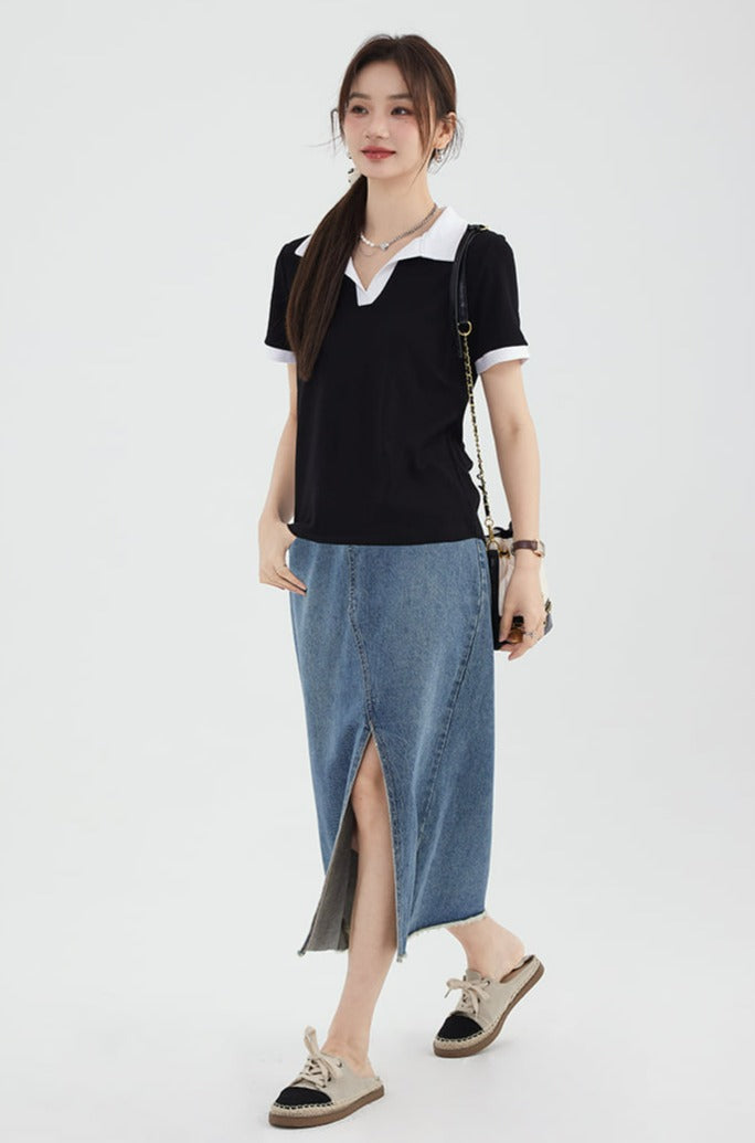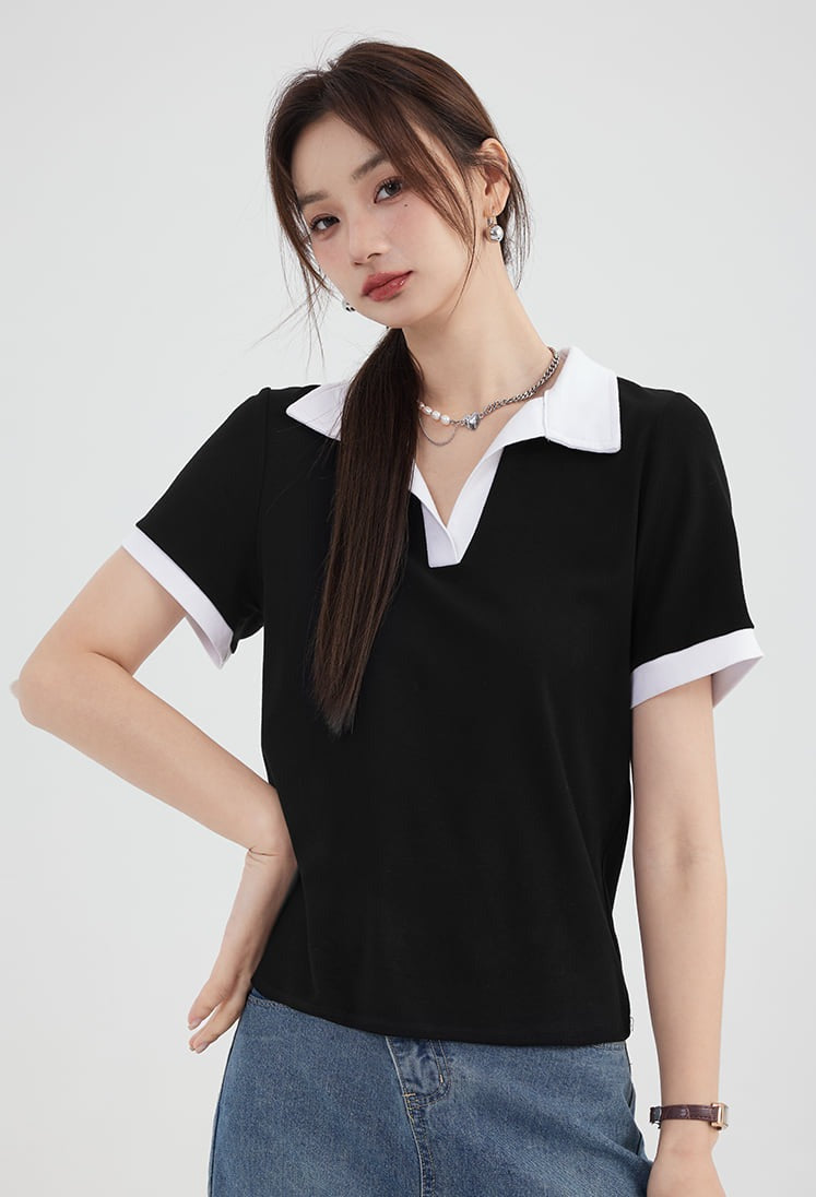 Read full Return PolicyLooking for a comfortable, casual alternative to t-shirts and tanks? Try Contrast Hem V-Neck Top! This top is made from a soft and stretchy fabric, so it will cling to your body and feel comfortable throughout the day. It also has a pair of front pockets for holding your wallet or keys, as well as a contrasting collar. Pair this top with pants or a skirt for that professional touch.