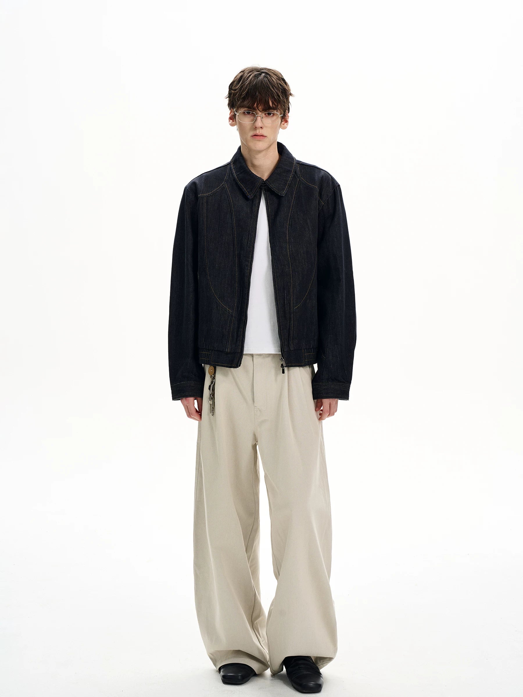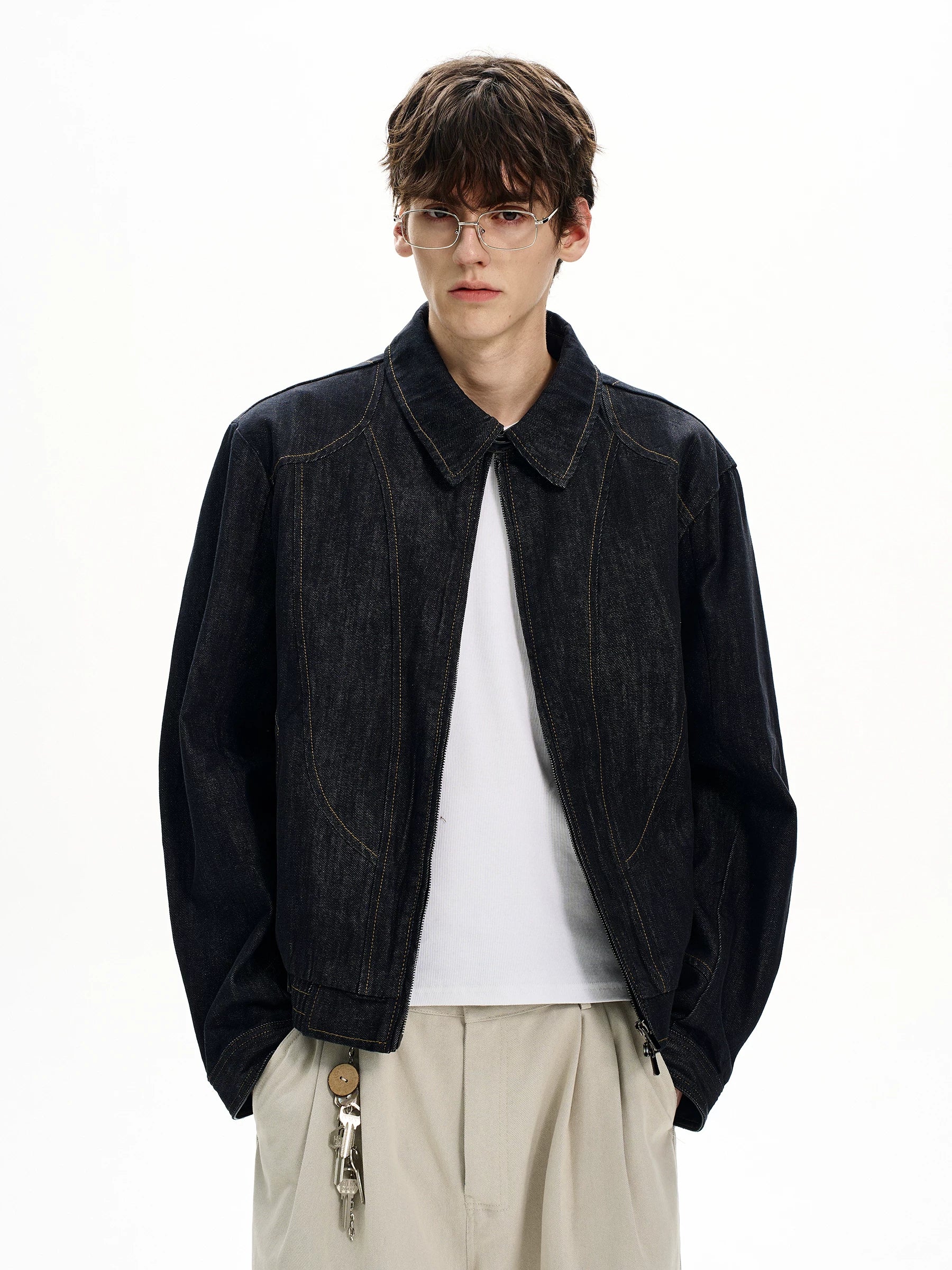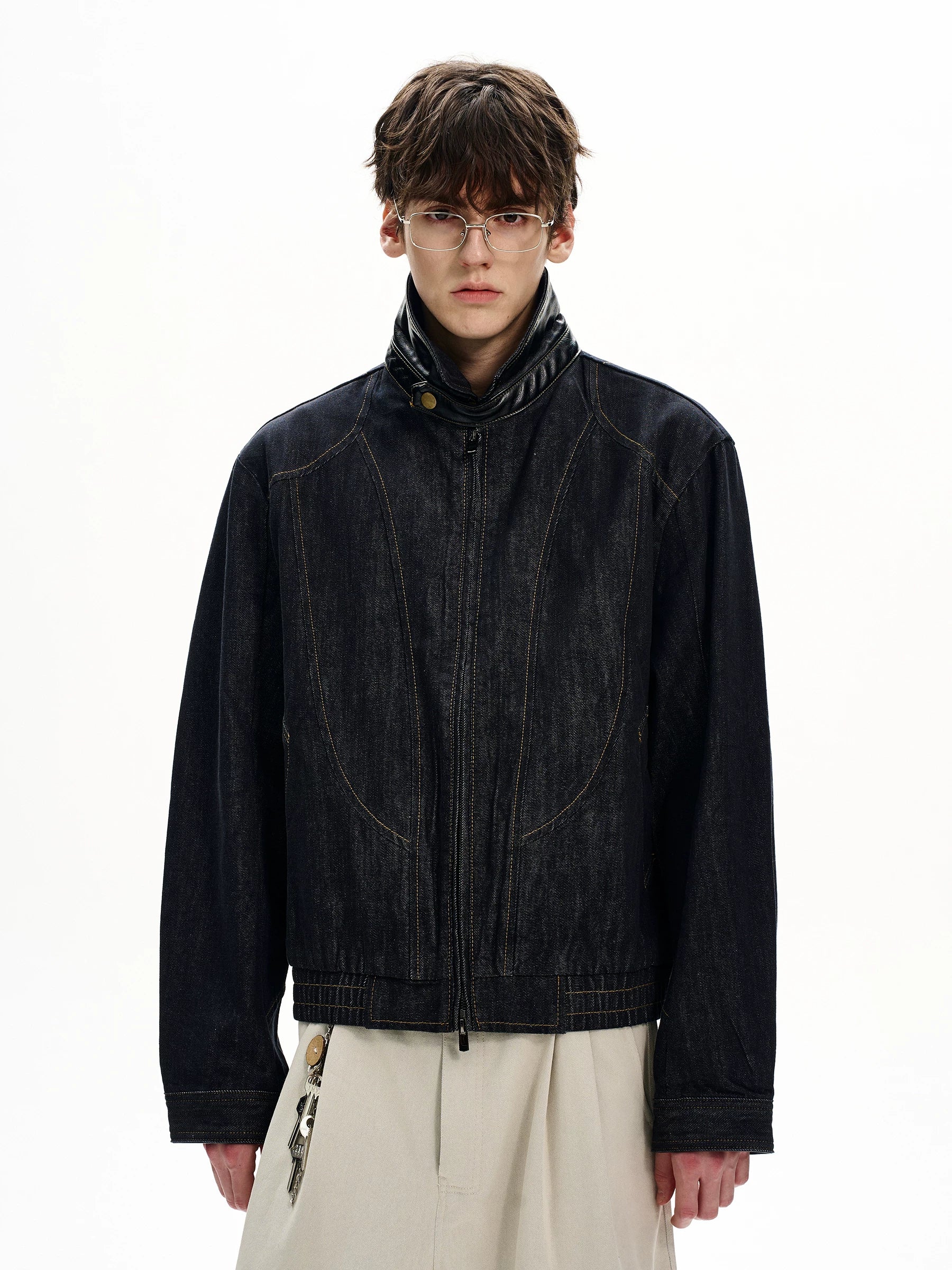 The heavyweight fabric and structured silhouette bring a sense of quiet confidence, blending utility with style in a way that's easy to wear but hard to ignore. Crafted from durable raw denim, it features tonal stitching and quilted leather at the collar for a subtle hit of texture. The zip front and elastic hem give it a slightly cropped Harrington-style fit that pairs effortlessly with cargos, wide-leg trousers, or tapered denim. Ideal for transitional weather, night outs, or layering over a hoodie—this is the kind of jacket that feels considered but not overthought.