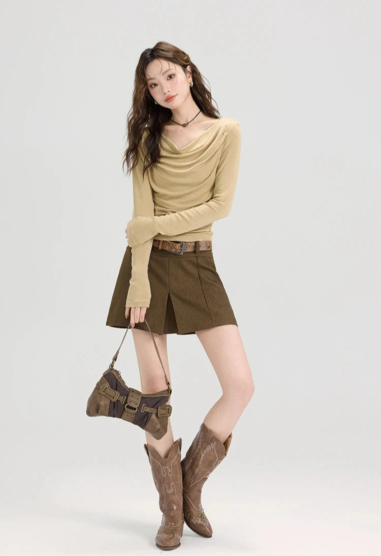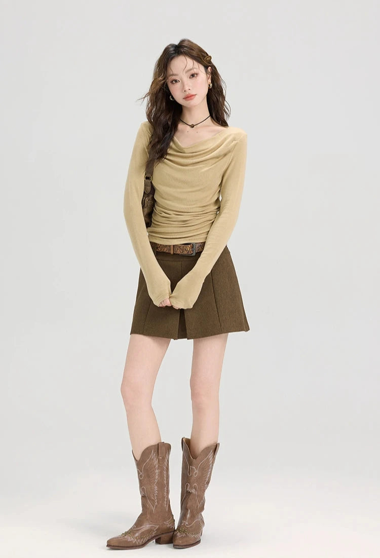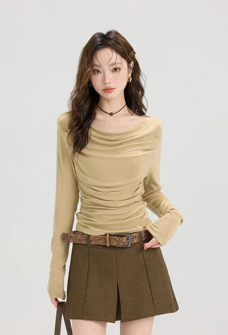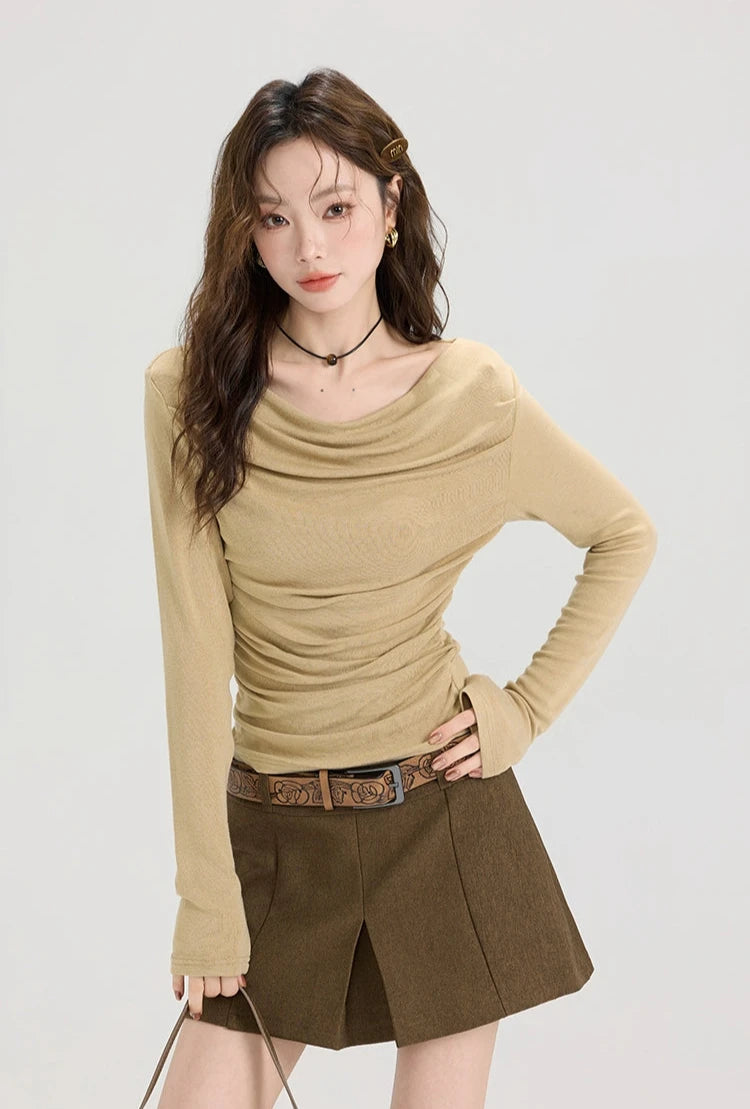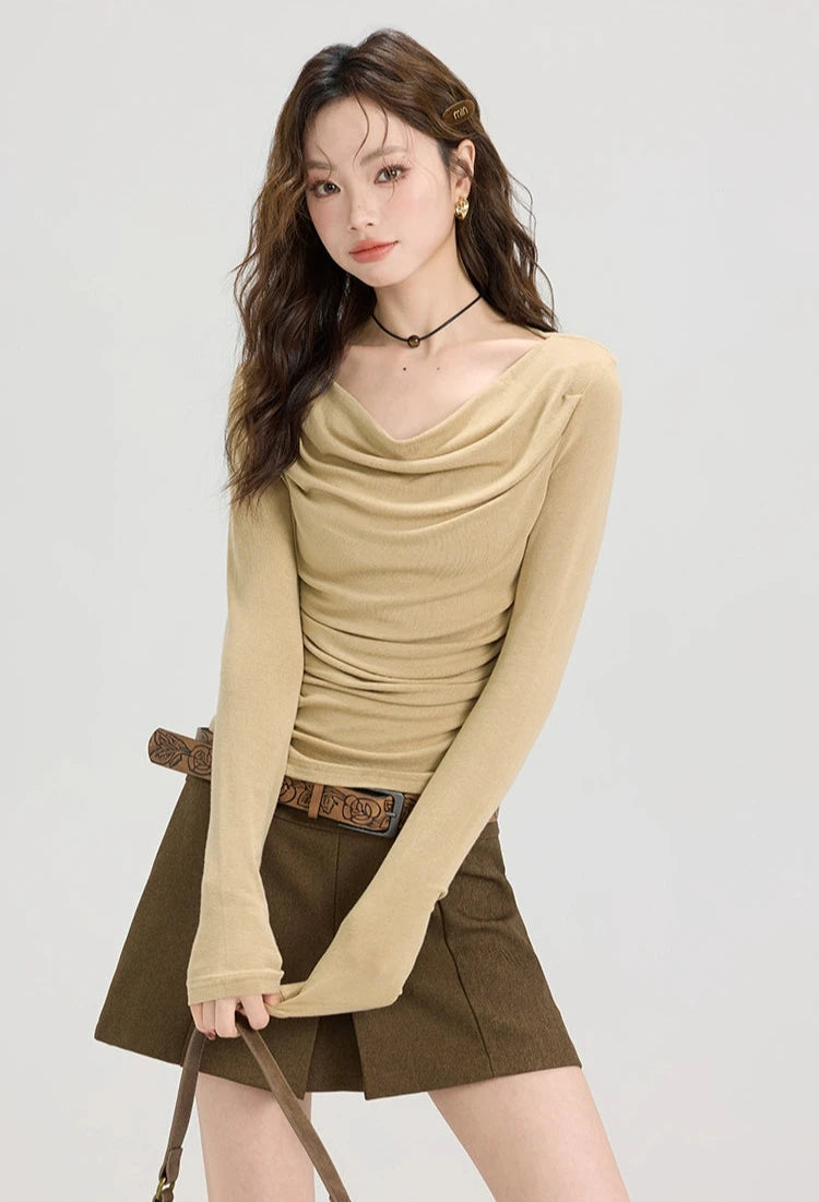 Designed with a cowl neckline that gently drapes for an elegant silhouette, this top is crafted from soft and stretchy fabric for a figure-flattering fit. The unique ruched sides add a touch of edginess, while the solid color ensures versatility and timeless appeal. Long sleeves make it an ideal choice for both casual and more dressed-up settings.