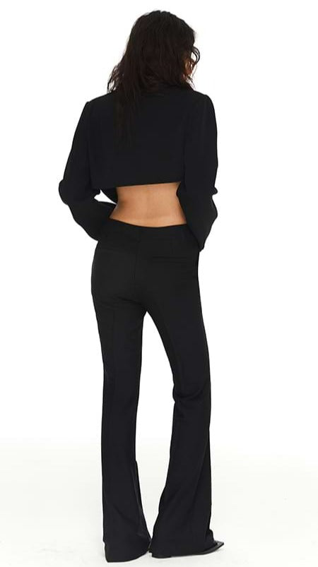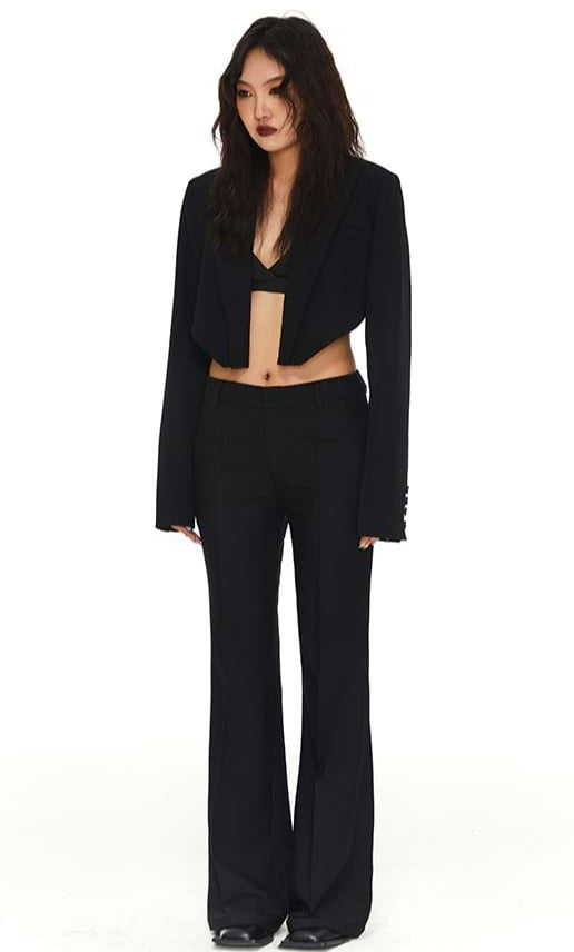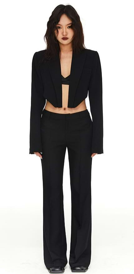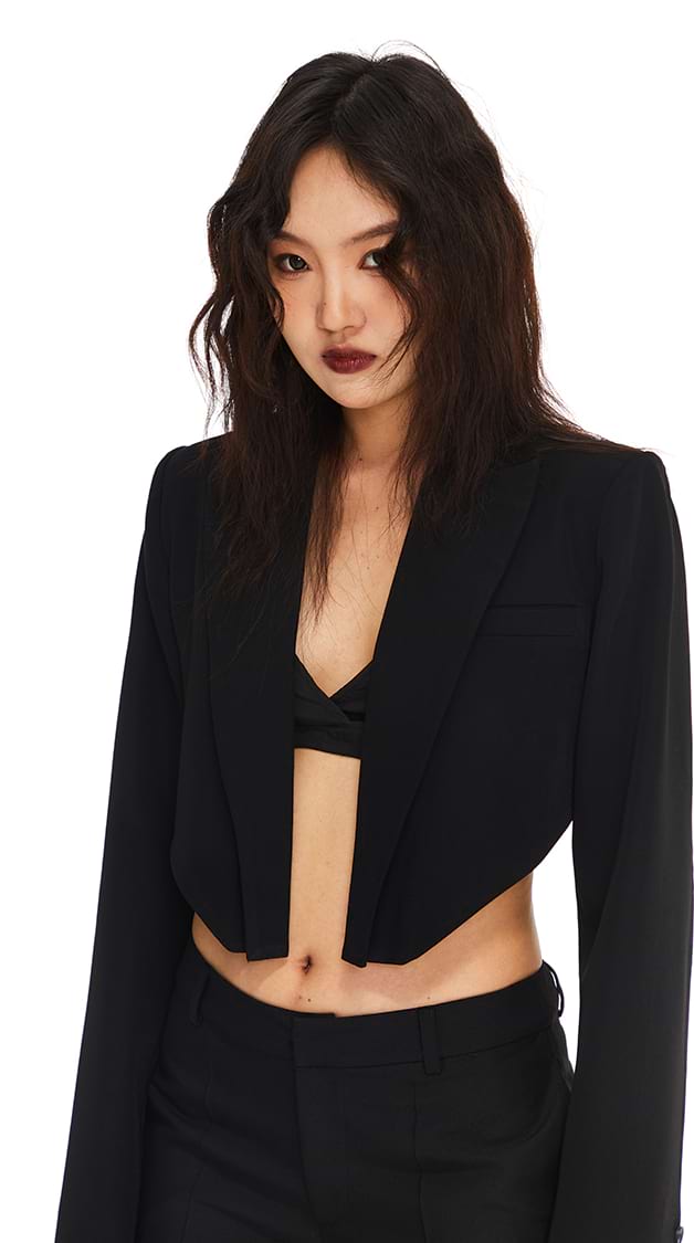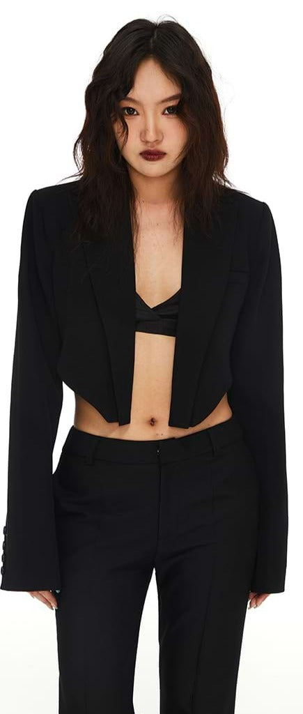 Read full Return PolicyStay cool and stylish in this Cropped Blazer with Pointed Hem. Perfect for hot days, this blazer is designed to be worn with any pants, or for a more casual look, wear a cropped tube top or sports bra underneath. Show off your summer style with this versatile piece.
