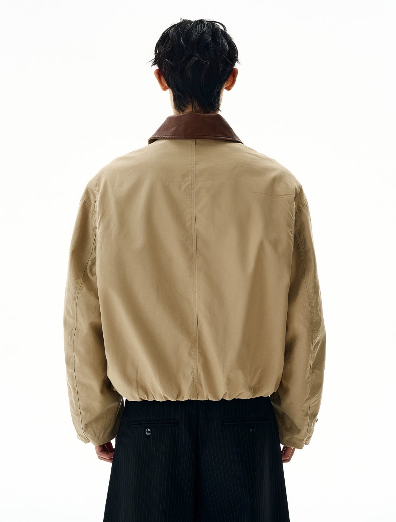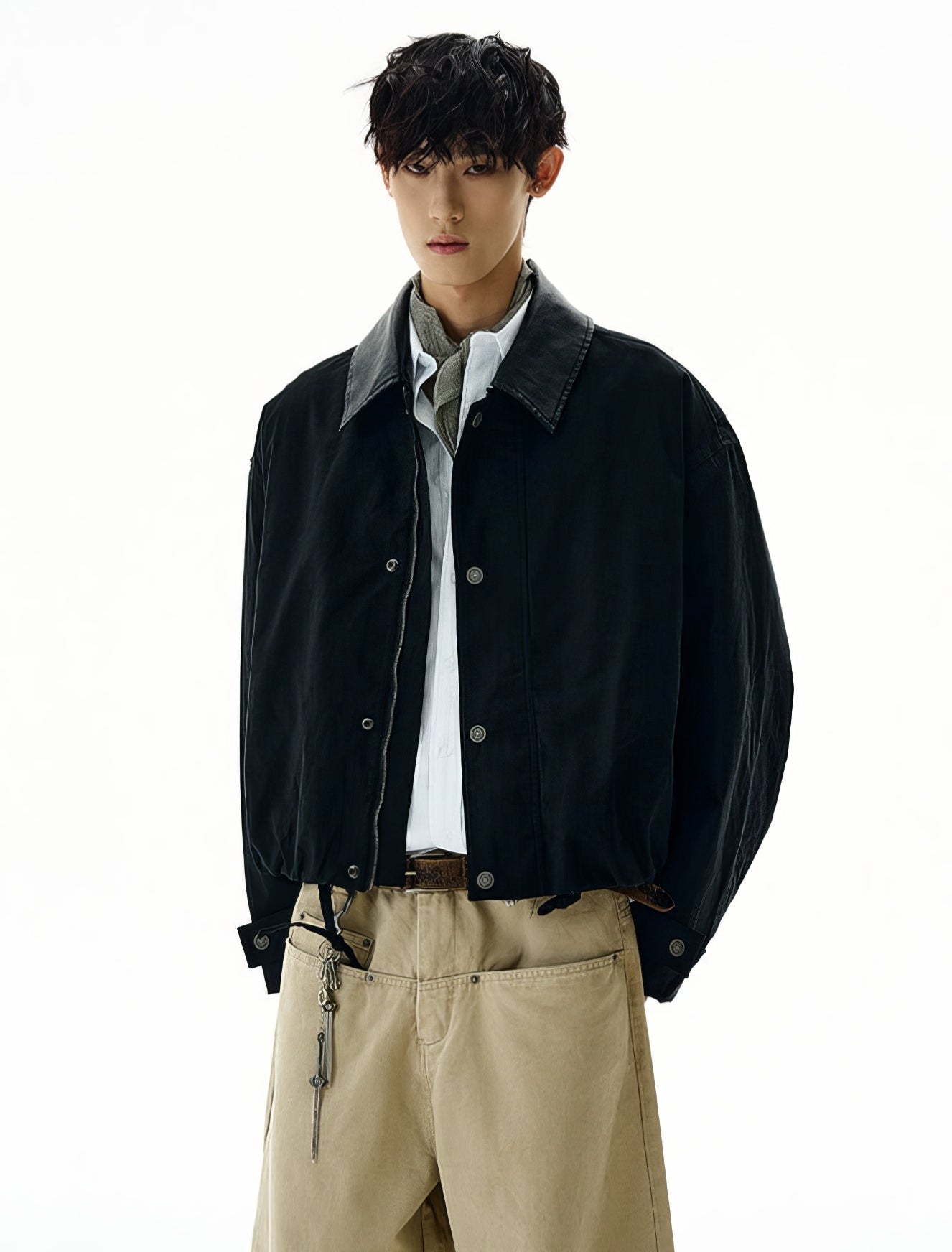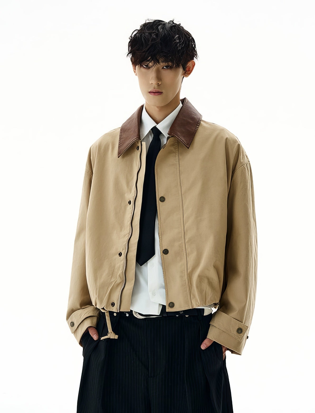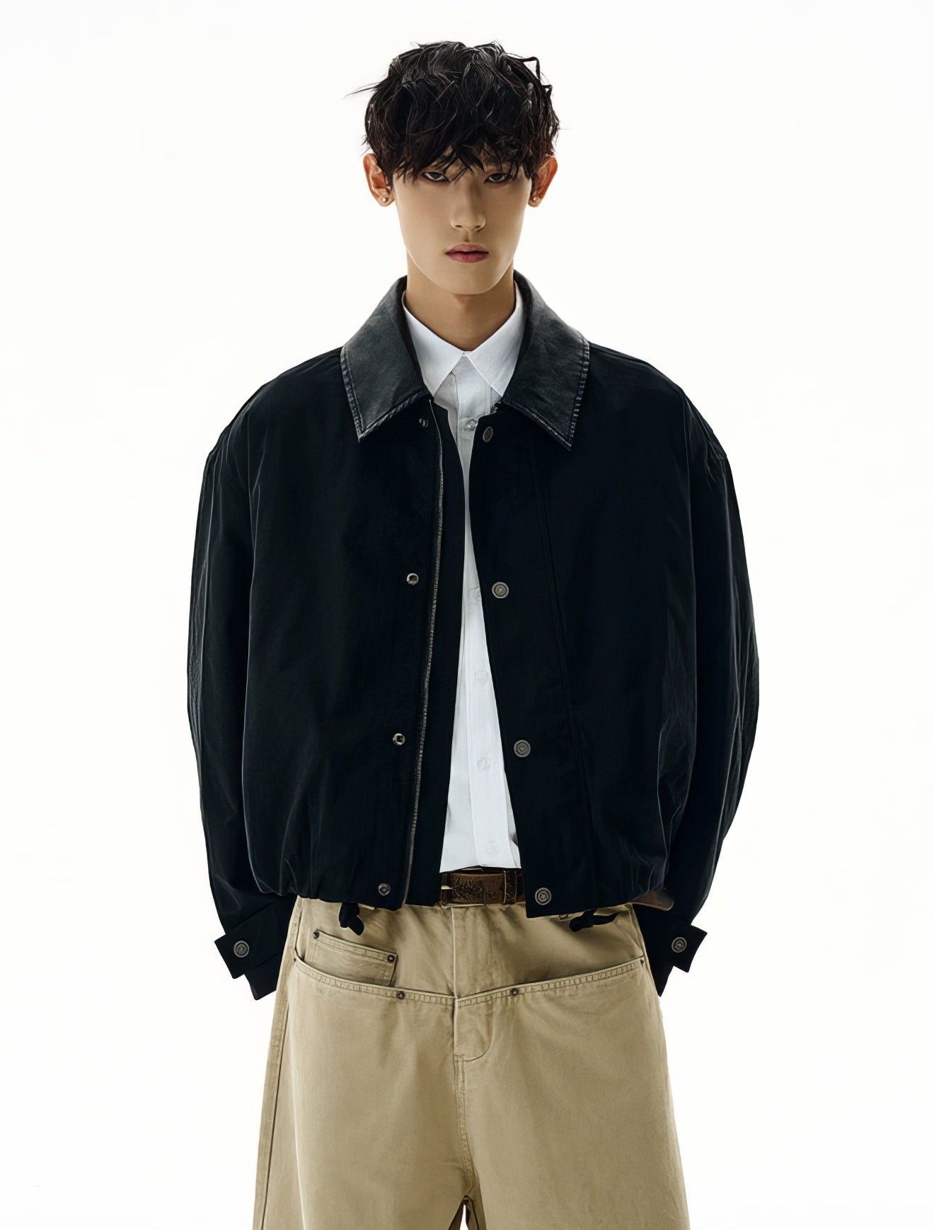 Cropped Contrast Leather Collar Zip Worker Jacket
