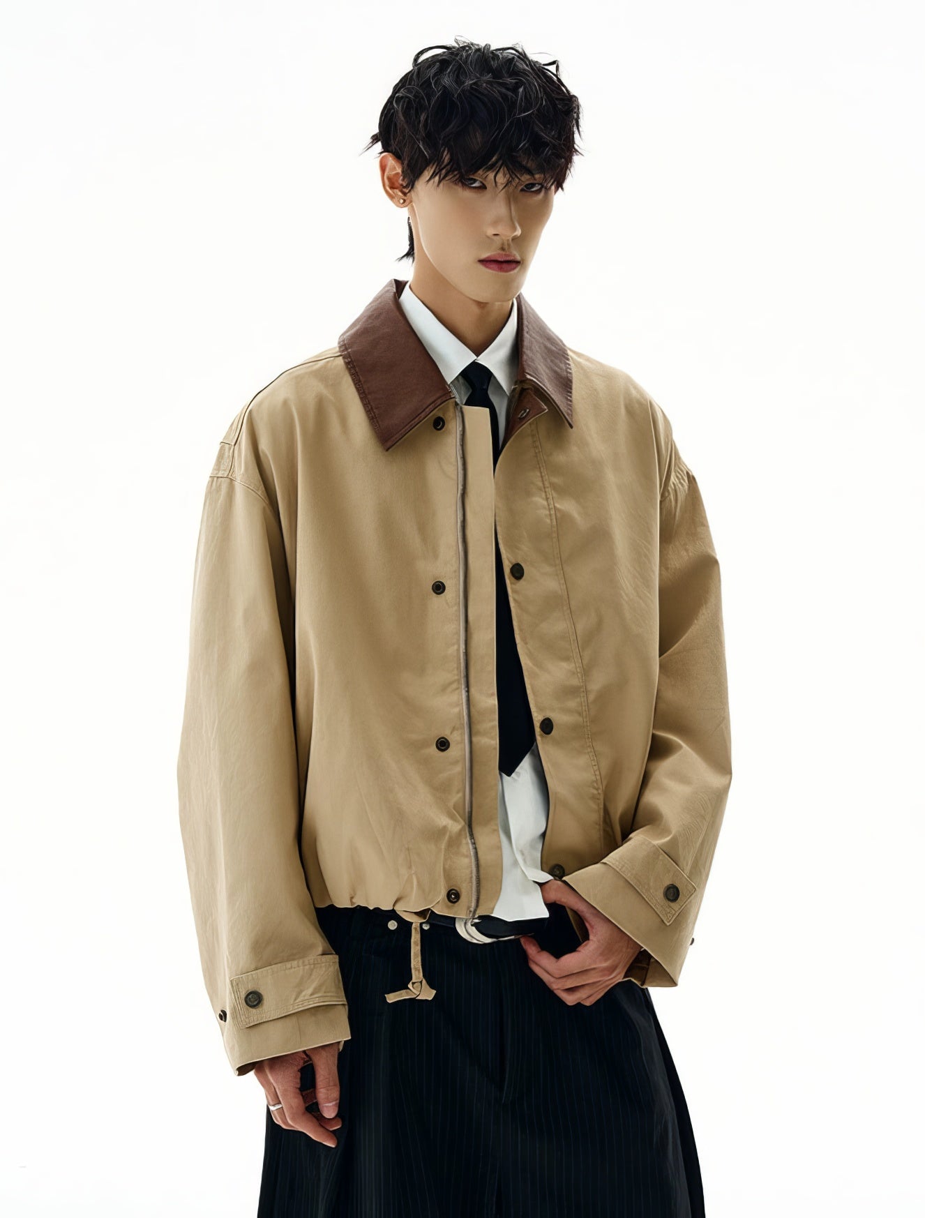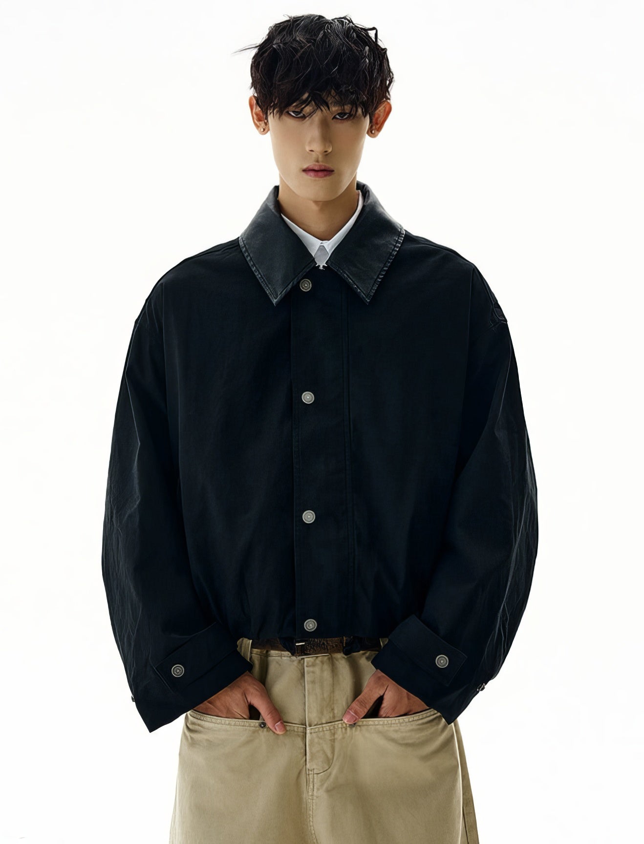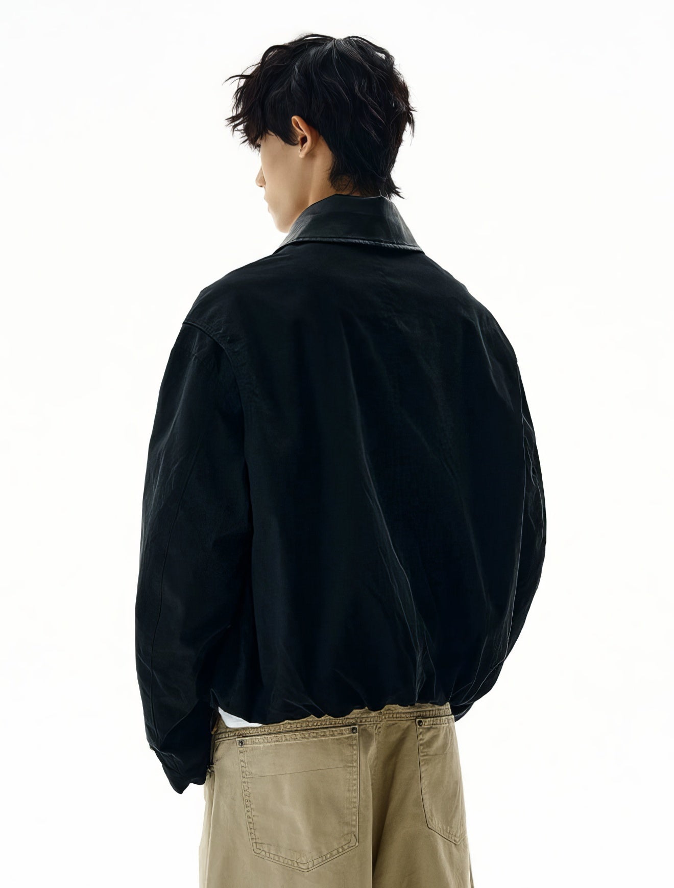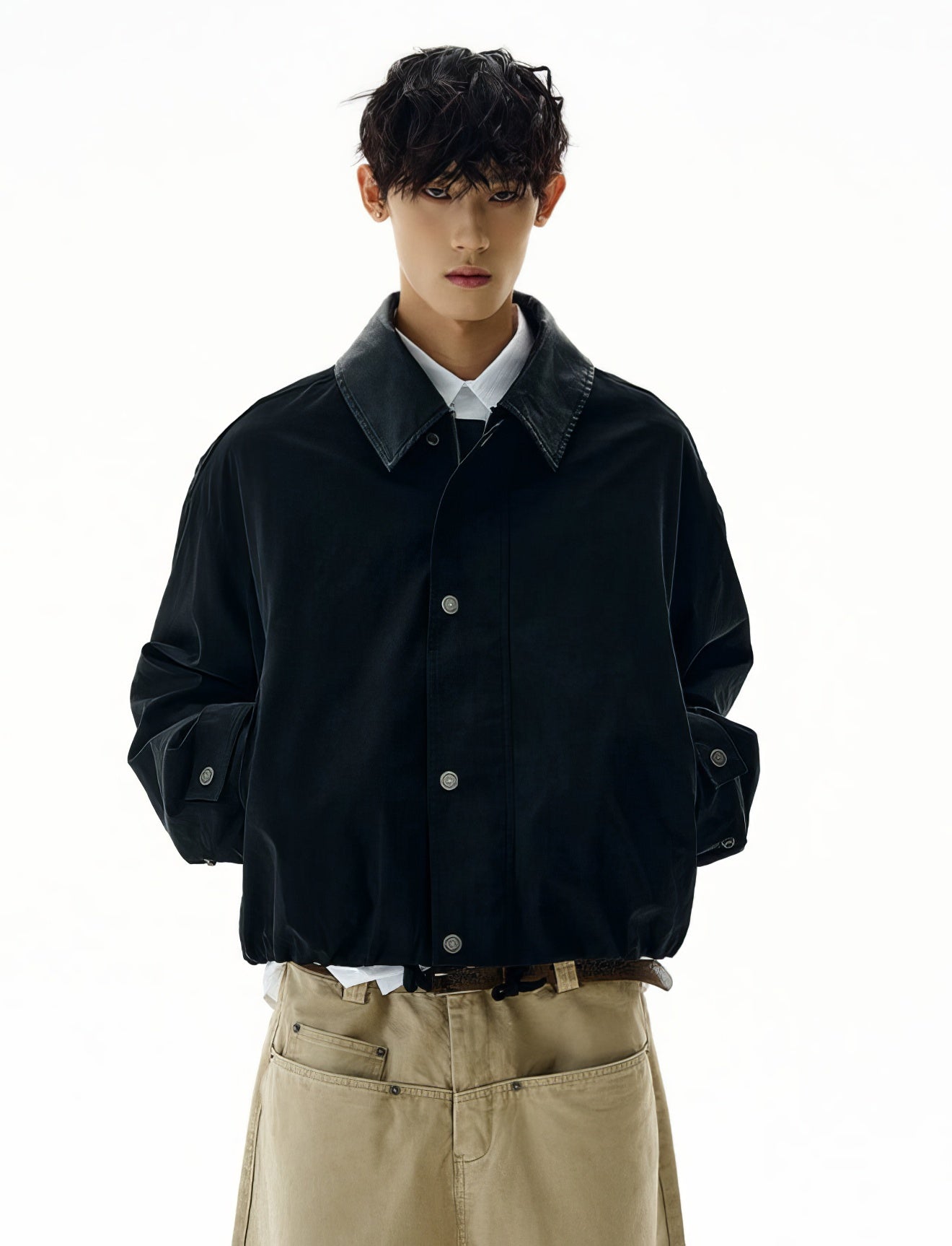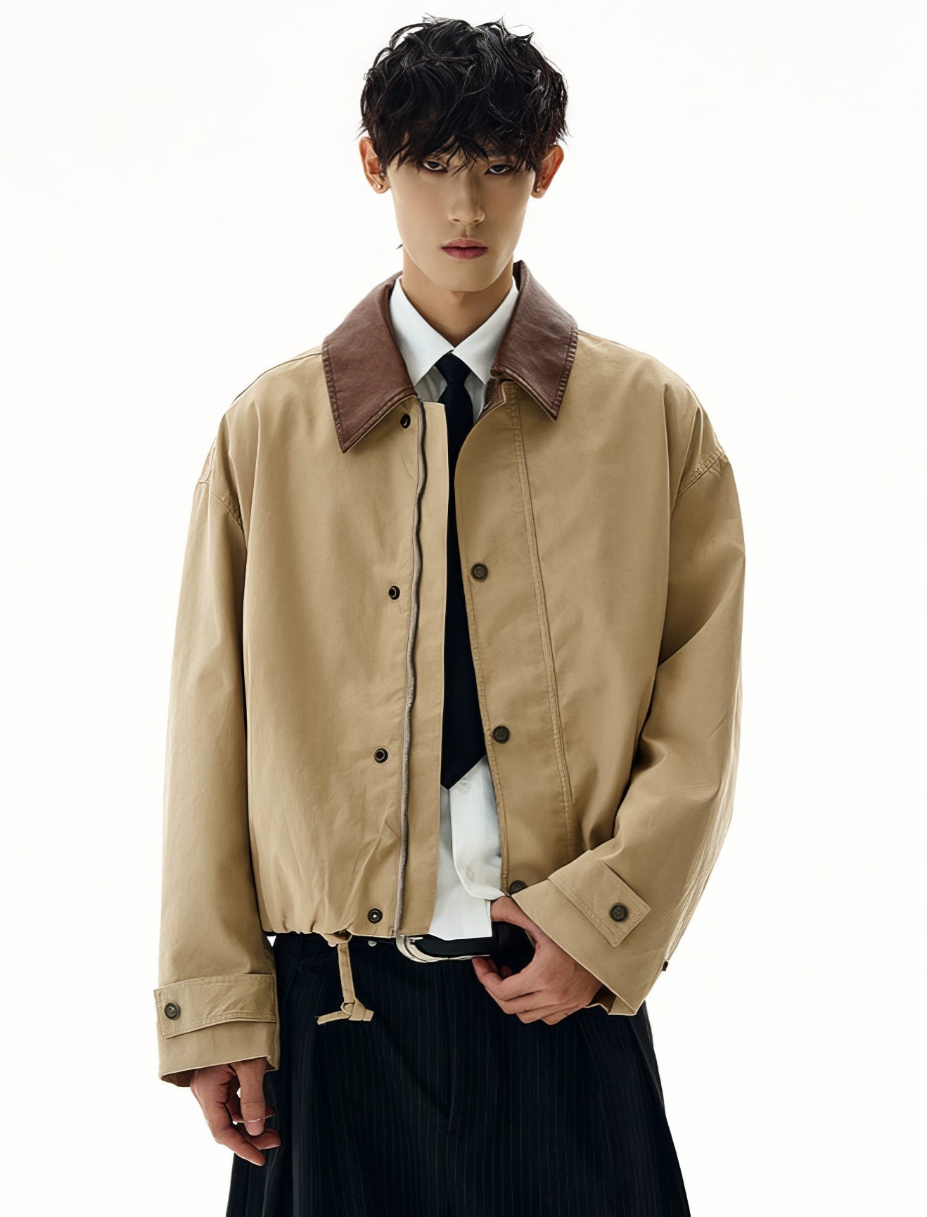Cropped Contrast Leather Collar Zip Worker Jacket