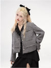 Cropped Tweed Jacket with Fringe Trim and Faux Pearl Details