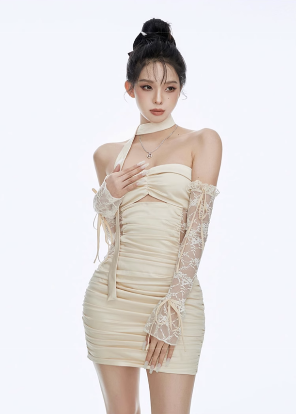 Cutout Lace Bodycon Ribbon Mini Dress with Sleeves