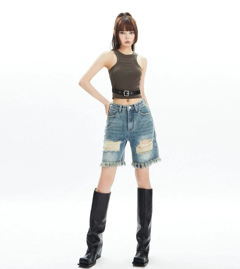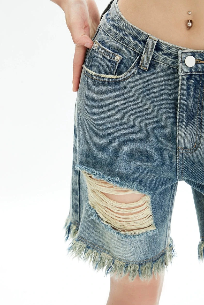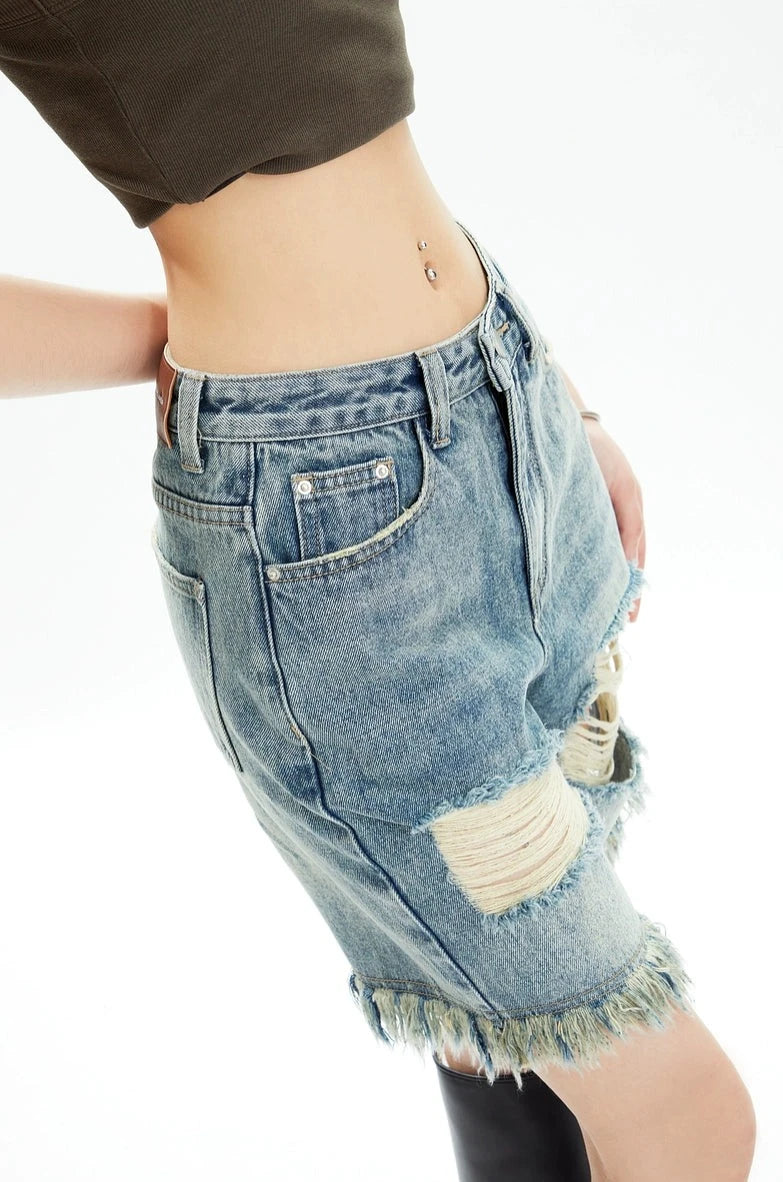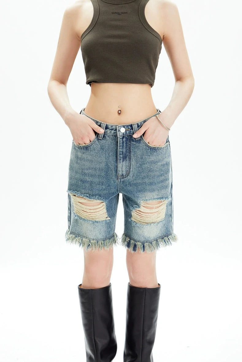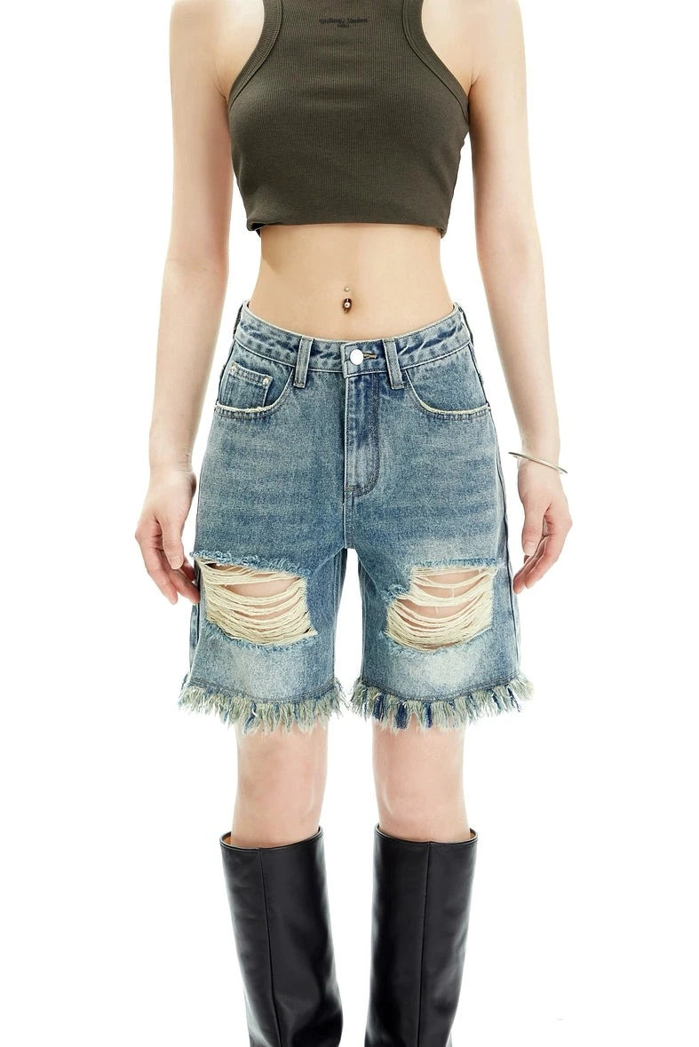 Read full Return PolicyEmbrace your bold and carefree style with these Distressed Denim Bermuda Shorts, a must-have addition to your edgy wardrobe essentials.