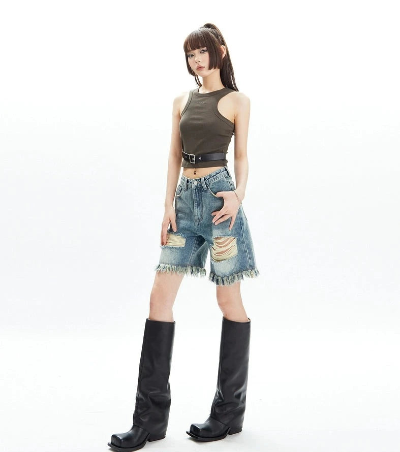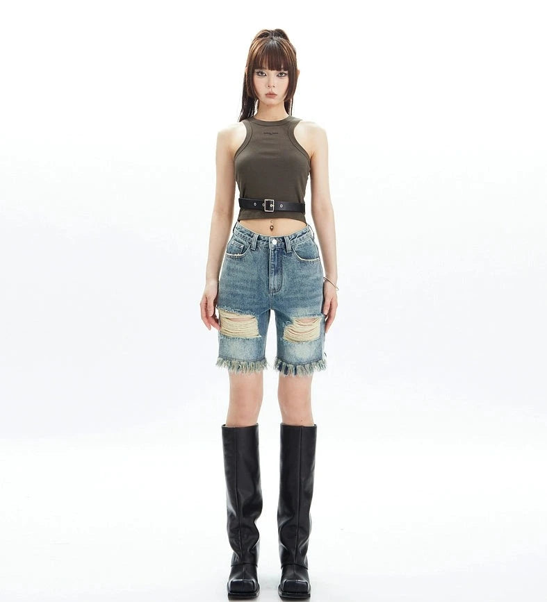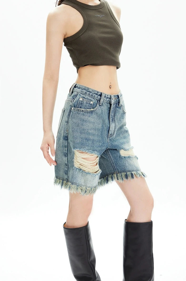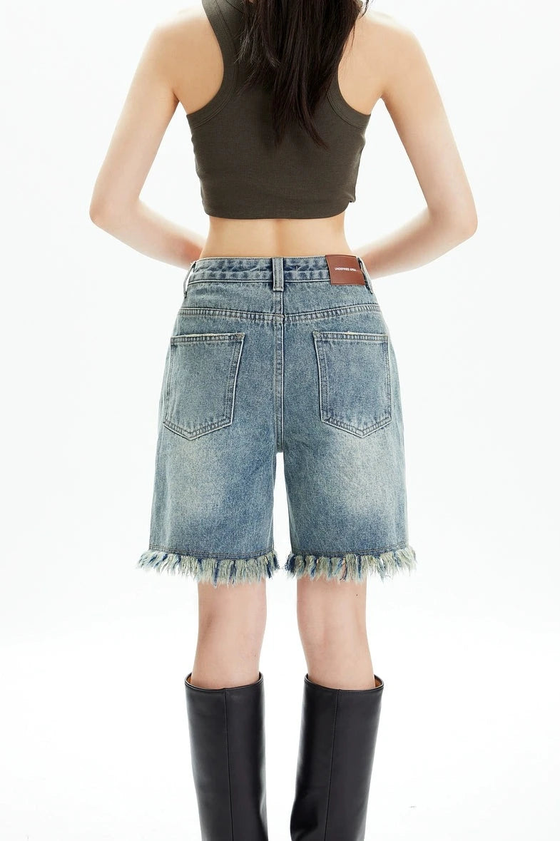 Distressed Denim Bermuda Shorts with Frayed Hem