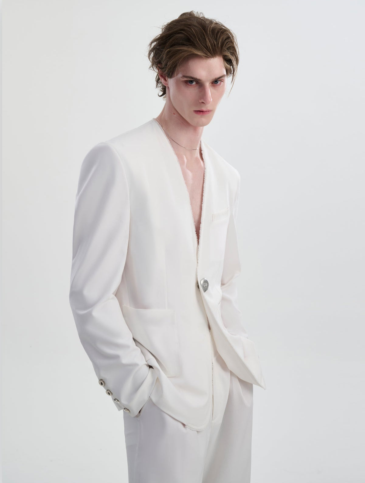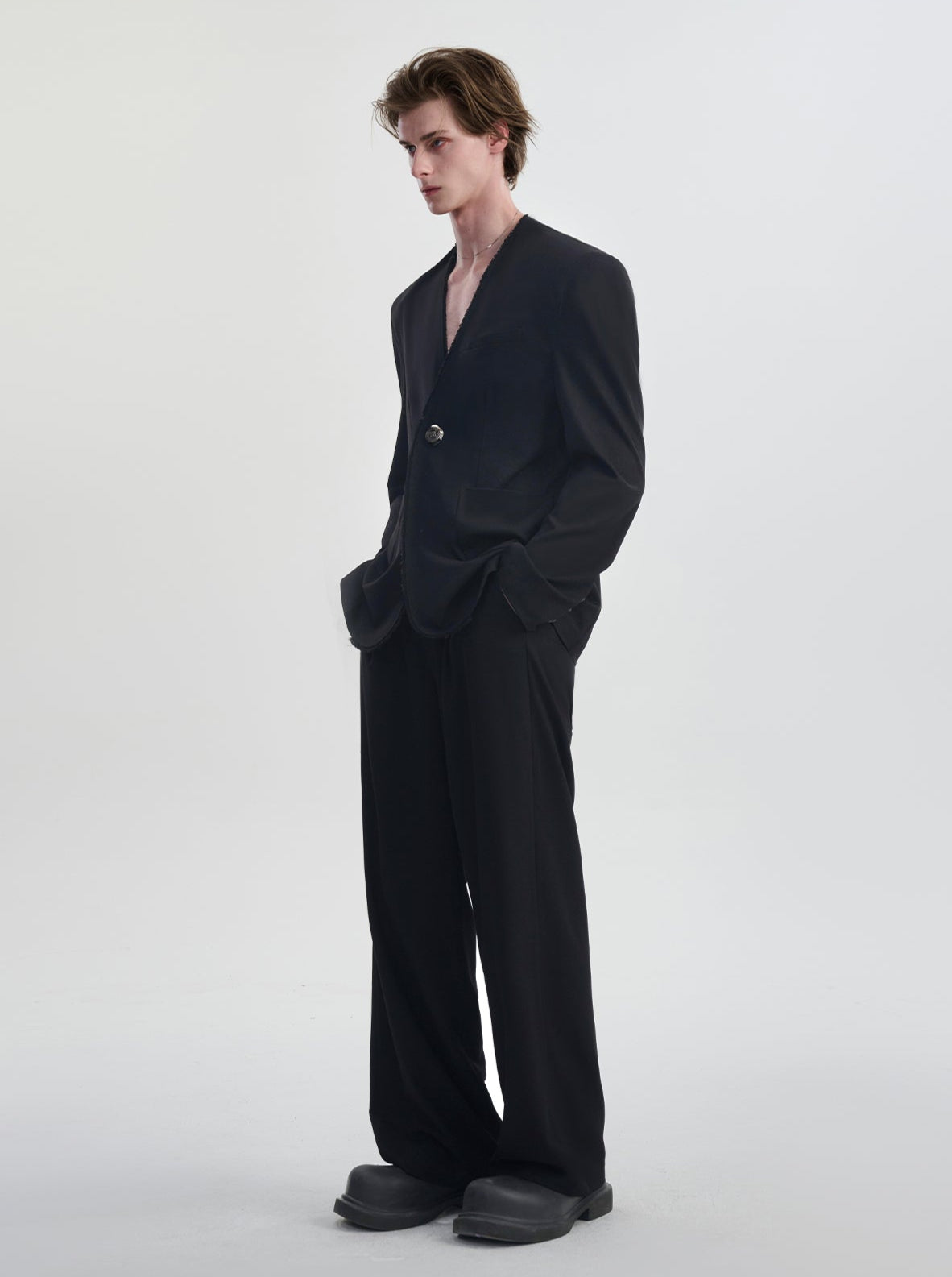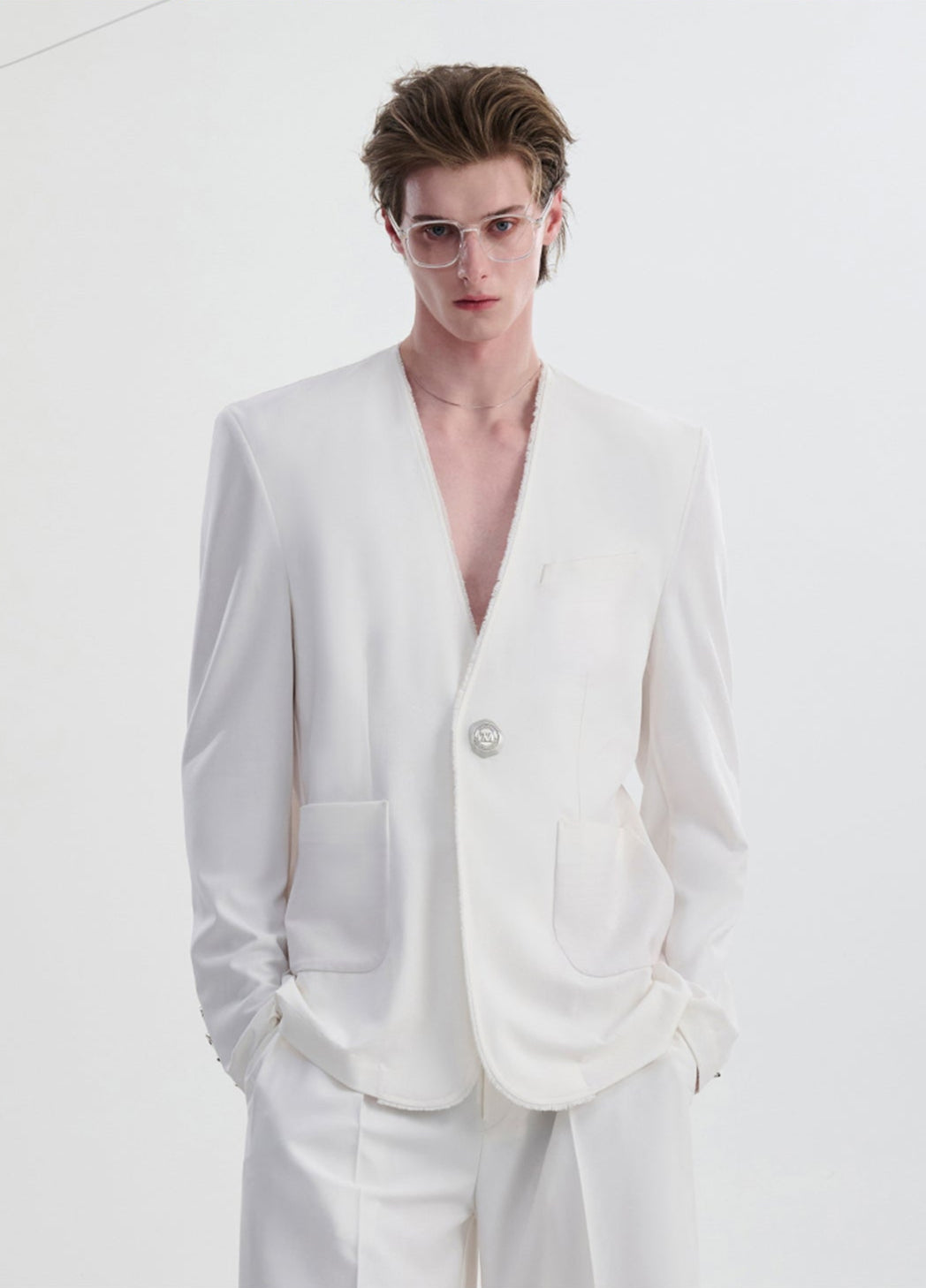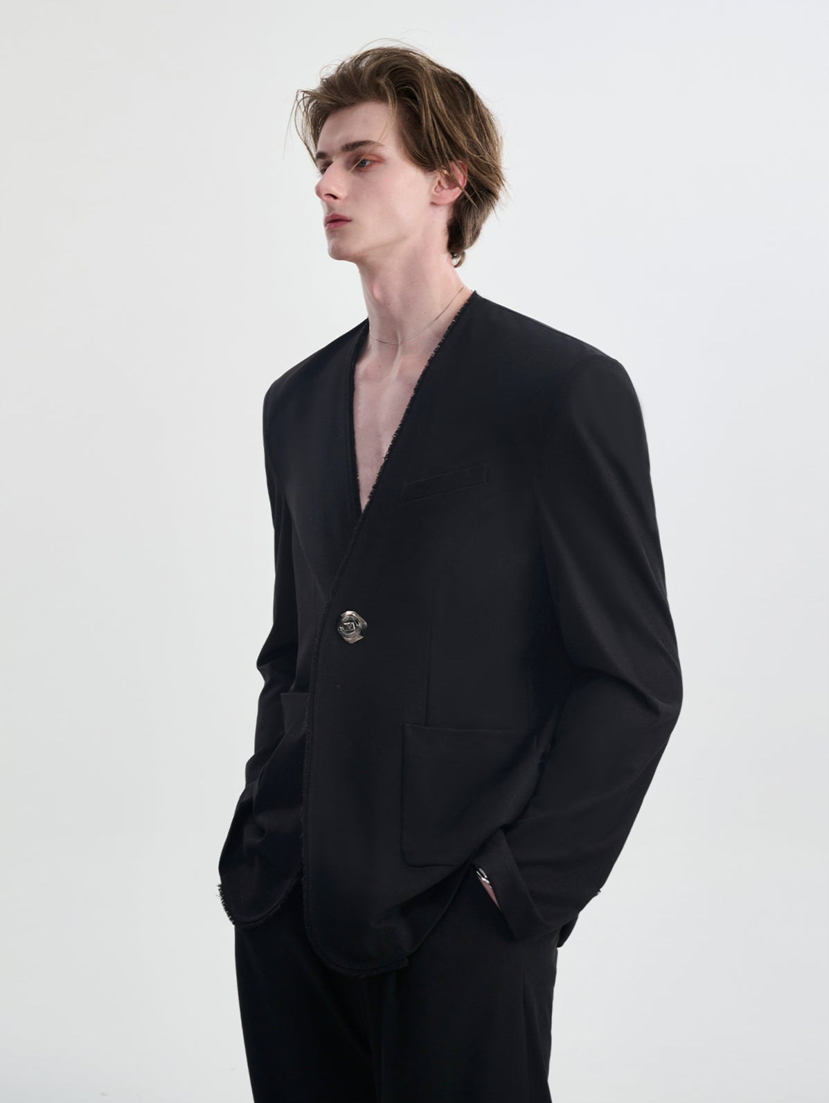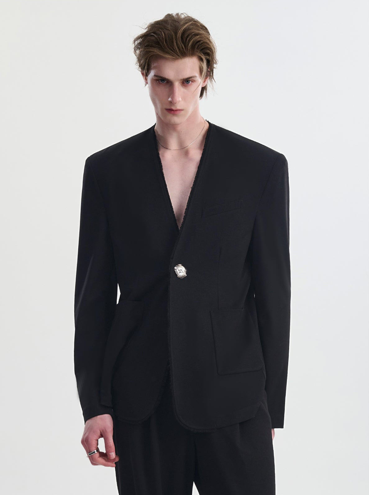 Designed with a subtly raw, frayed hemline, this blazer strikes the balance between sharp tailoring and effortless edge. Crafted from a polyester-rayon blend with a touch of spandex, the fabric offers a smooth drape with a hint of stretch for comfort. The lightweight construction enhances breathability, while the single-button closure and relaxed fit create an easy-going silhouette. Patch pockets add a casual finishing touch, making it a versatile piece that works just as well over a crisp button-down as it does layered with a graphic tee.