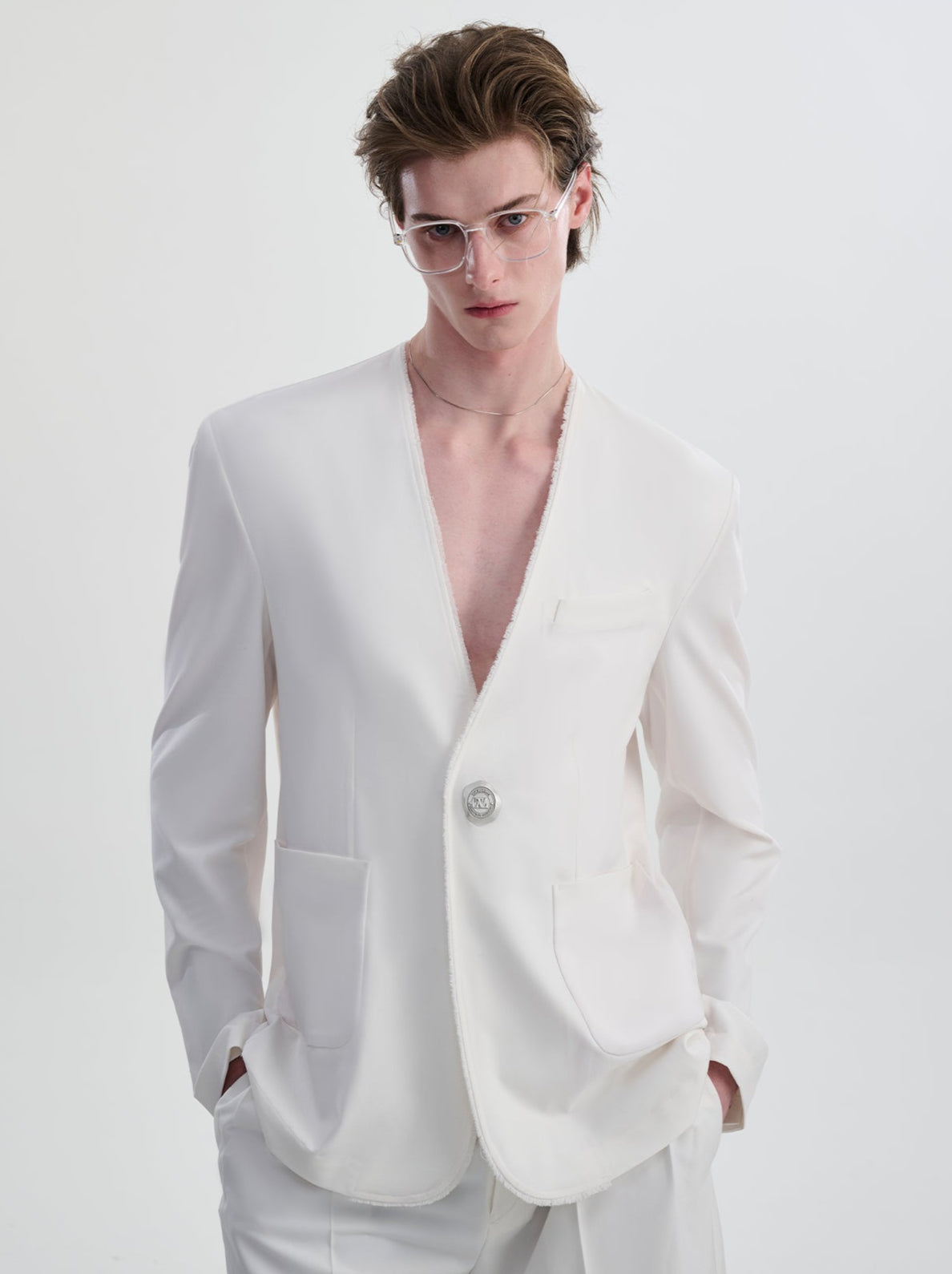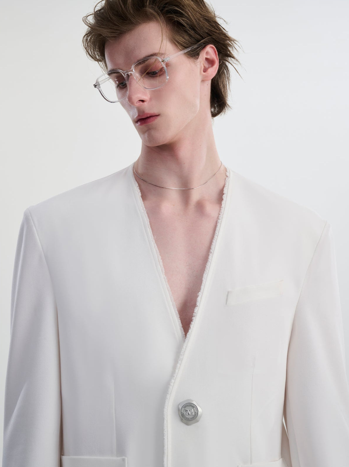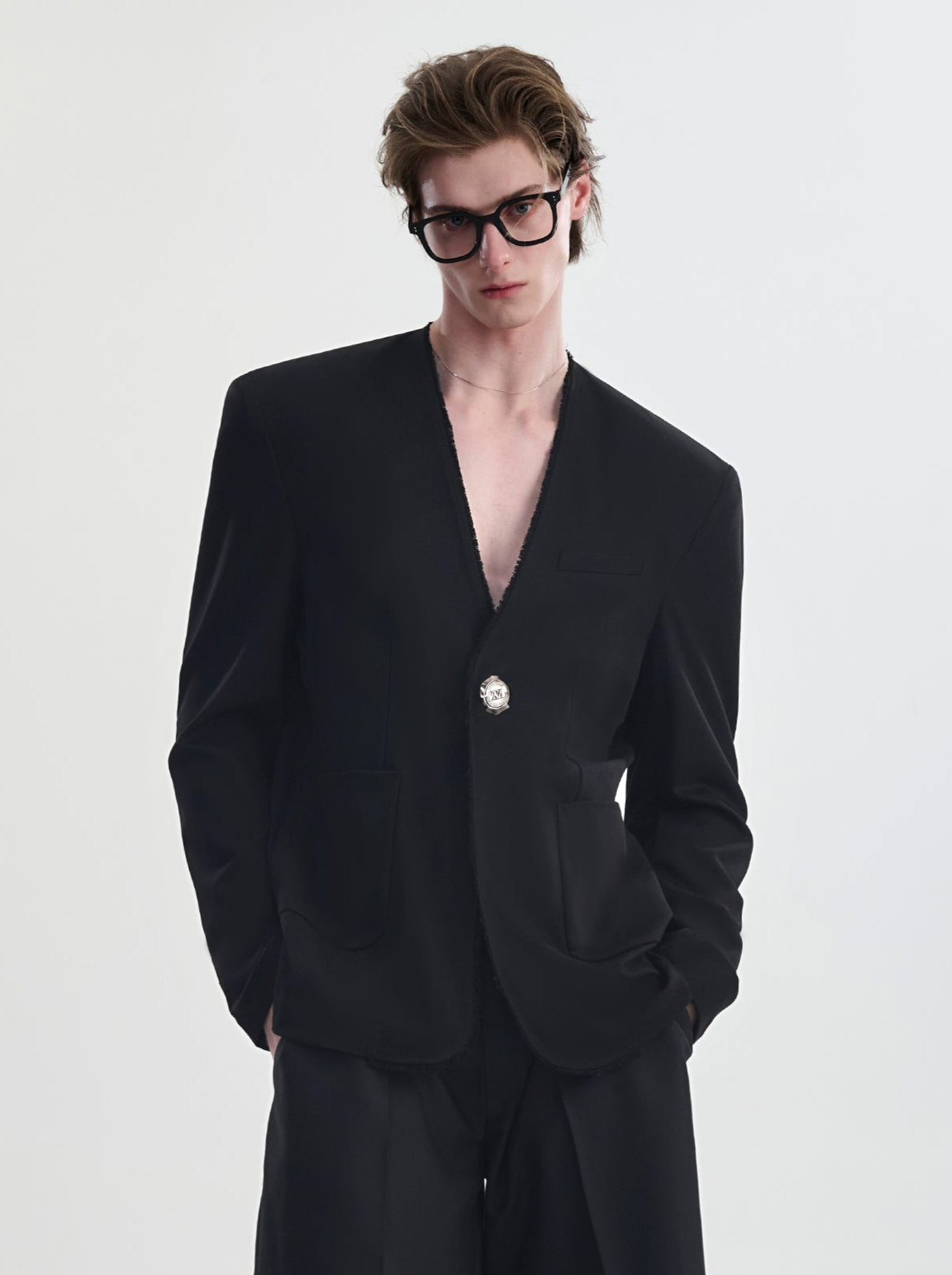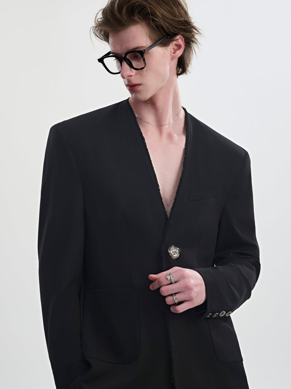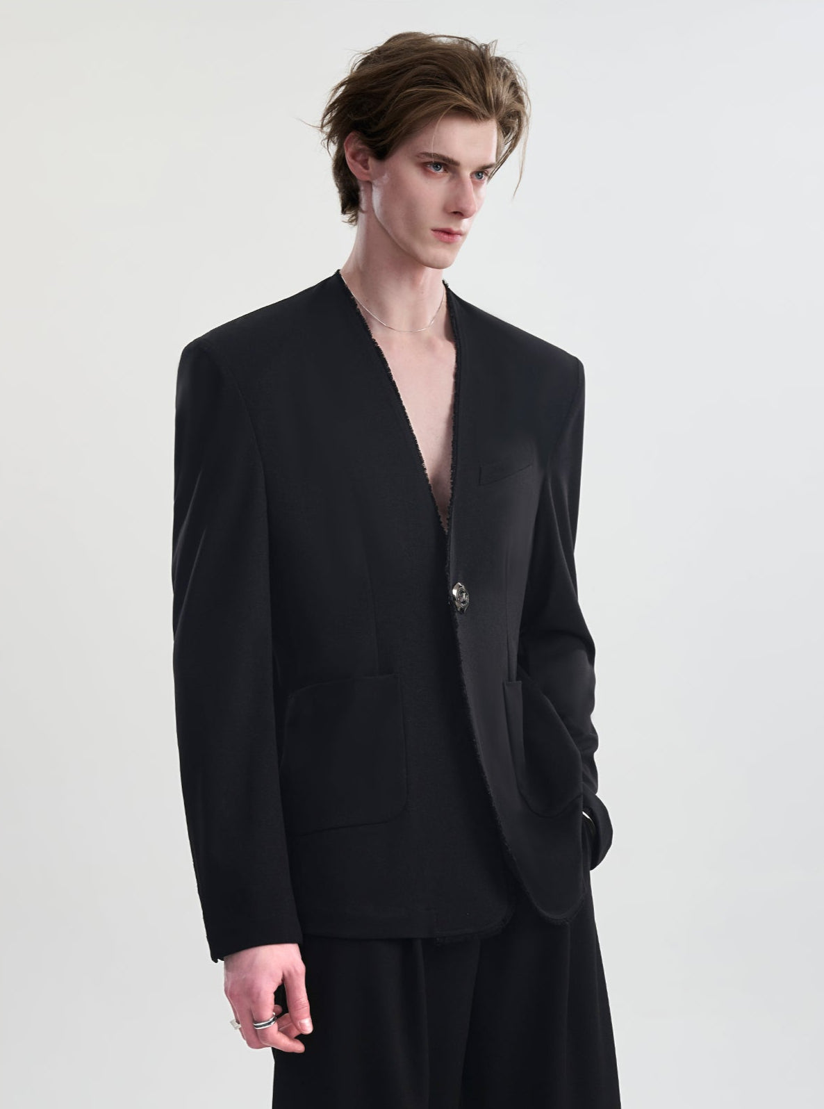 Distressed Hem Single Breasted Blazer with Patch Pockets