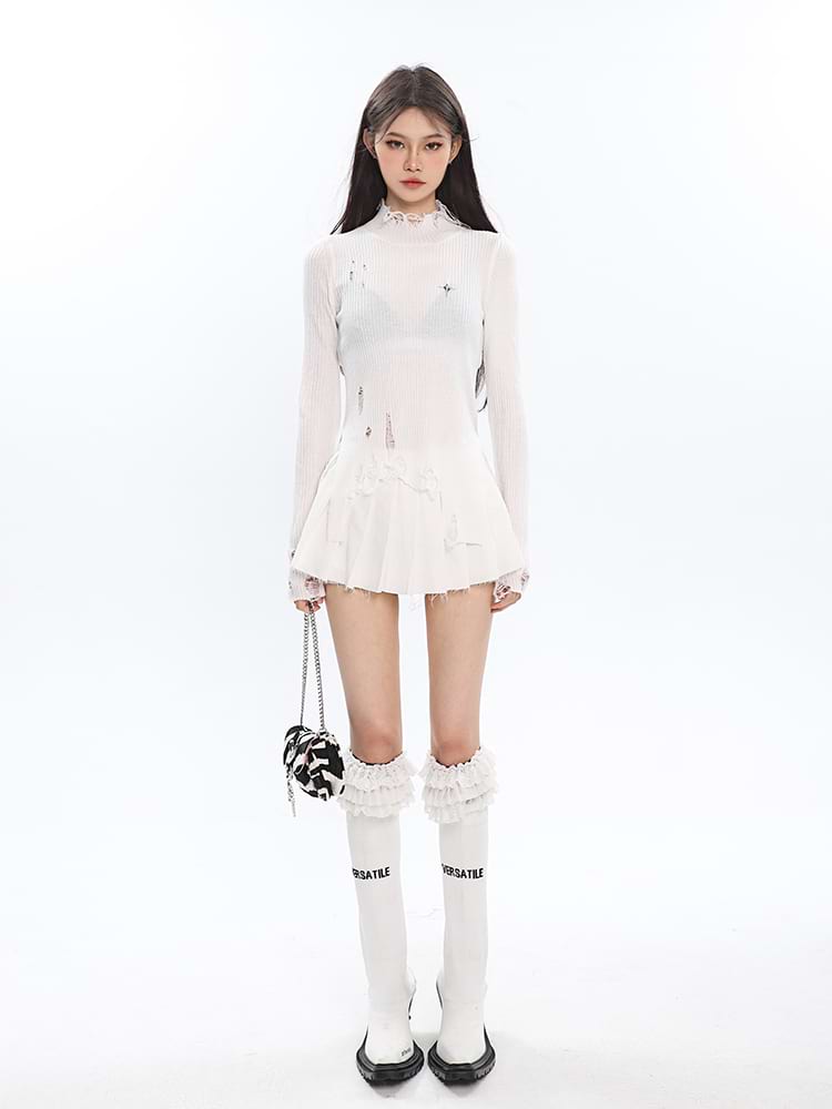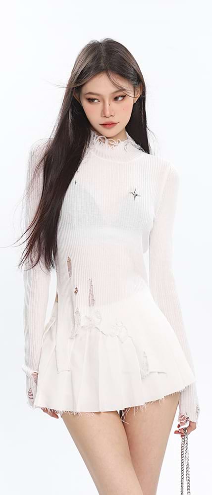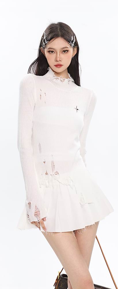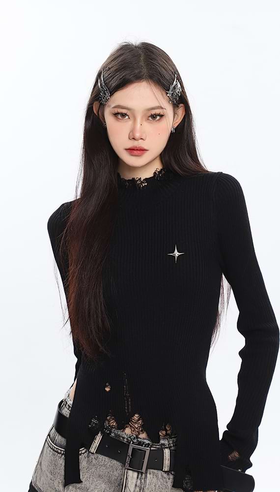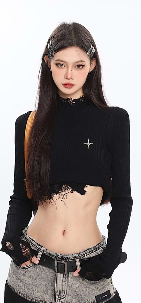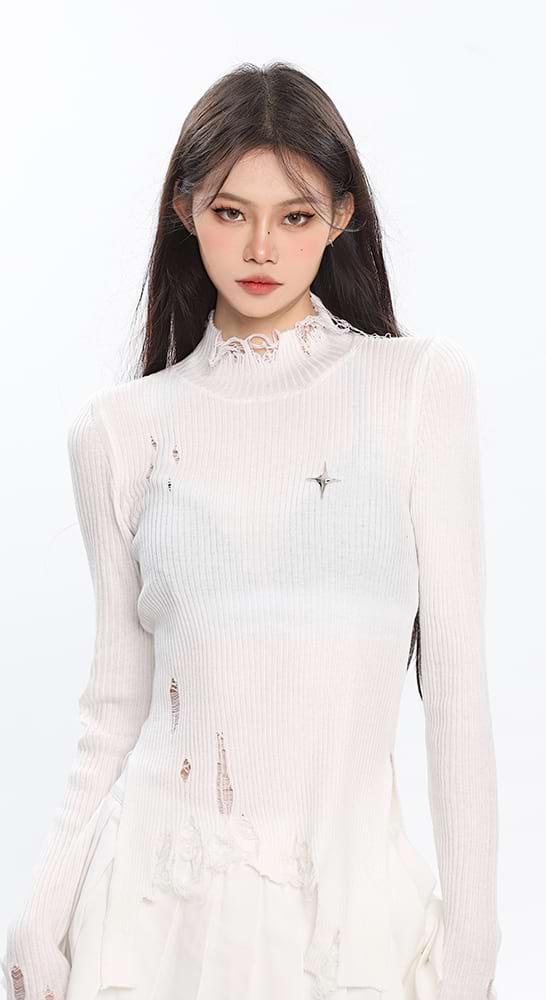 Read full Return PolicyLook stylish and chic with this distressed high neck long sleeve top. Its distressed details and versatile neckline create a timeless casual look that pairs perfectly with both long and short skirts. Show off your unique sense of fashion with this must-have piece.