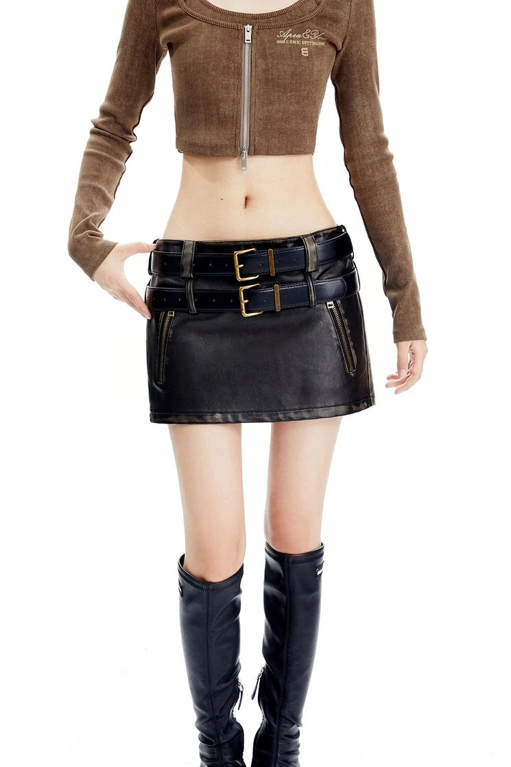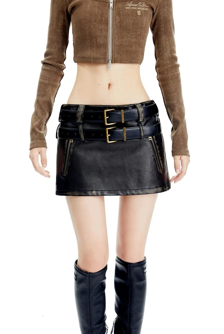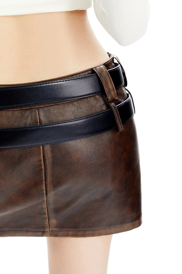Crafted with an eye for detail, this faux leather skirt features a unique faded wash that adds a touch of rebellious charm. The double-belted design not only defines your waist but also injects a dash of punk-rock flair, perfect for making a statement. Its mini length is balanced by a tasteful low-waist cut, ensuring a versatile piece for your wardrobe.