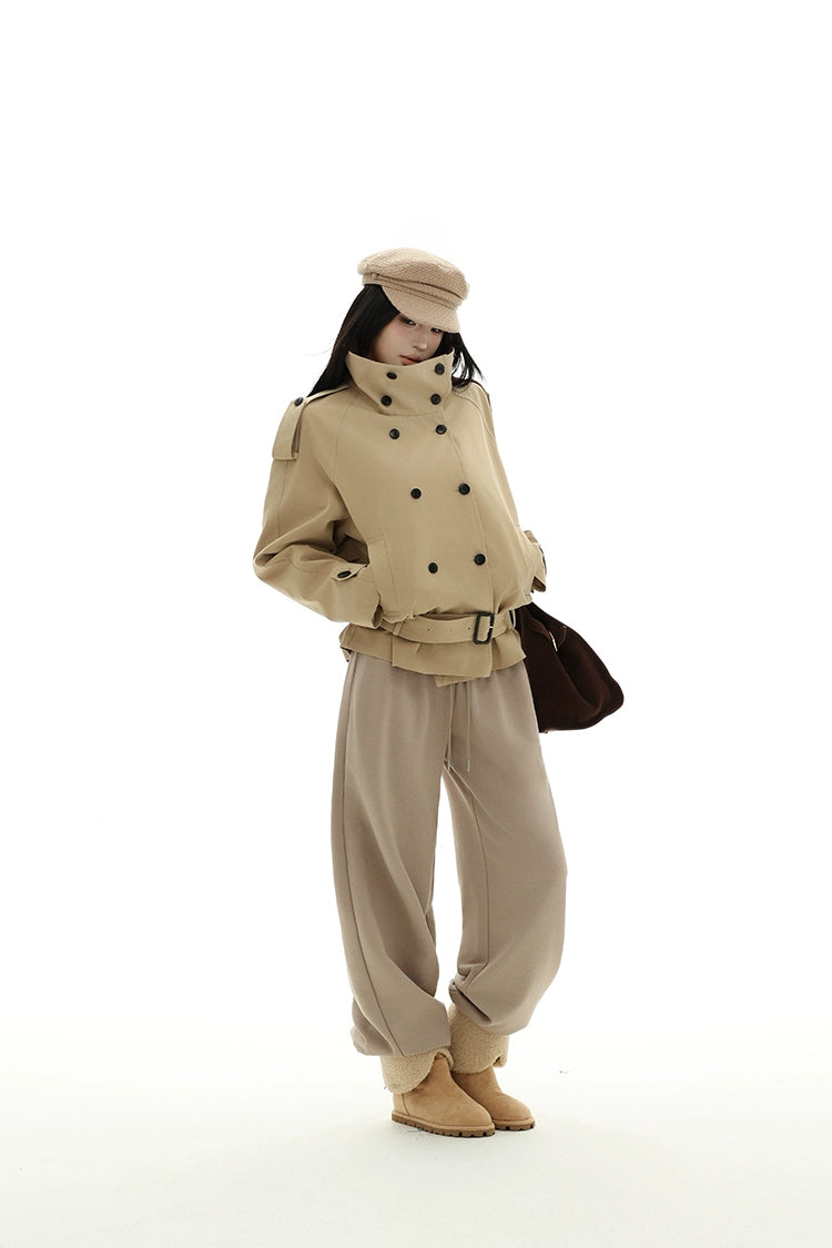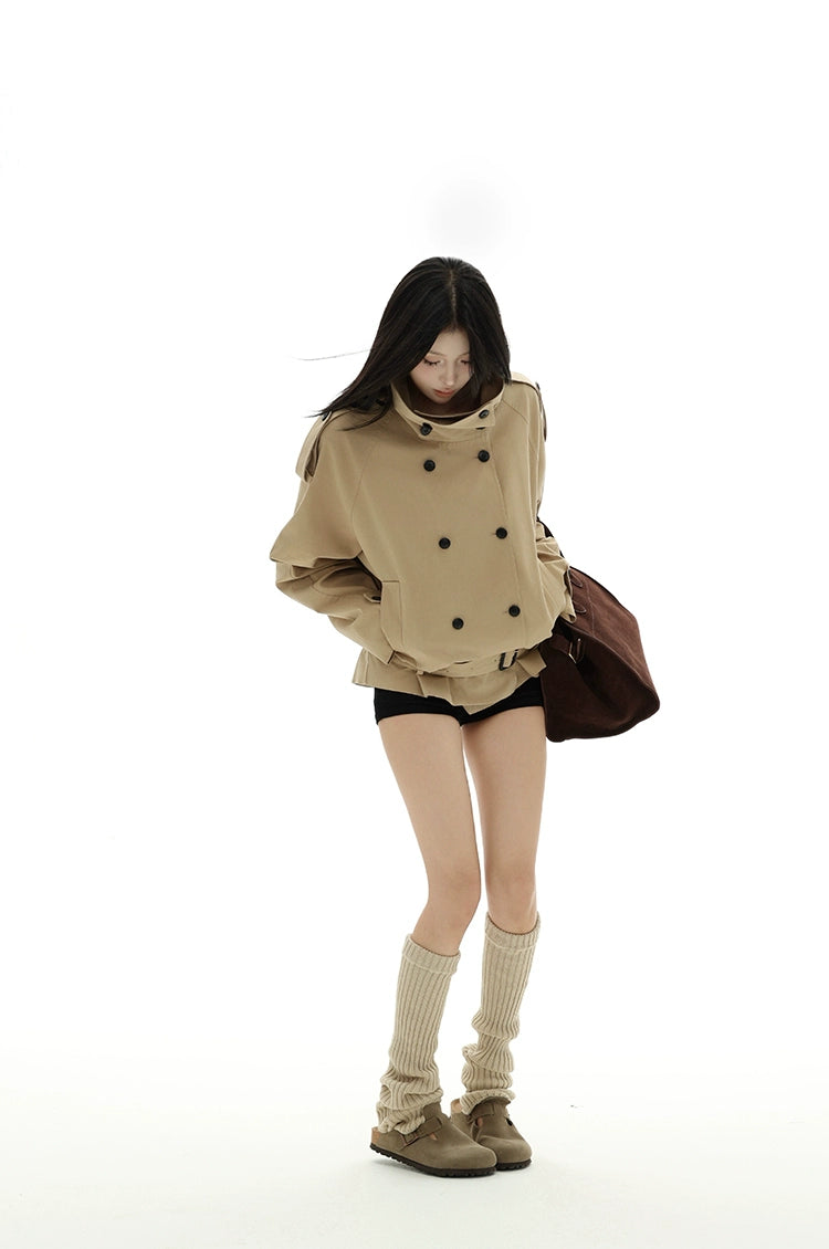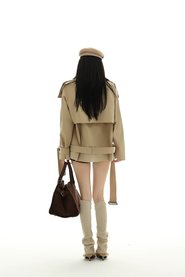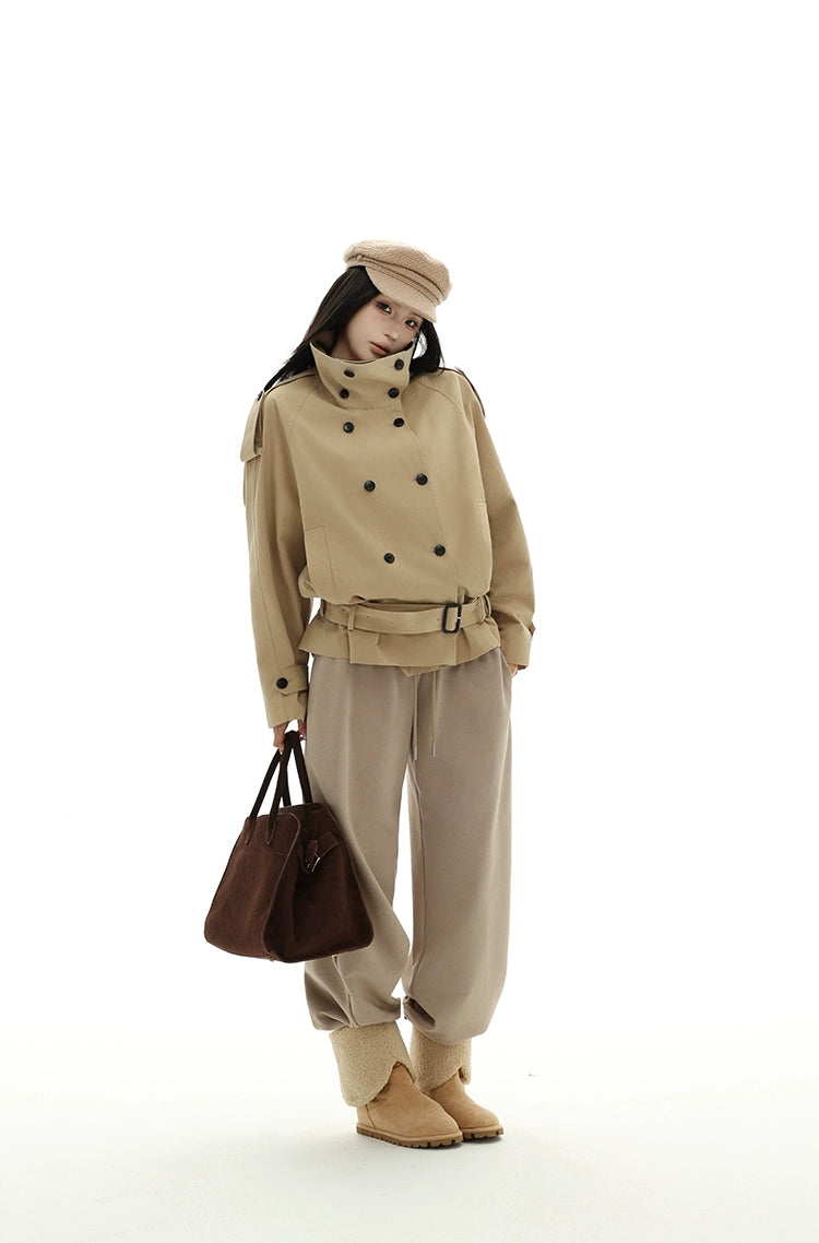 Read full Return PolicyThe Double-Breasted Belted High Collar Short Trench Jacket brings a sleek edge to a timeless classic.